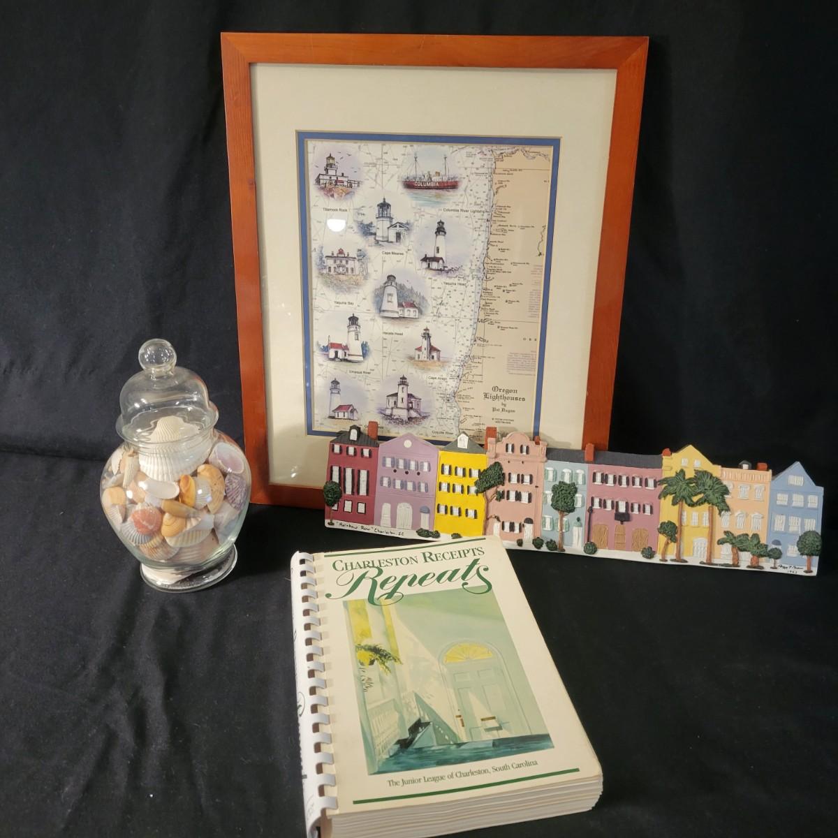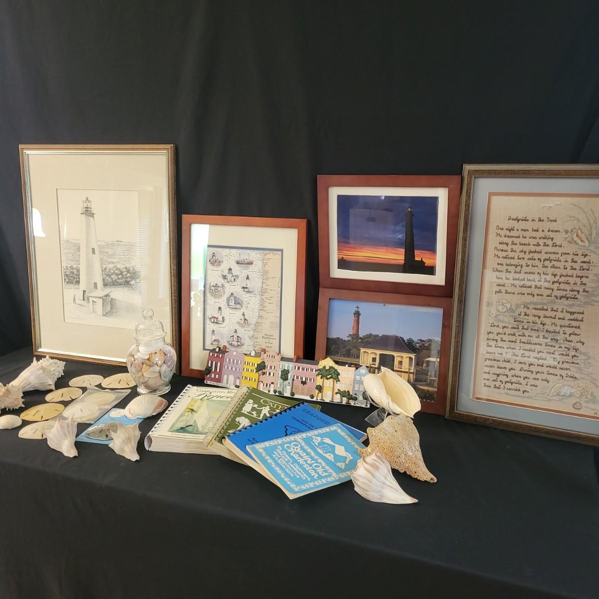 Love the beach? This lot features an assortment of unique shells, art and books. Included is a collection of seashells and sand dollars, mutliple framed prints of lighthouses and multiple books on Charleston and low country recipes. Also included is a unique plaster relief of Rainbow Row. Largest framed print measures approximately 17.5" x 21.5" x 1" Shipping available. Shipping Art can be costly please call UPS store at 828-252-6930 for quote