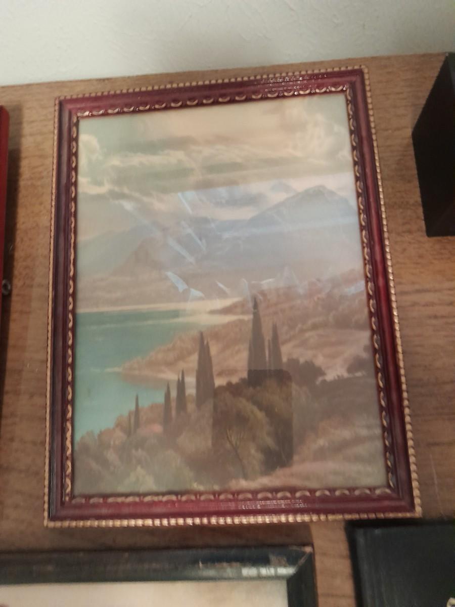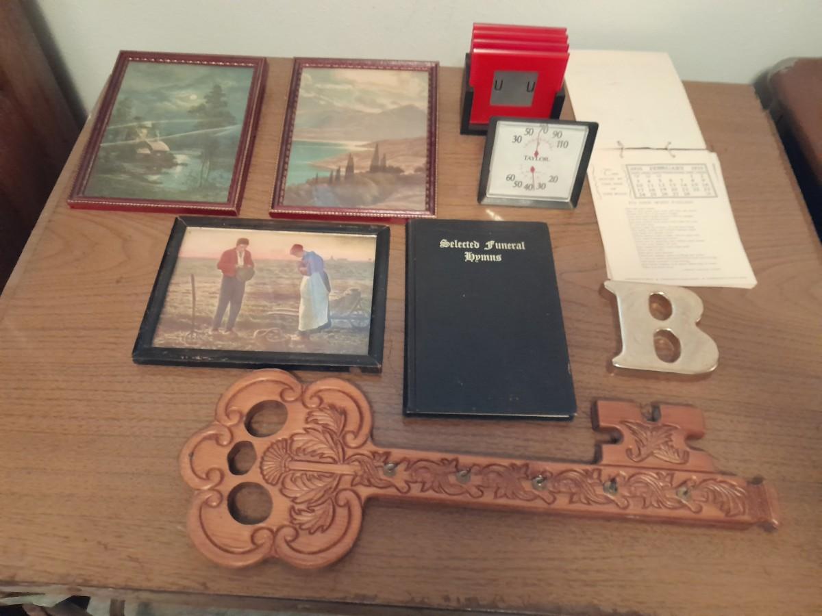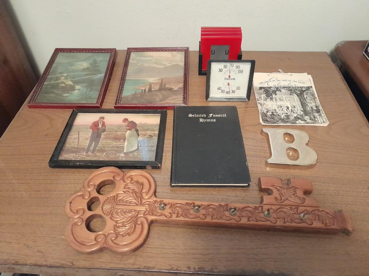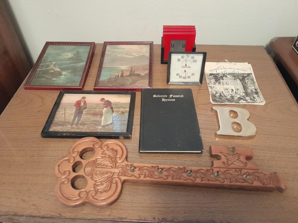 ASSORTMENT OF FRAMED PICTURES, WOODEN KEY RACK, VINTAGE CALENDAR AND MORE