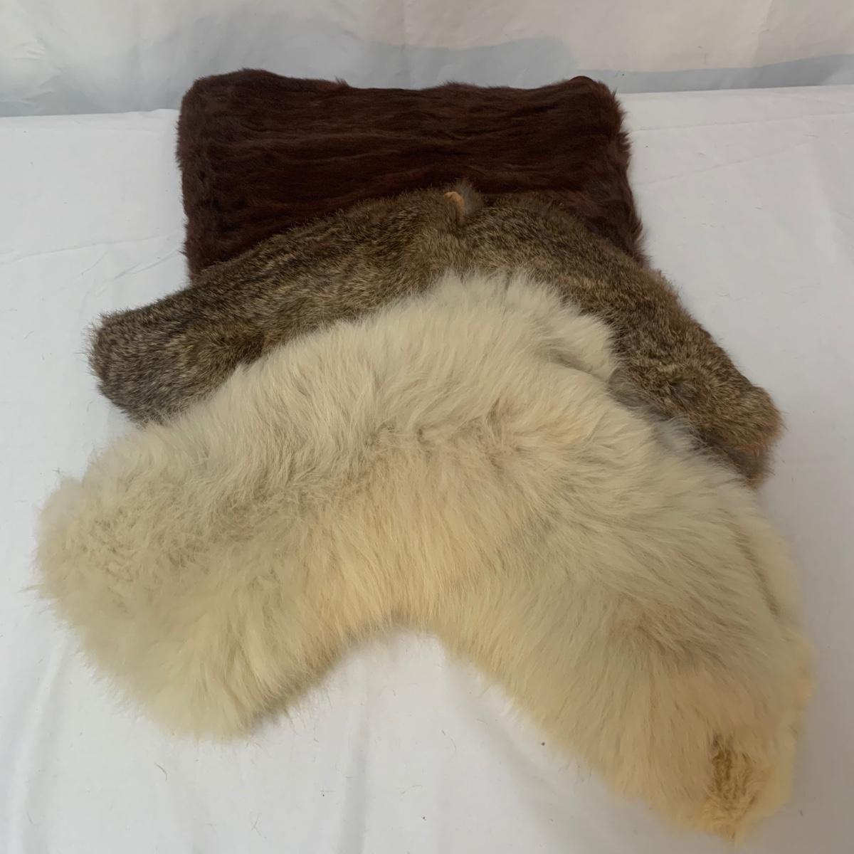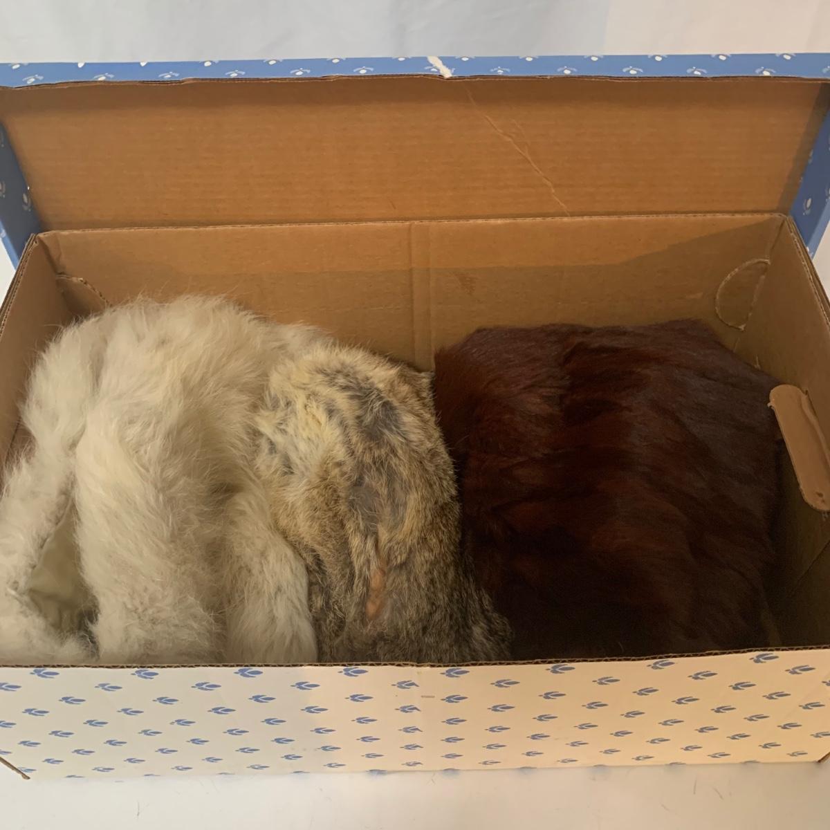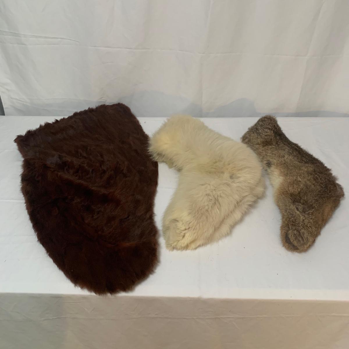 This lot includes three fur shoulder shawls with silk-like backing. Fur is in good condition, but will likely require a bit of cleaning due to storage.