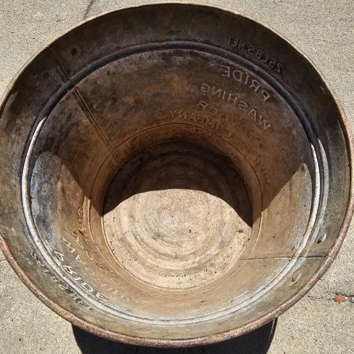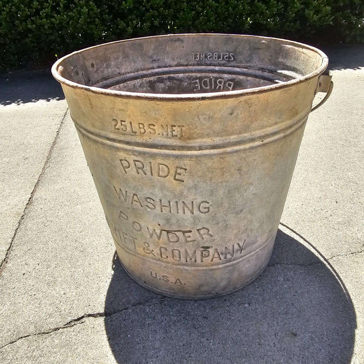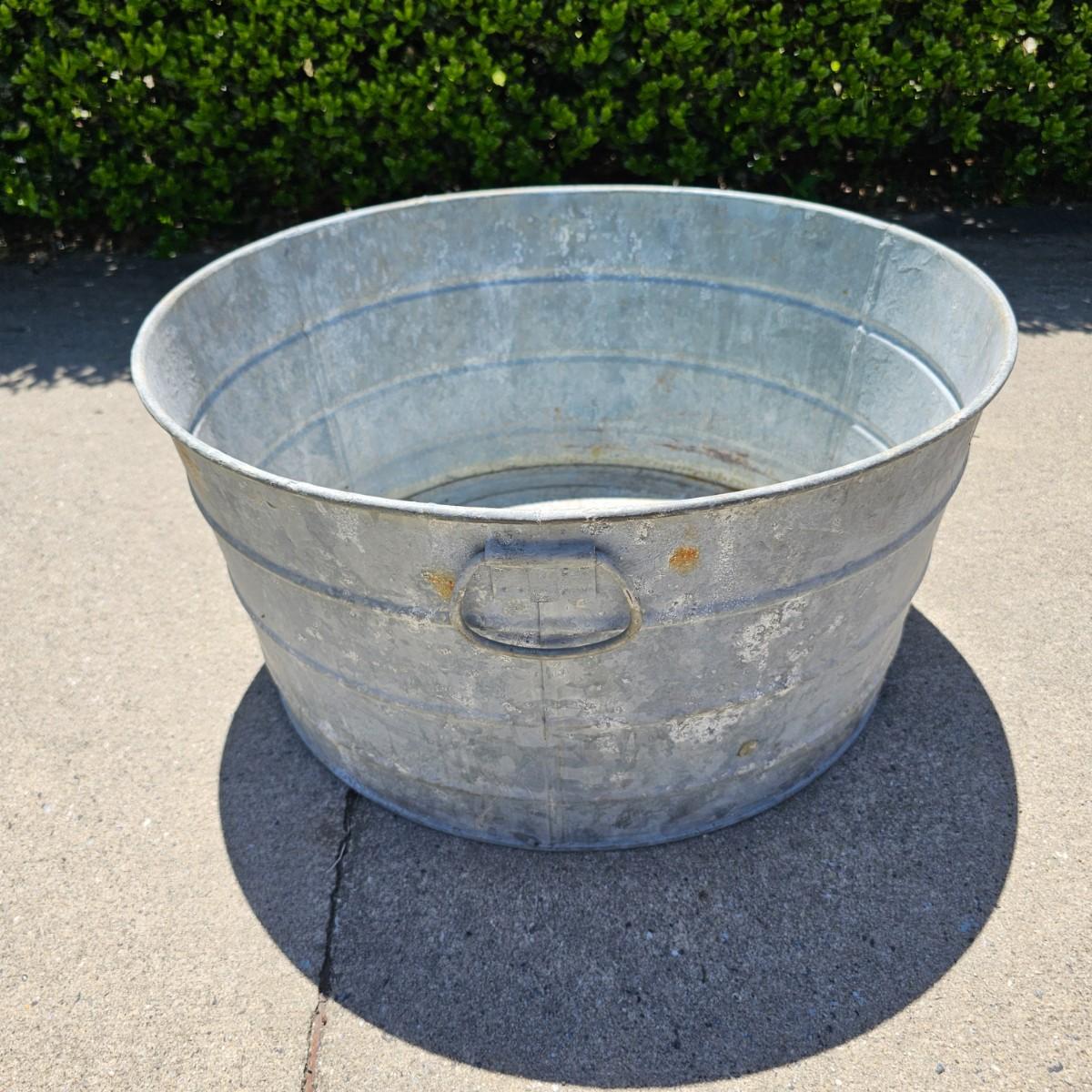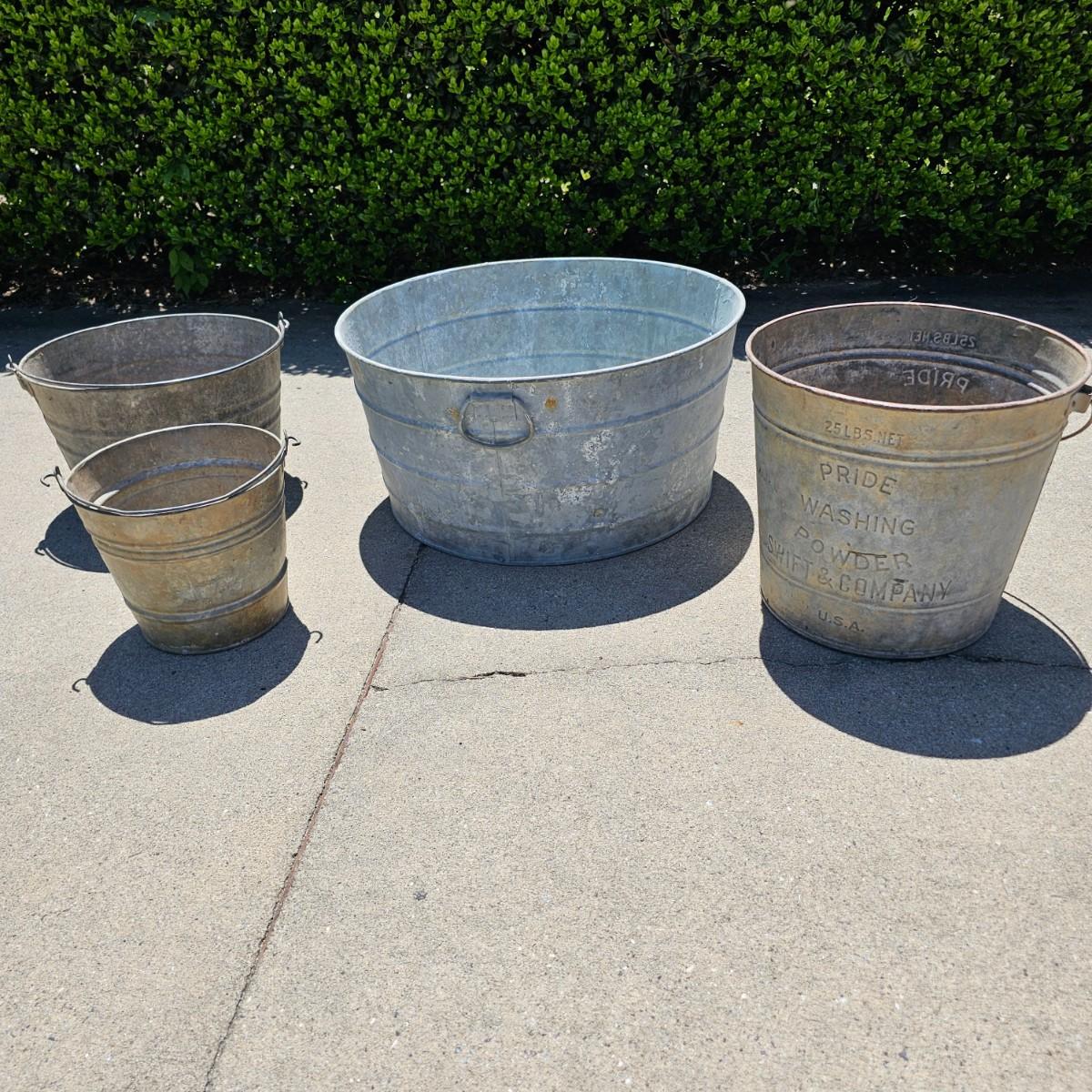 Four galvanized tubs/buckets, all with handles. Largest wash tub measures 22.5"D x 11"H, has side handles. Smallest bucket is 9.75"D x 8.5"H, has top bail as do other two Buckets. One bucket was Pride Washing Powder product originally. One bucket has some holes near bottom edge. See photos for details. Local pickup only.