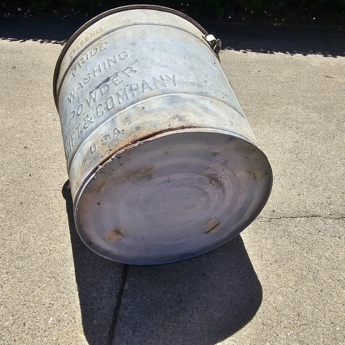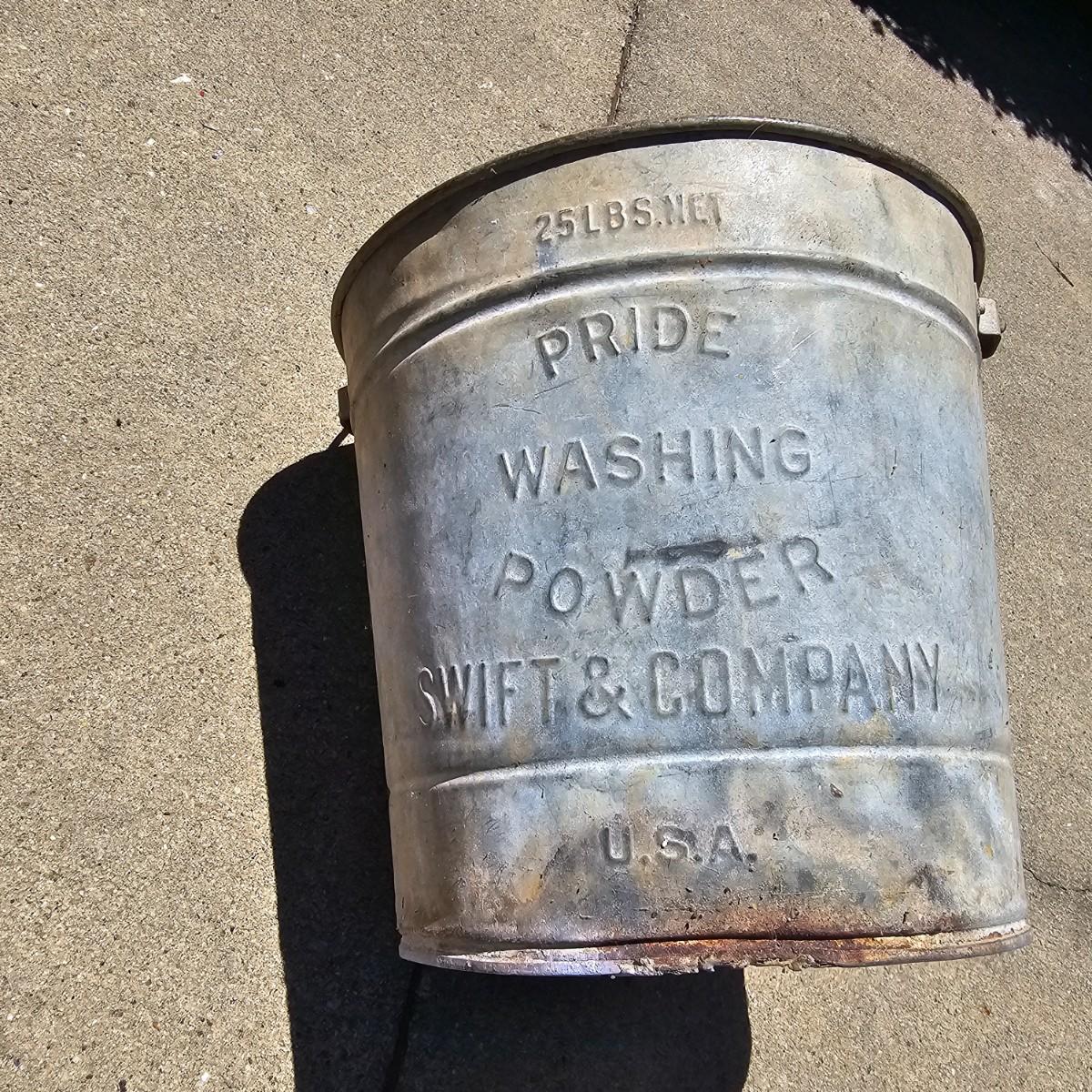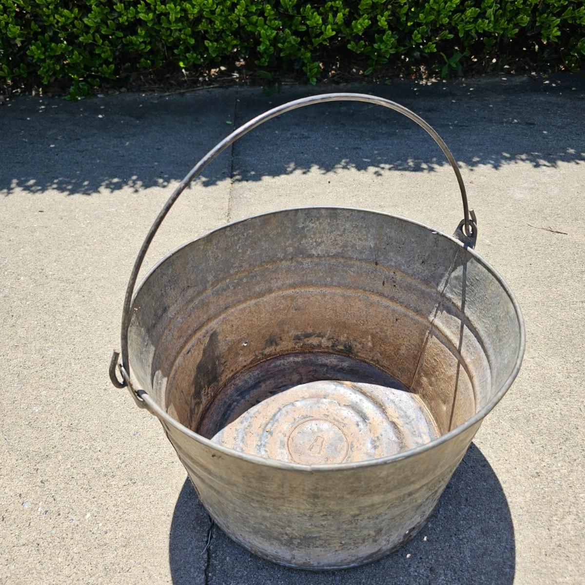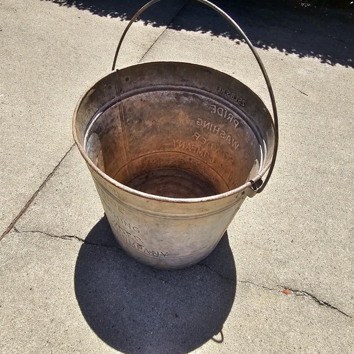 Four galvanized tubs/buckets, all with handles. Largest wash tub measures 22.5"D x 11"H, has side handles. Smallest bucket is 9.75"D x 8.5"H, has top bail as do other two Buckets. One bucket was Pride Washing Powder product originally. One bucket has some holes near bottom edge. See photos for details. Local pickup only.
