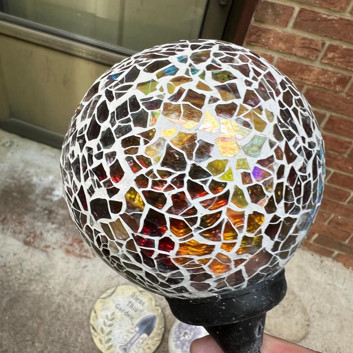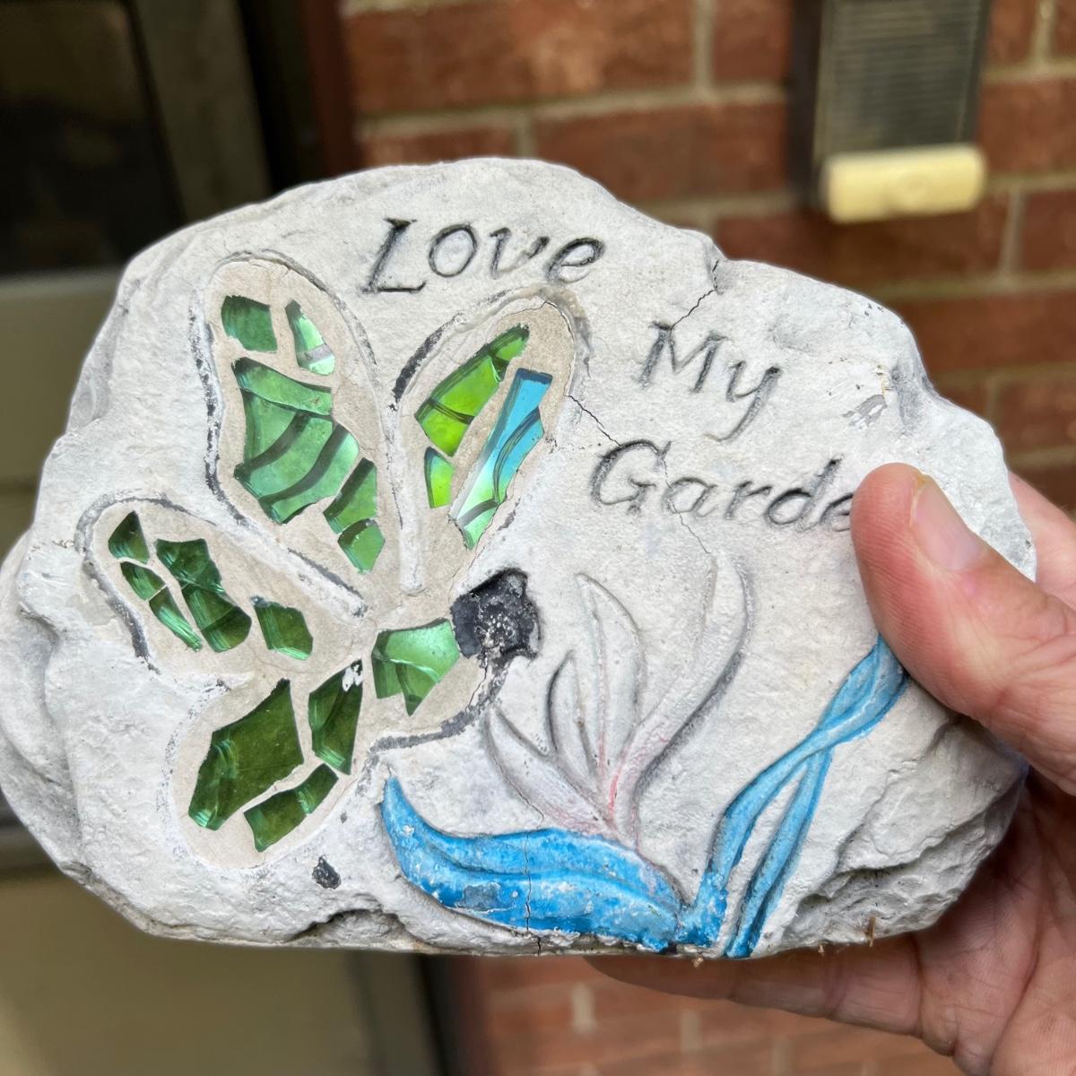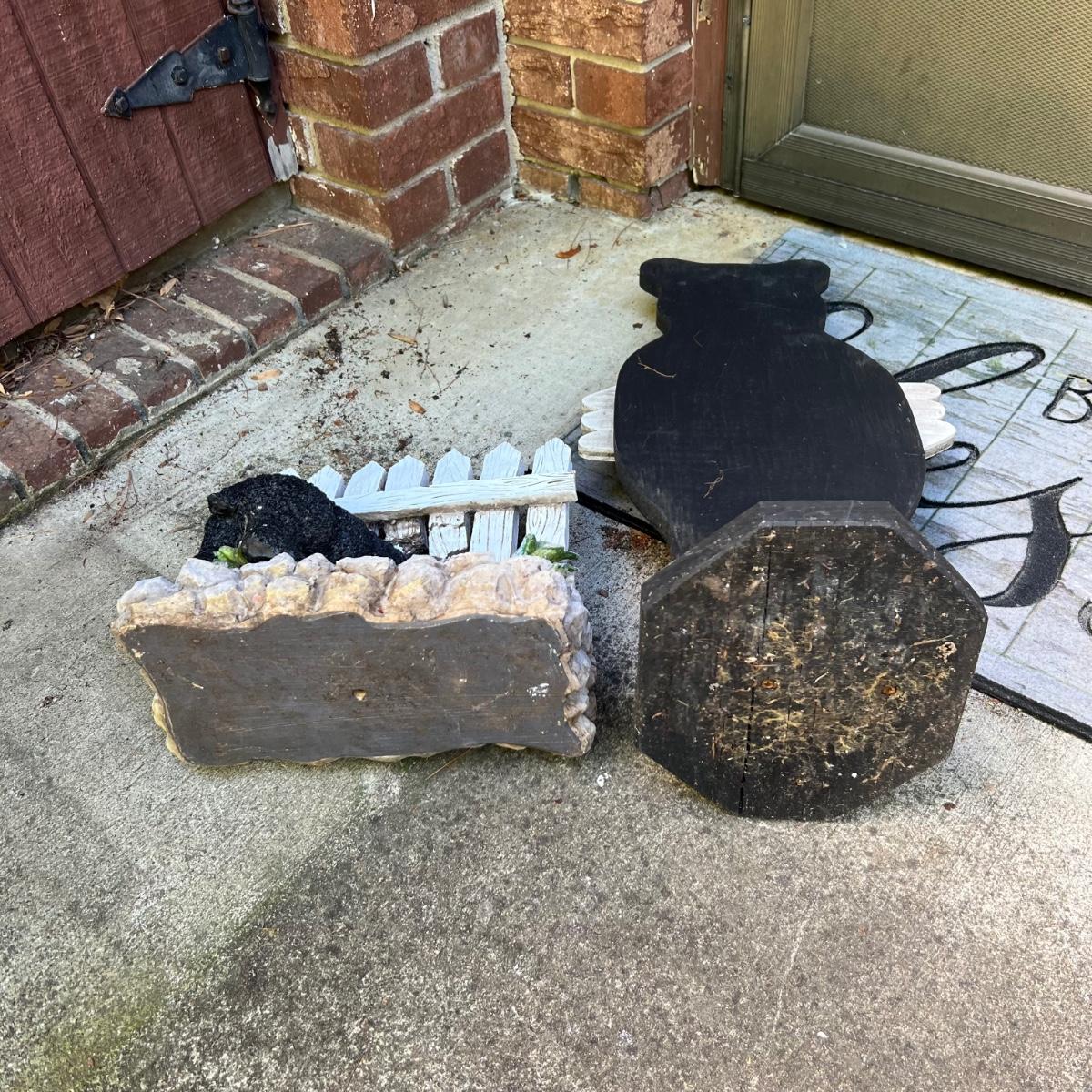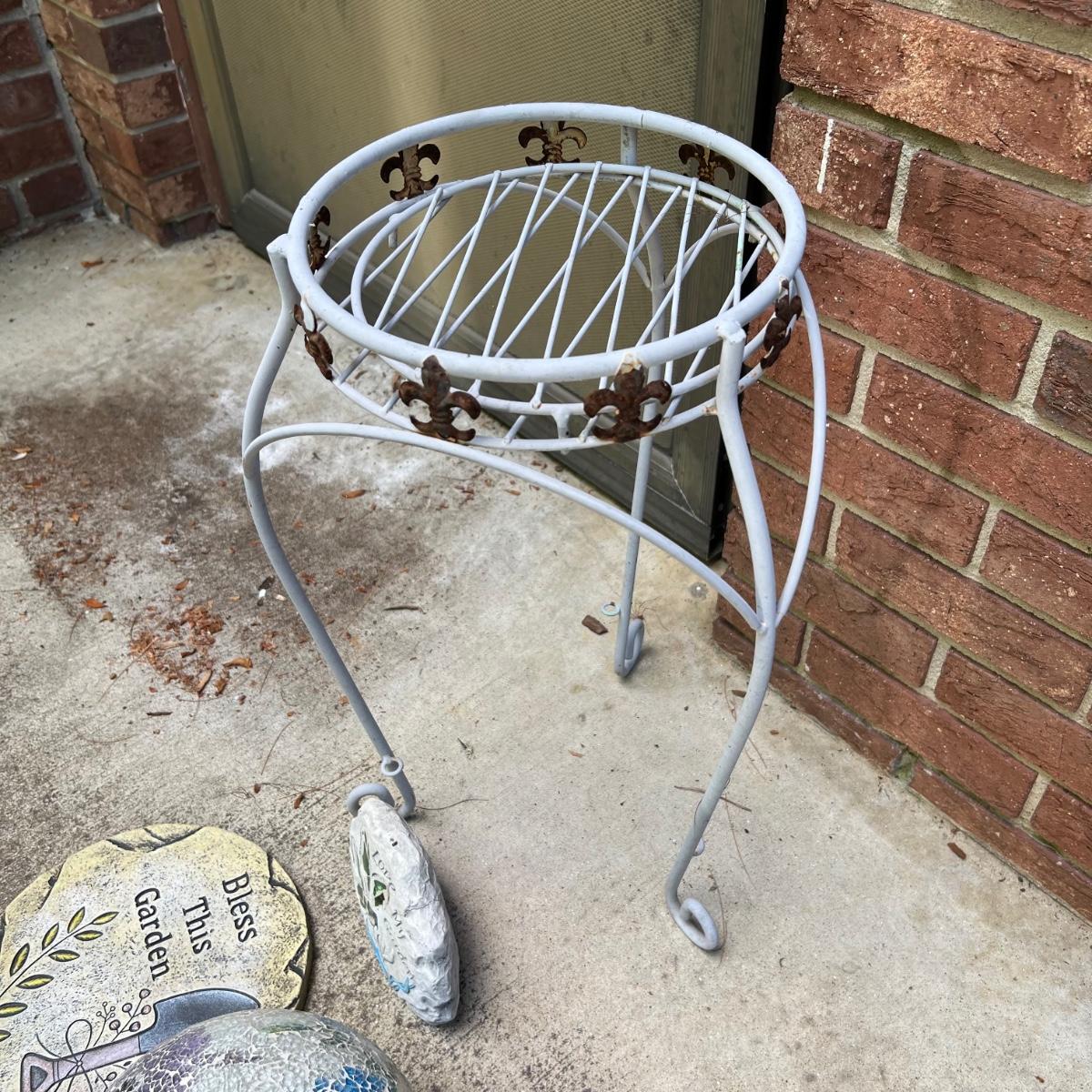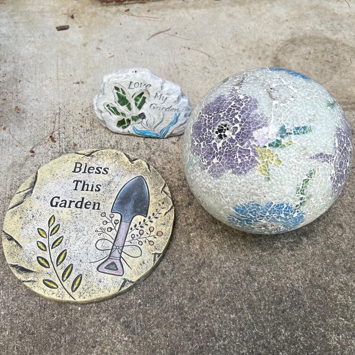 15 plus items of garden decor includes a wooden Welcome Bear statue that measures 8” x 20” x 23”H. The white metal plant stand has some rust. Stepping stones are a plastic material. Please note that the globe does not have a stand and the solar lights have not been tested.