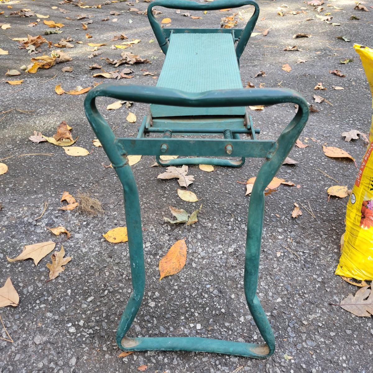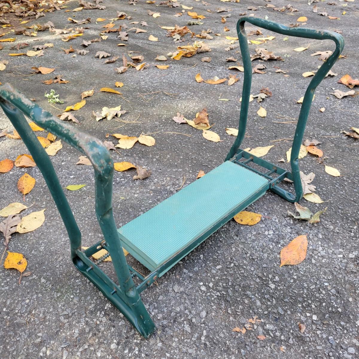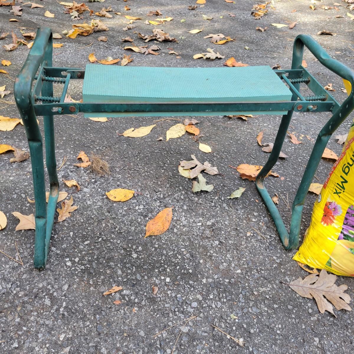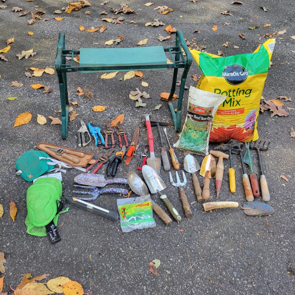 A large assortment of gardening tools and supplies that includes knee pads, snips, loppers, trowels, alabaster stone pieces, an unopened bag of Miracle“¢Gro potting soil and more. The garden seat/kneeling pad measures approximately 23.5" x 11" x 19"H. Local pickup only