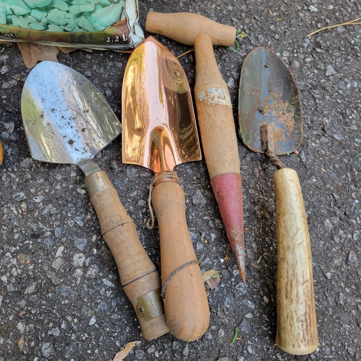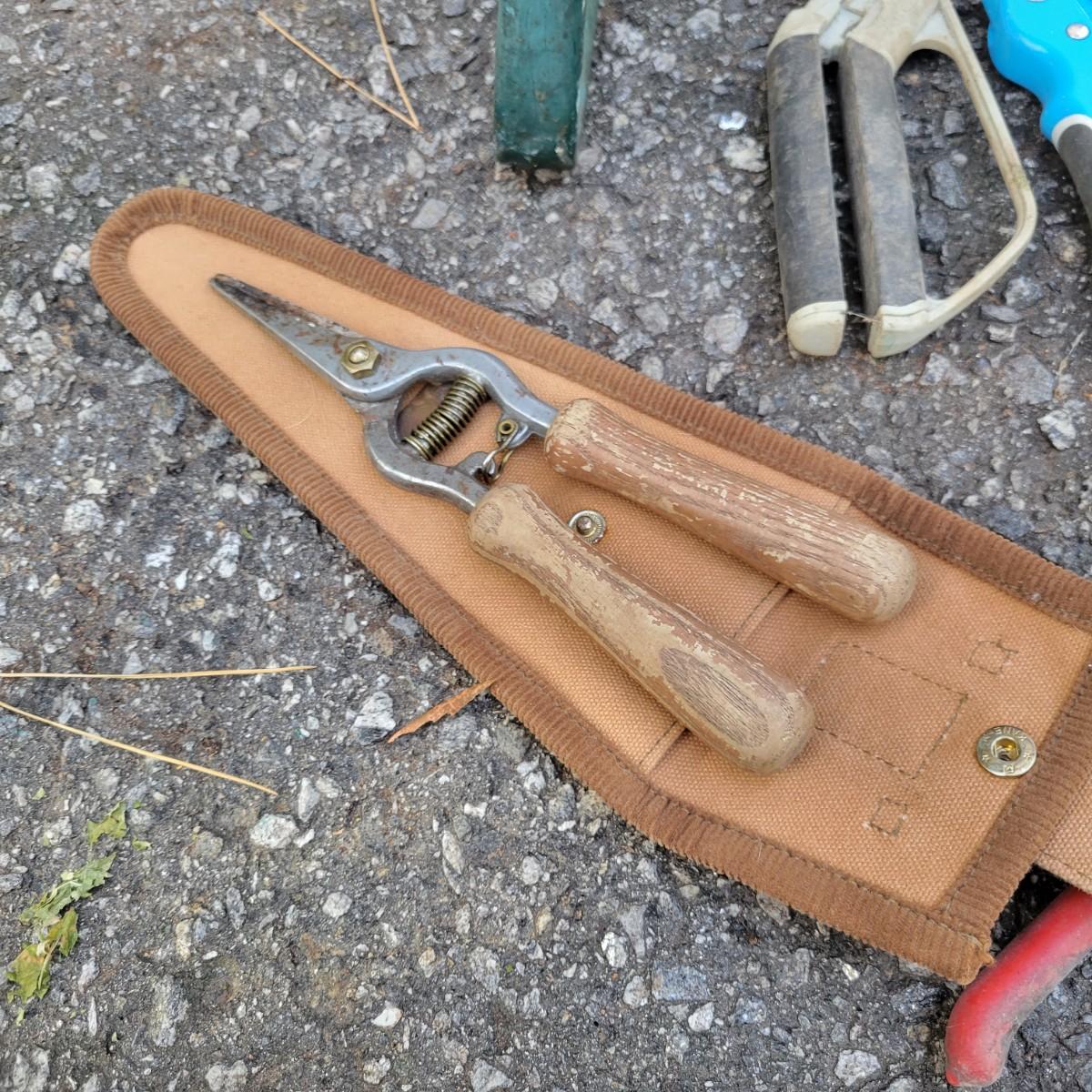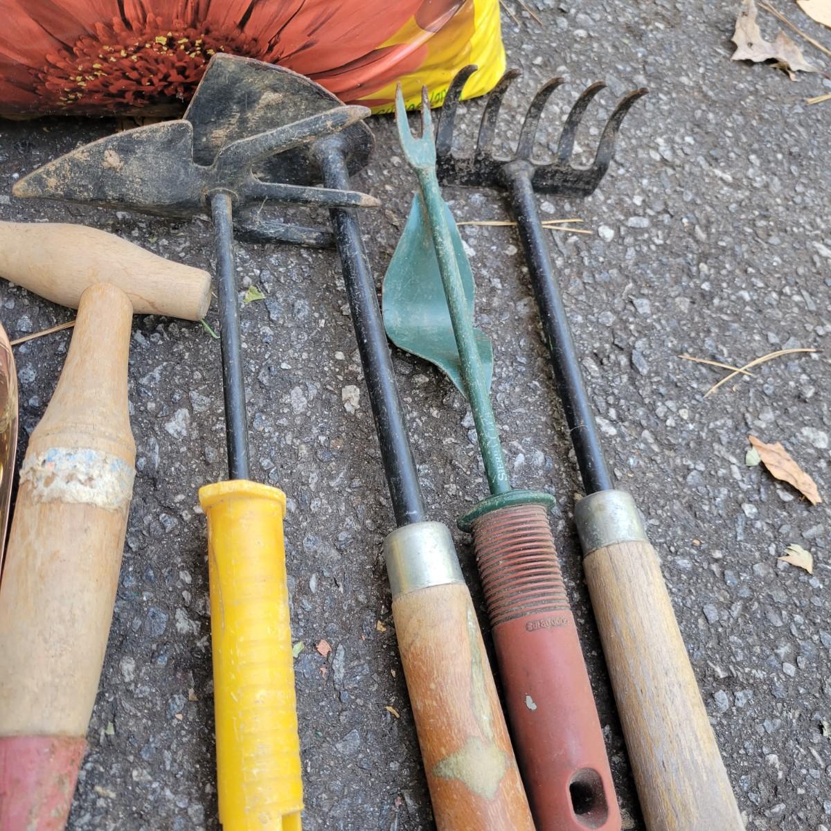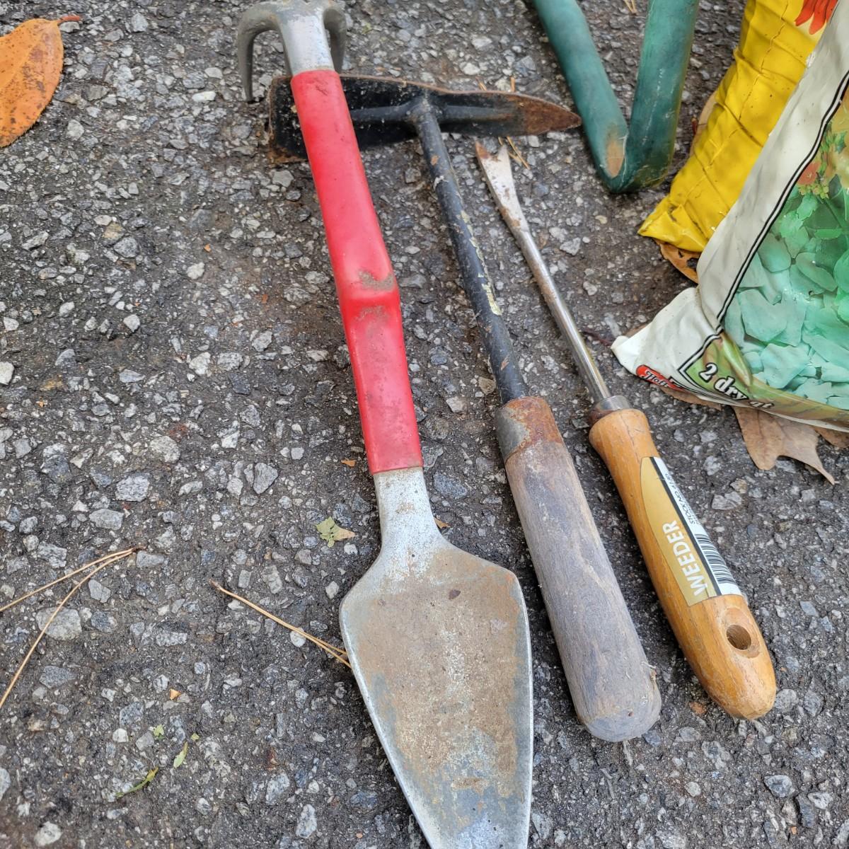 A large assortment of gardening tools and supplies that includes knee pads, snips, loppers, trowels, alabaster stone pieces, an unopened bag of Miracle“¢Gro potting soil and more. The garden seat/kneeling pad measures approximately 23.5" x 11" x 19"H. Local pickup only