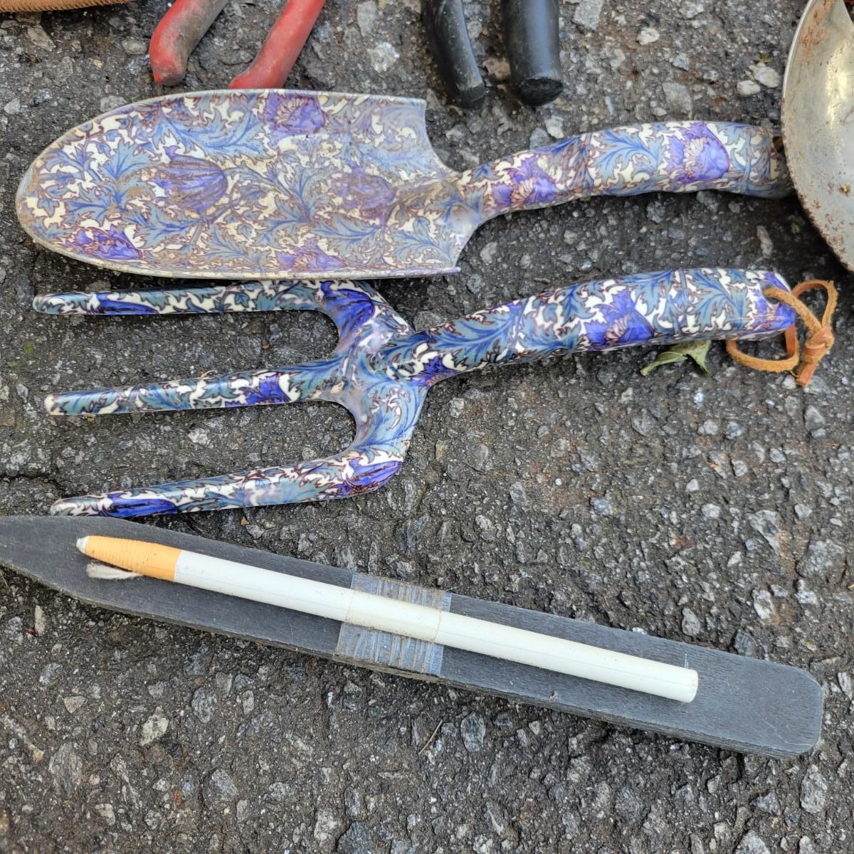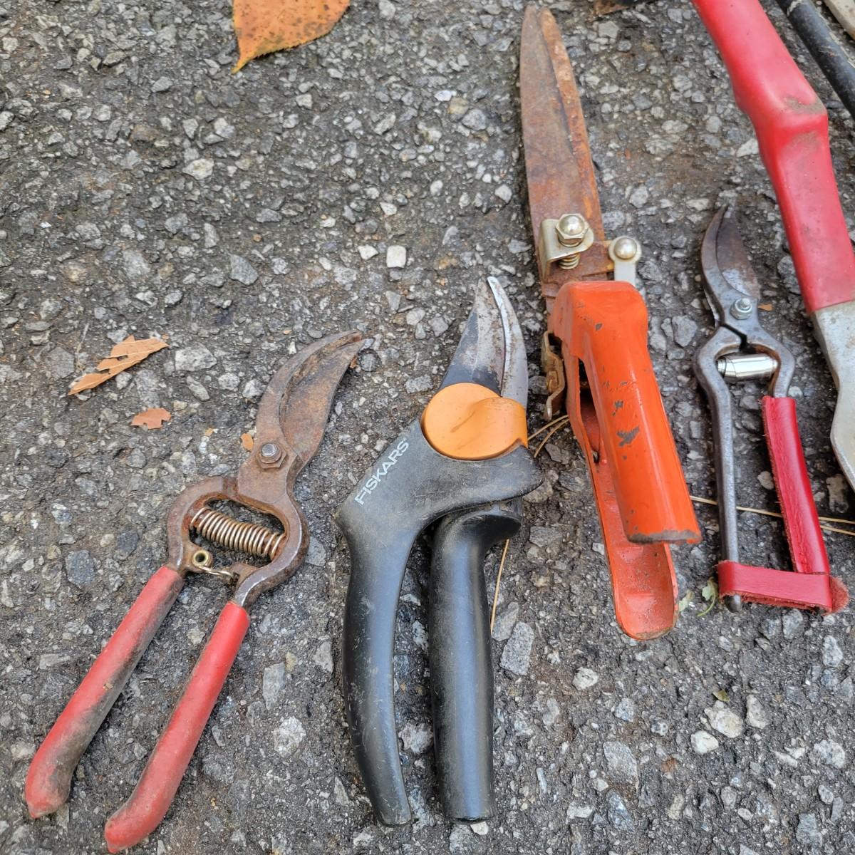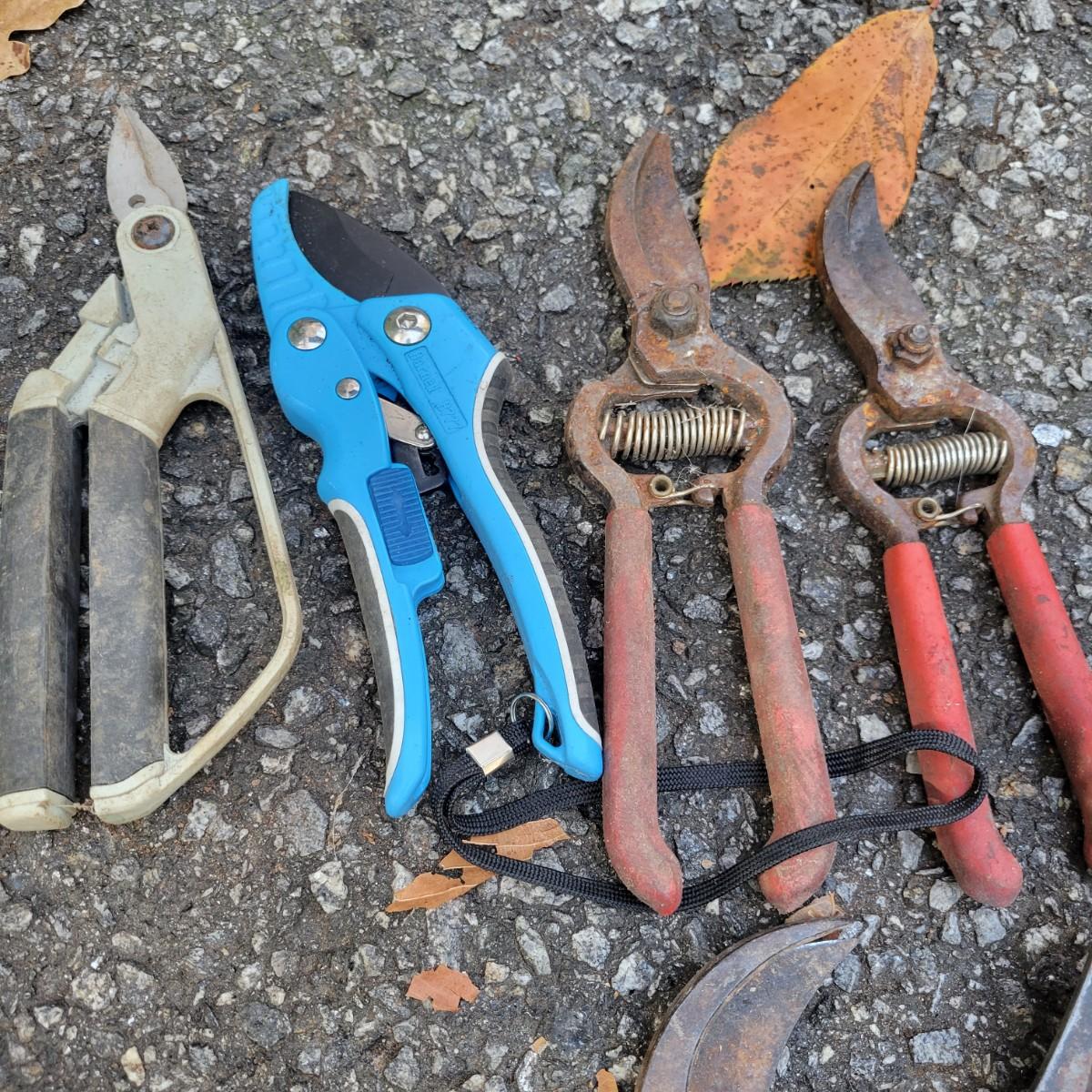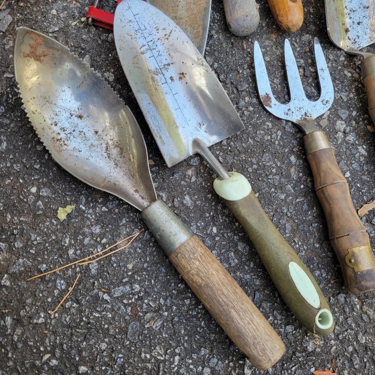 A large assortment of gardening tools and supplies that includes knee pads, snips, loppers, trowels, alabaster stone pieces, an unopened bag of Miracle“¢Gro potting soil and more. The garden seat/kneeling pad measures approximately 23.5" x 11" x 19"H. Local pickup only