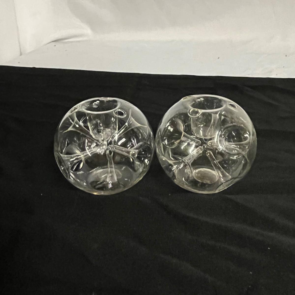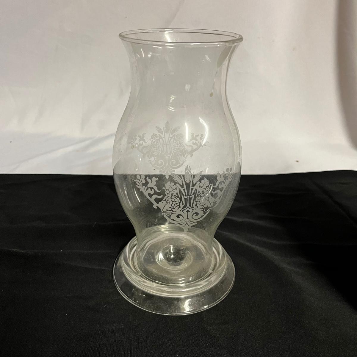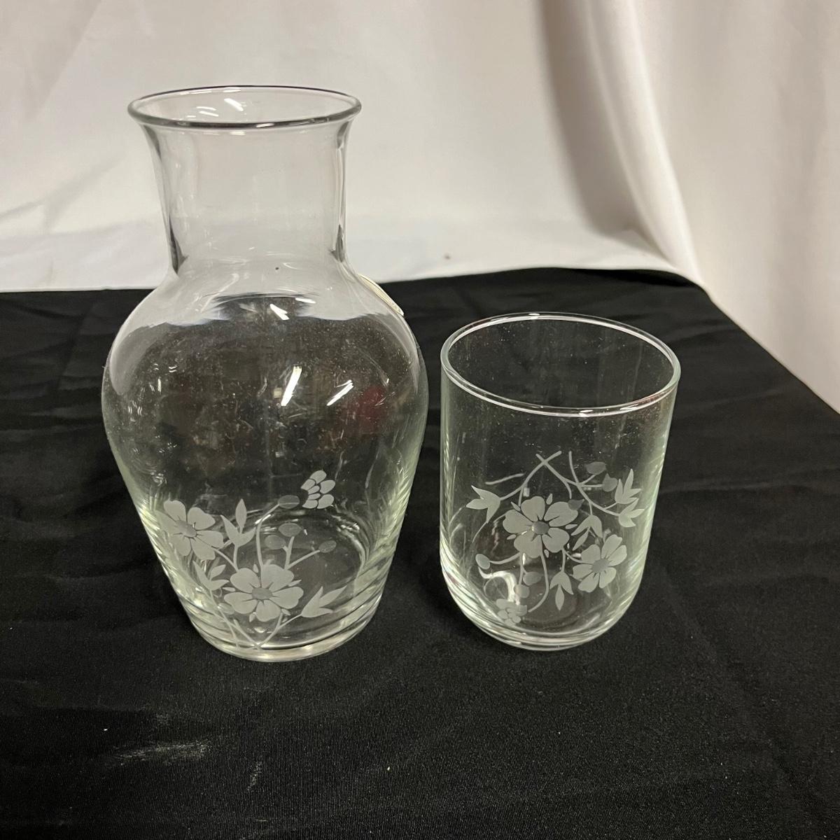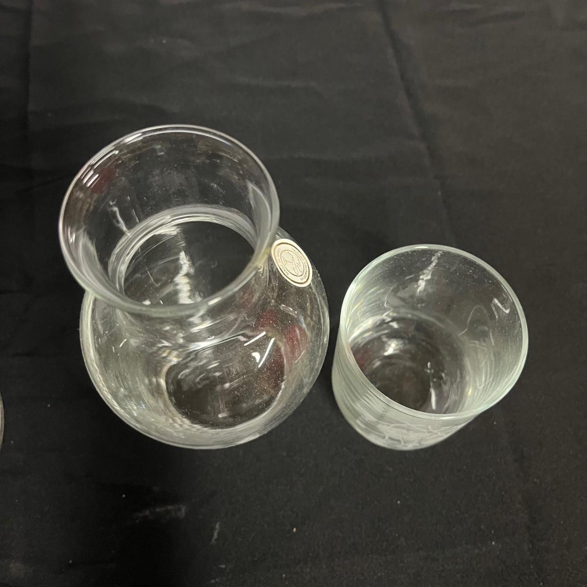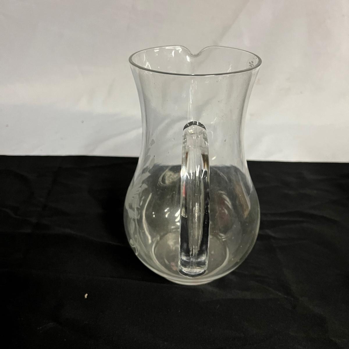 Lot includes two hand blown glass globe candle holders, etched glass pitcher, tumbler and carafe, four footed ramekins two candleholders, footed bowl and more. Pitcher measures 5”D x 8” tall without handle.