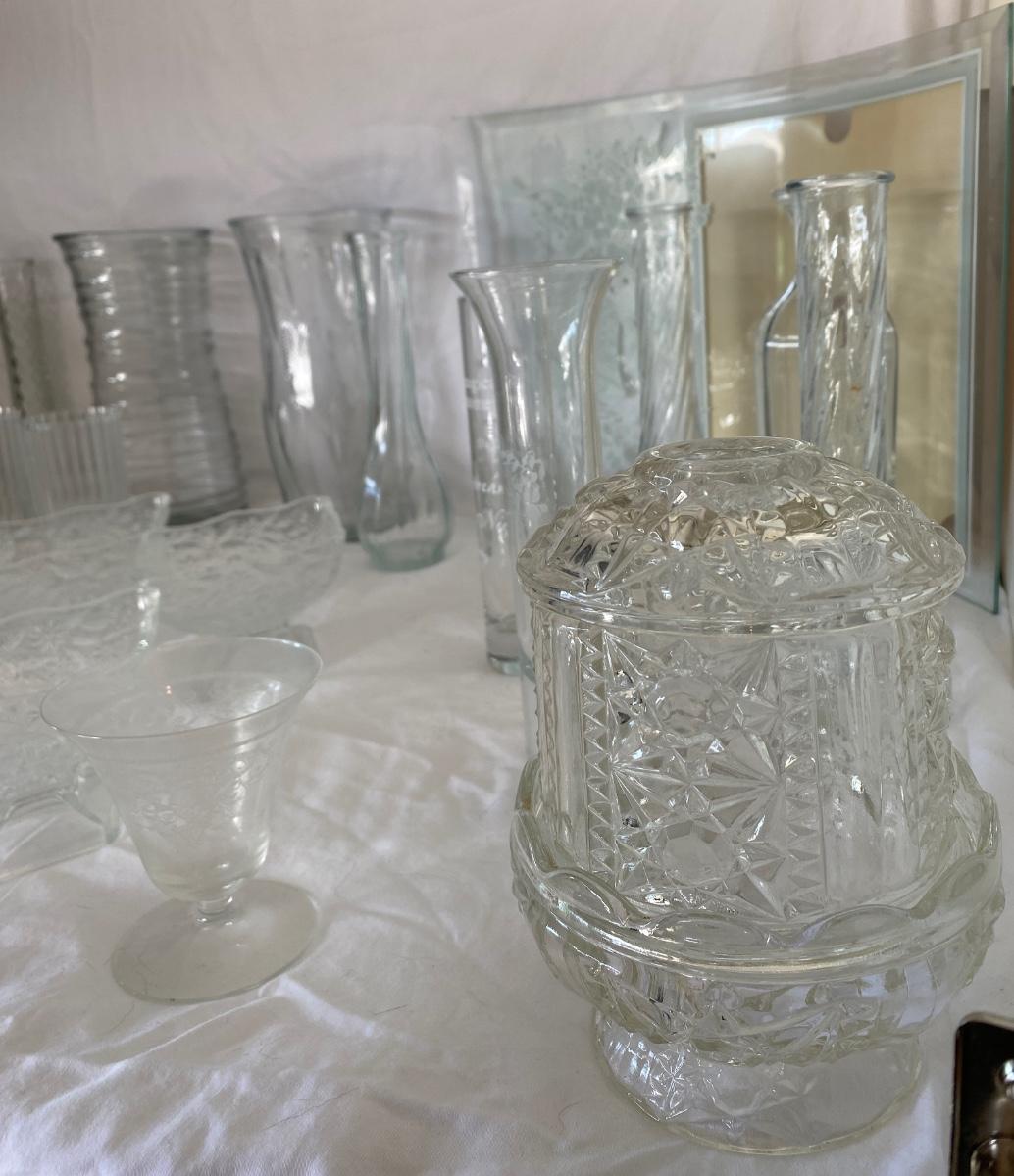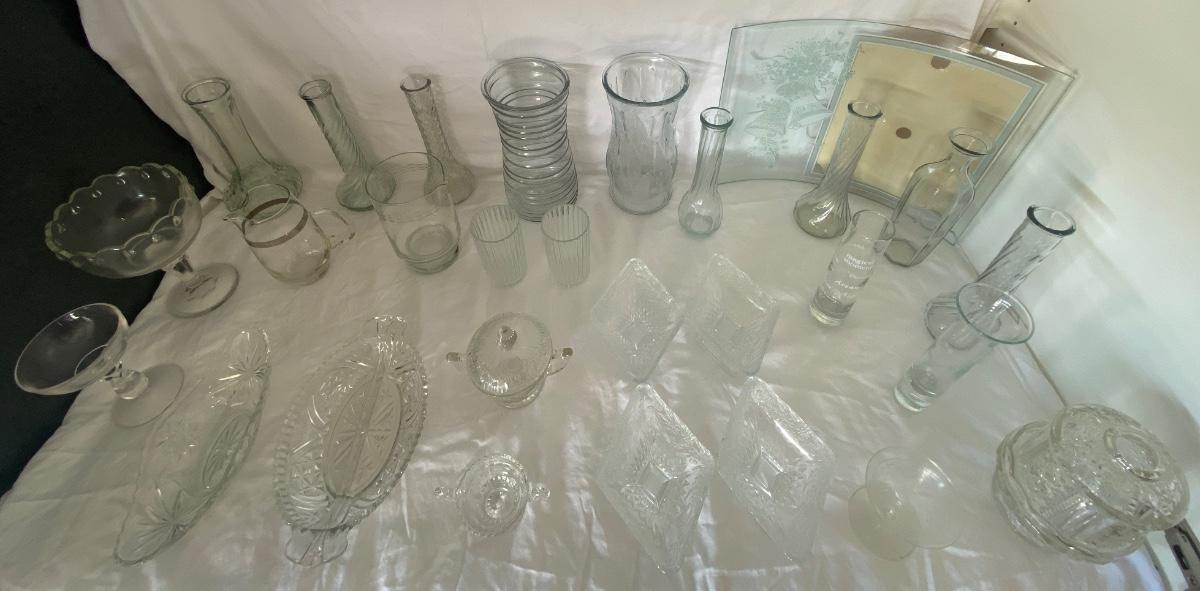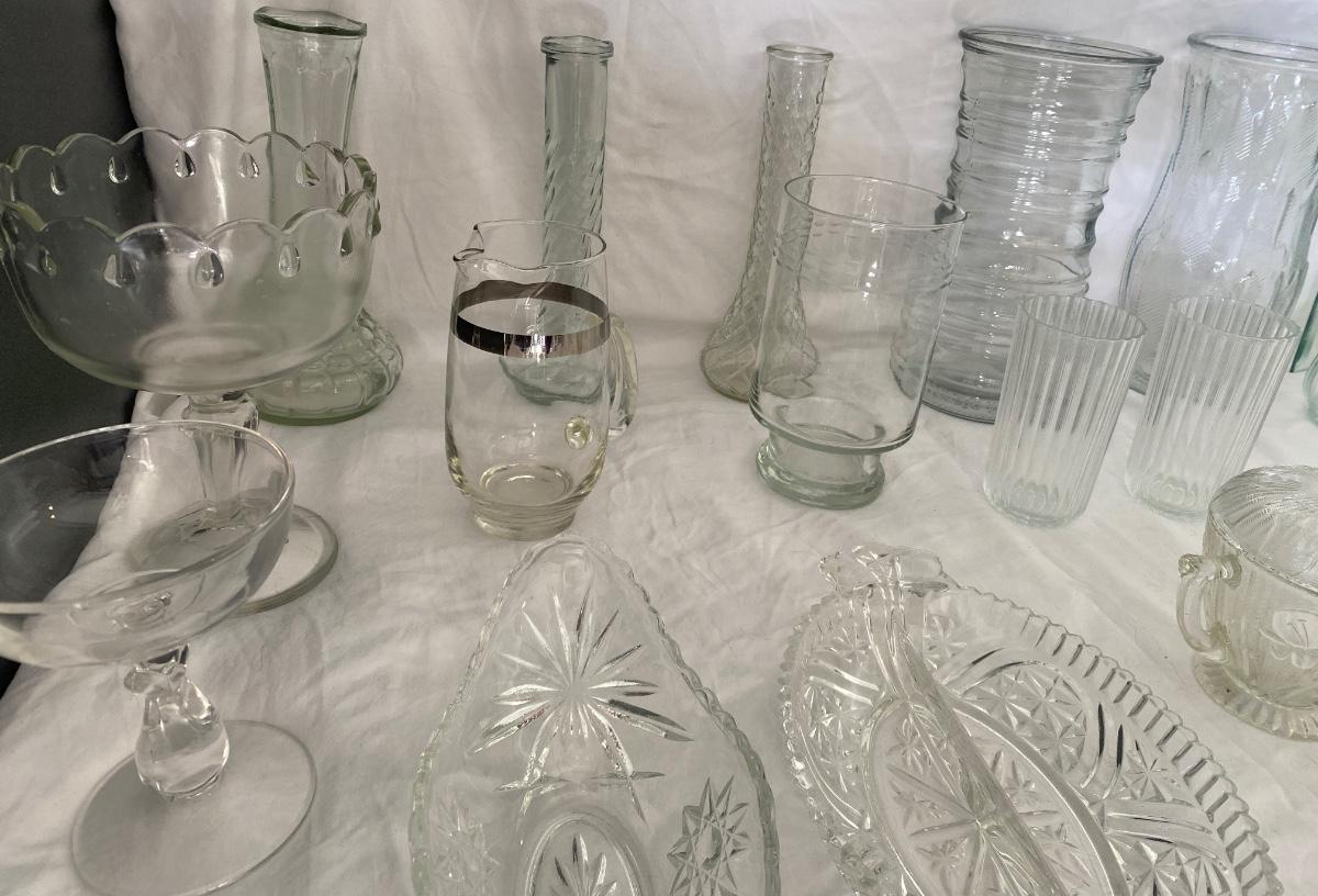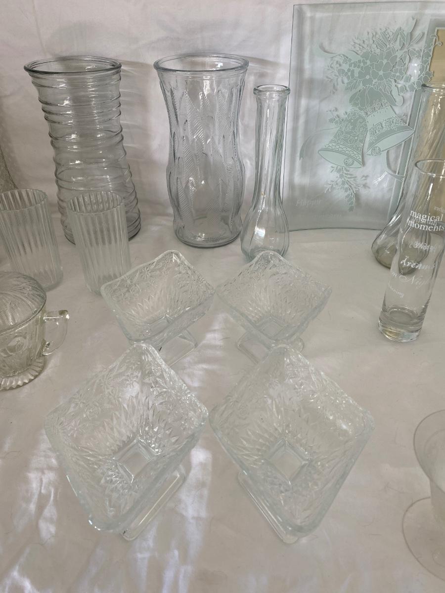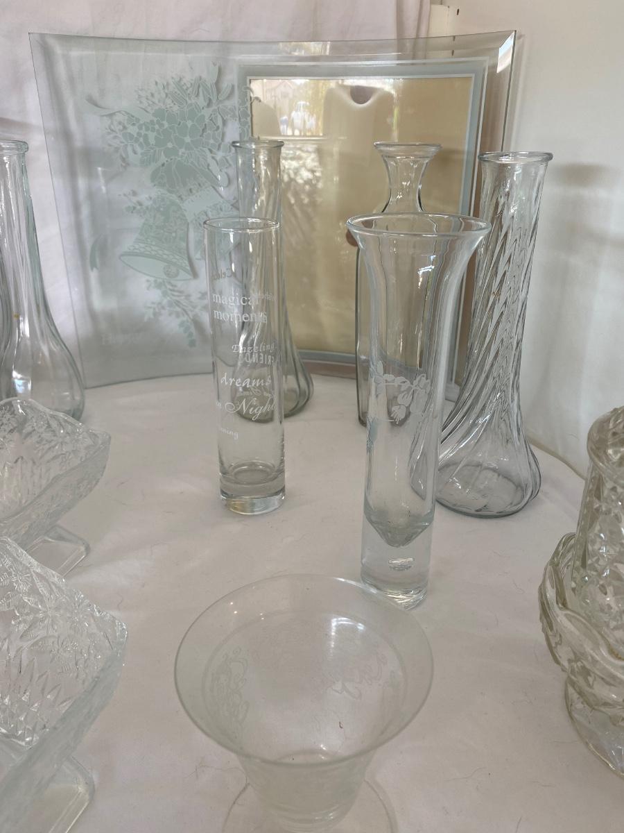 Assortment of glass/crystal. Vases are collectibles including: Hoosier glass, Brody glass, Syndicate Sales Inc., two unknown marked glass vases, and “Italy.” Back right item is a “Happy Anniversary” picture frame. All preowned and sold as is