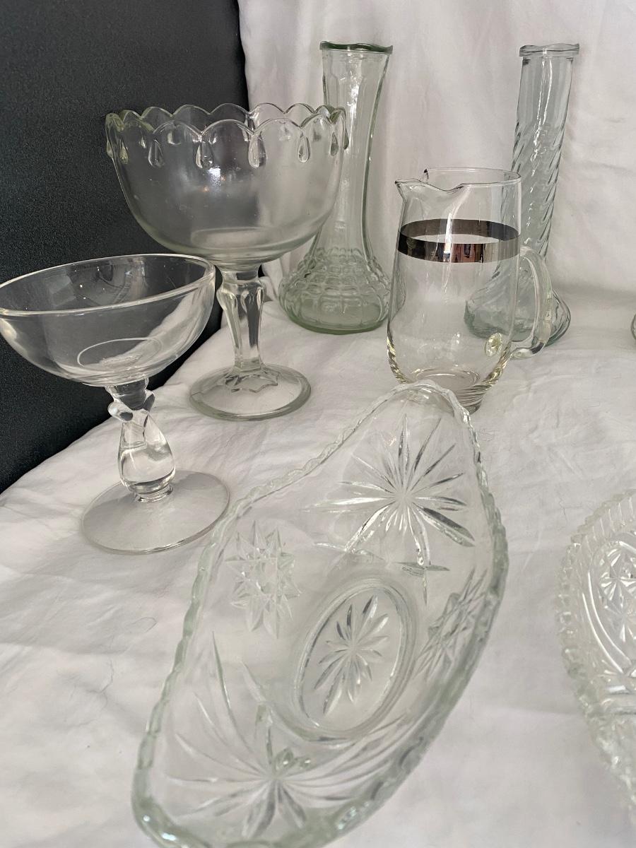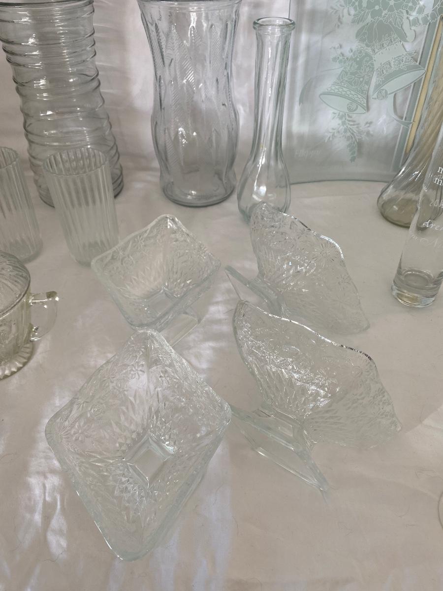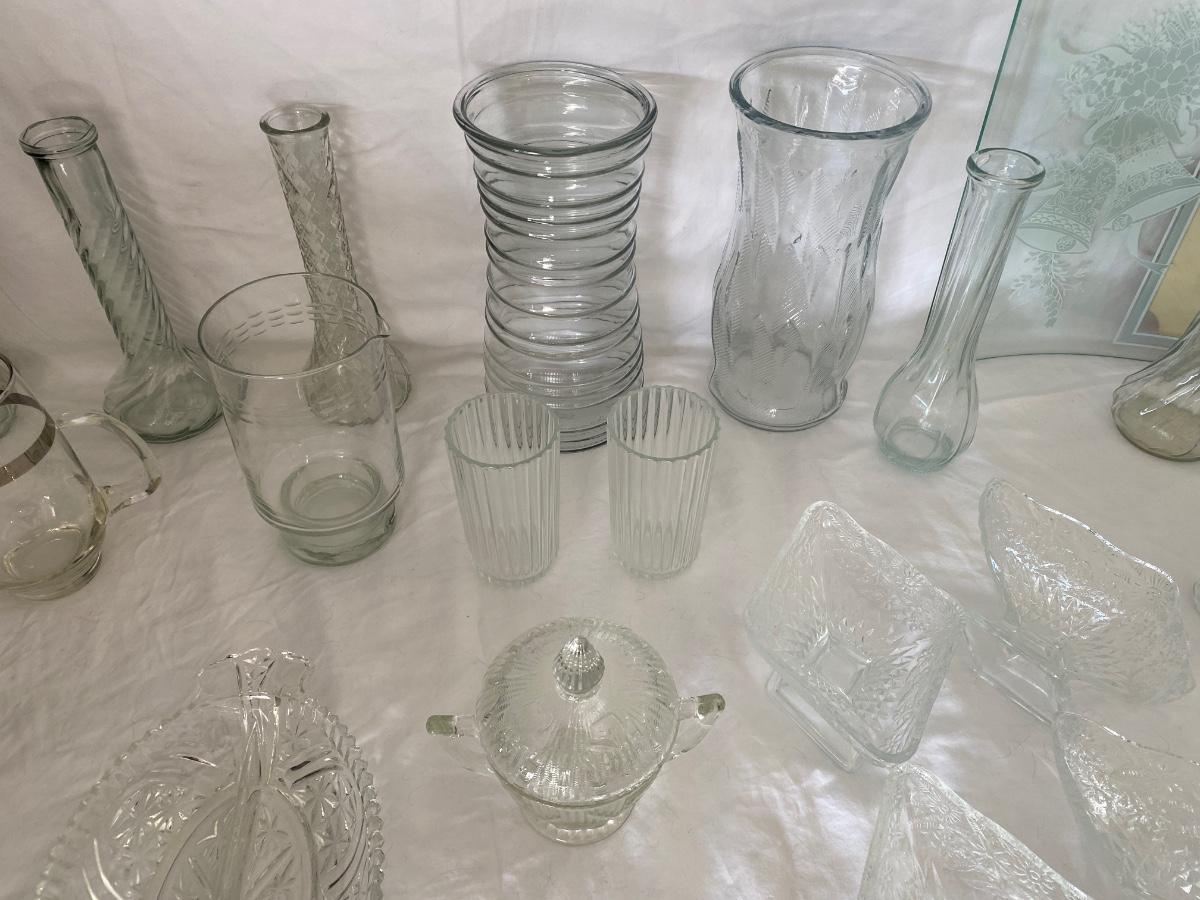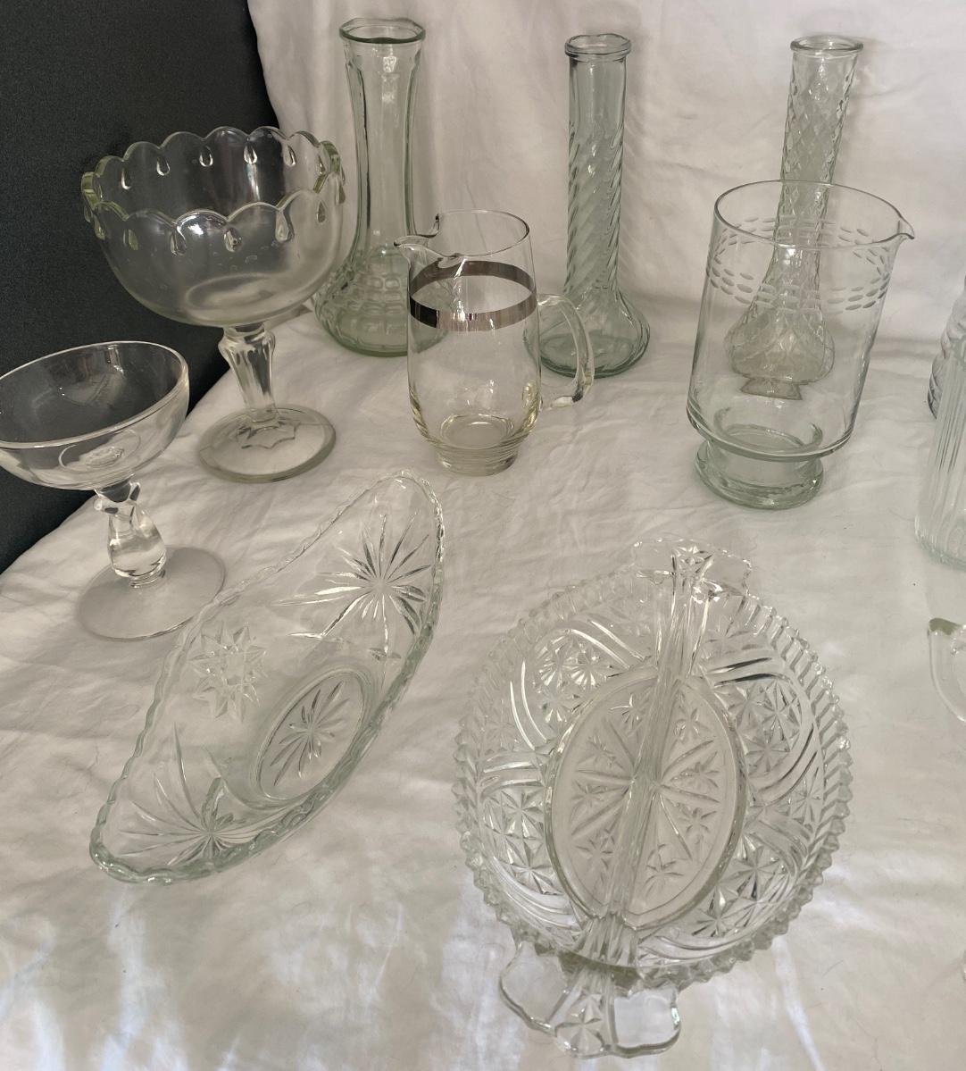 Assortment of glass/crystal. Vases are collectibles including: Hoosier glass, Brody glass, Syndicate Sales Inc., two unknown marked glass vases, and “Italy.” Back right item is a “Happy Anniversary” picture frame. All preowned and sold as is
