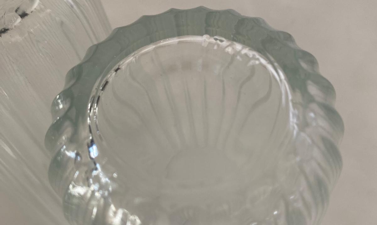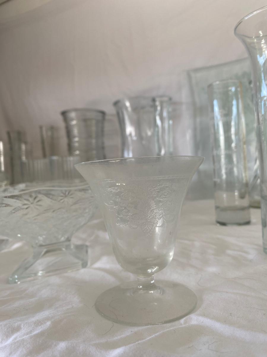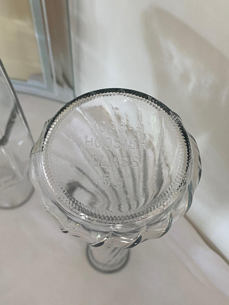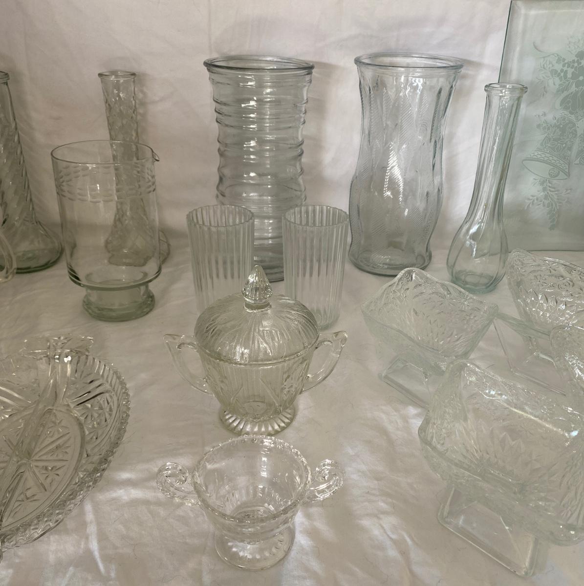 Assortment of glass/crystal. Vases are collectibles including: Hoosier glass, Brody glass, Syndicate Sales Inc., two unknown marked glass vases, and “Italy.” Back right item is a “Happy Anniversary” picture frame. All preowned and sold as is