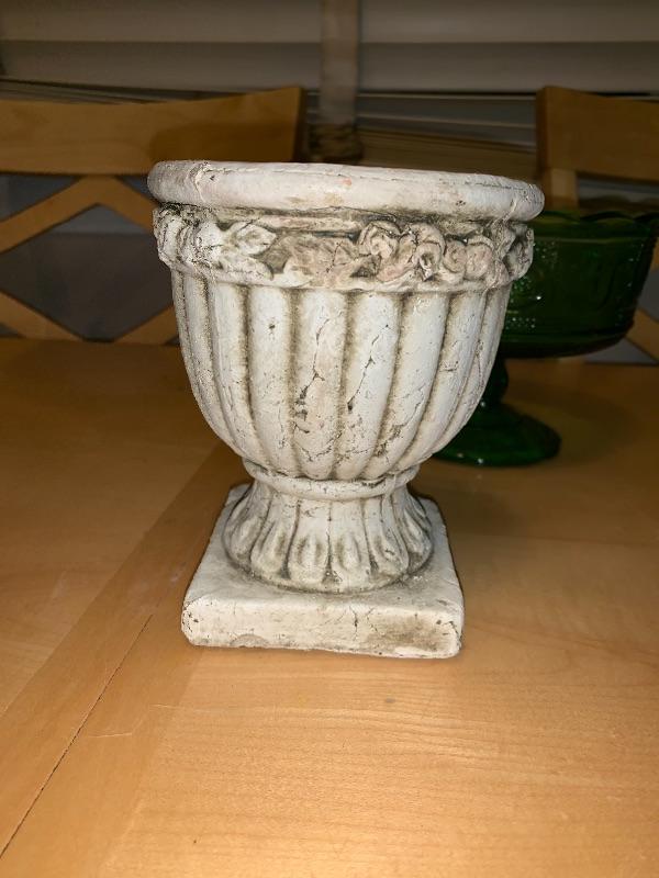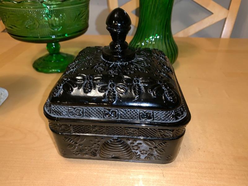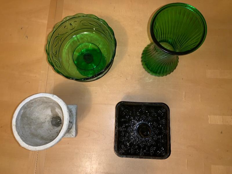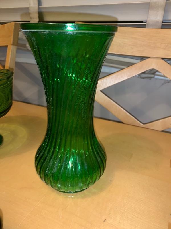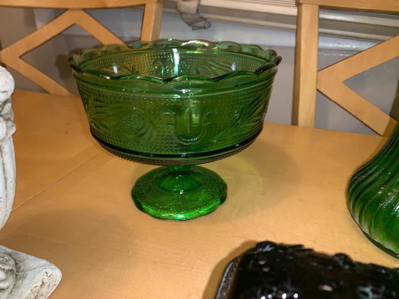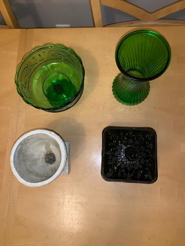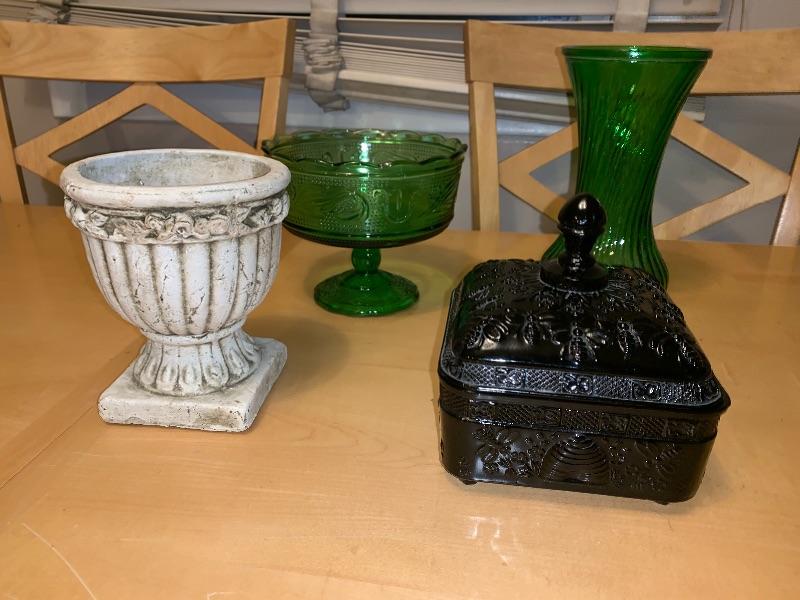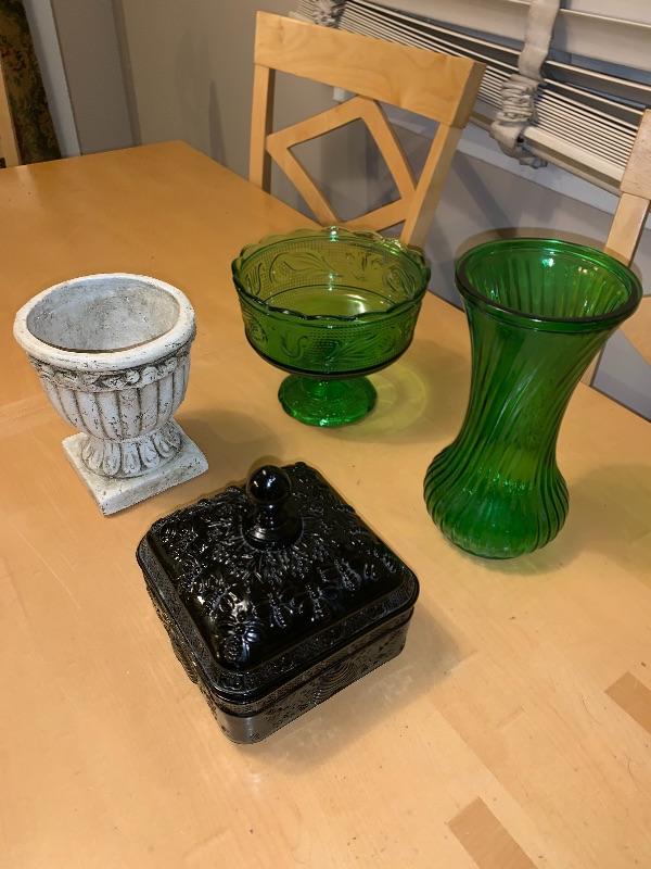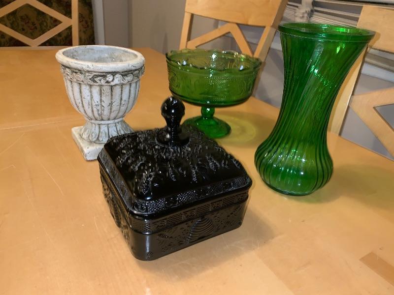 Here is an assortment of glassware. There is a green compote, green vase, plaster type vase and a dish with lid.