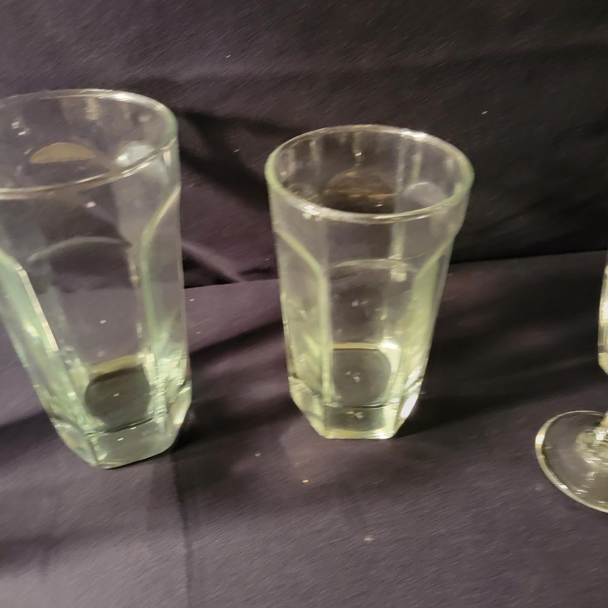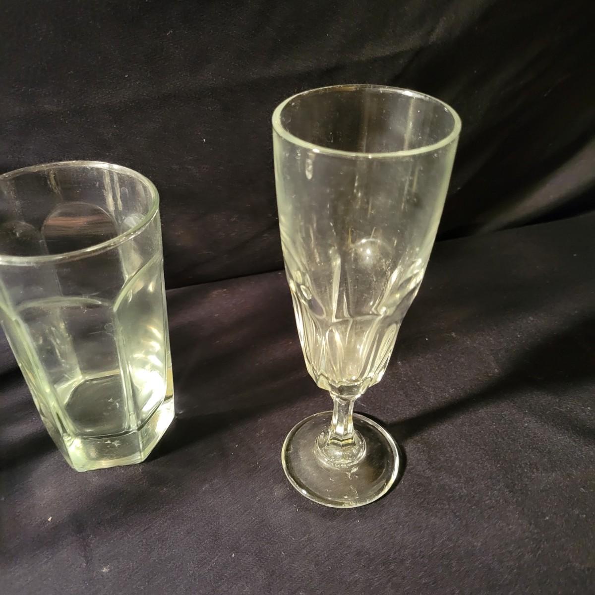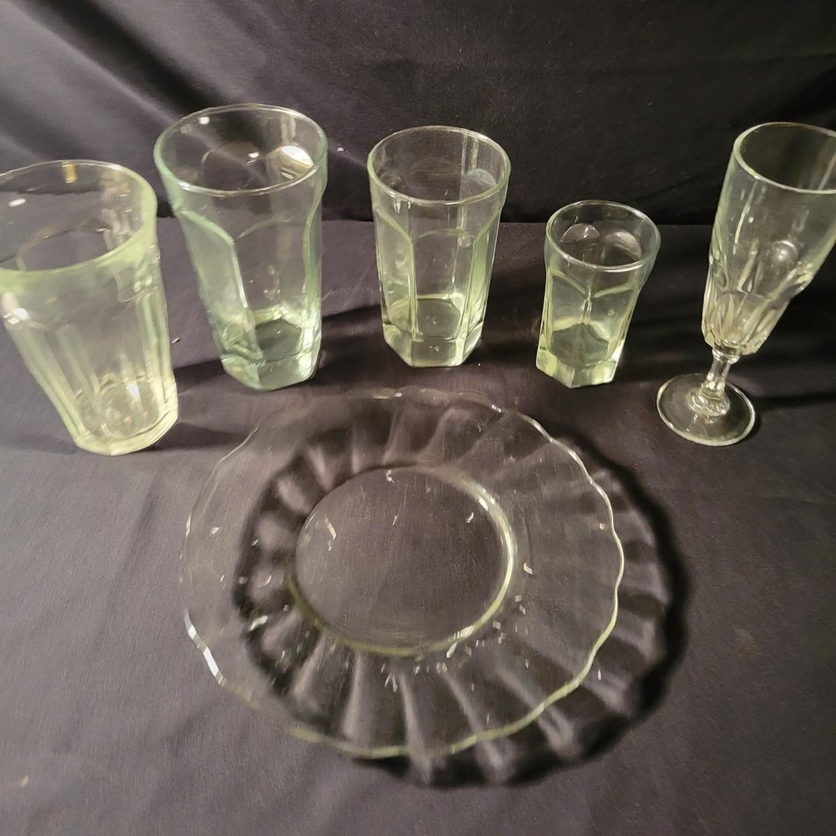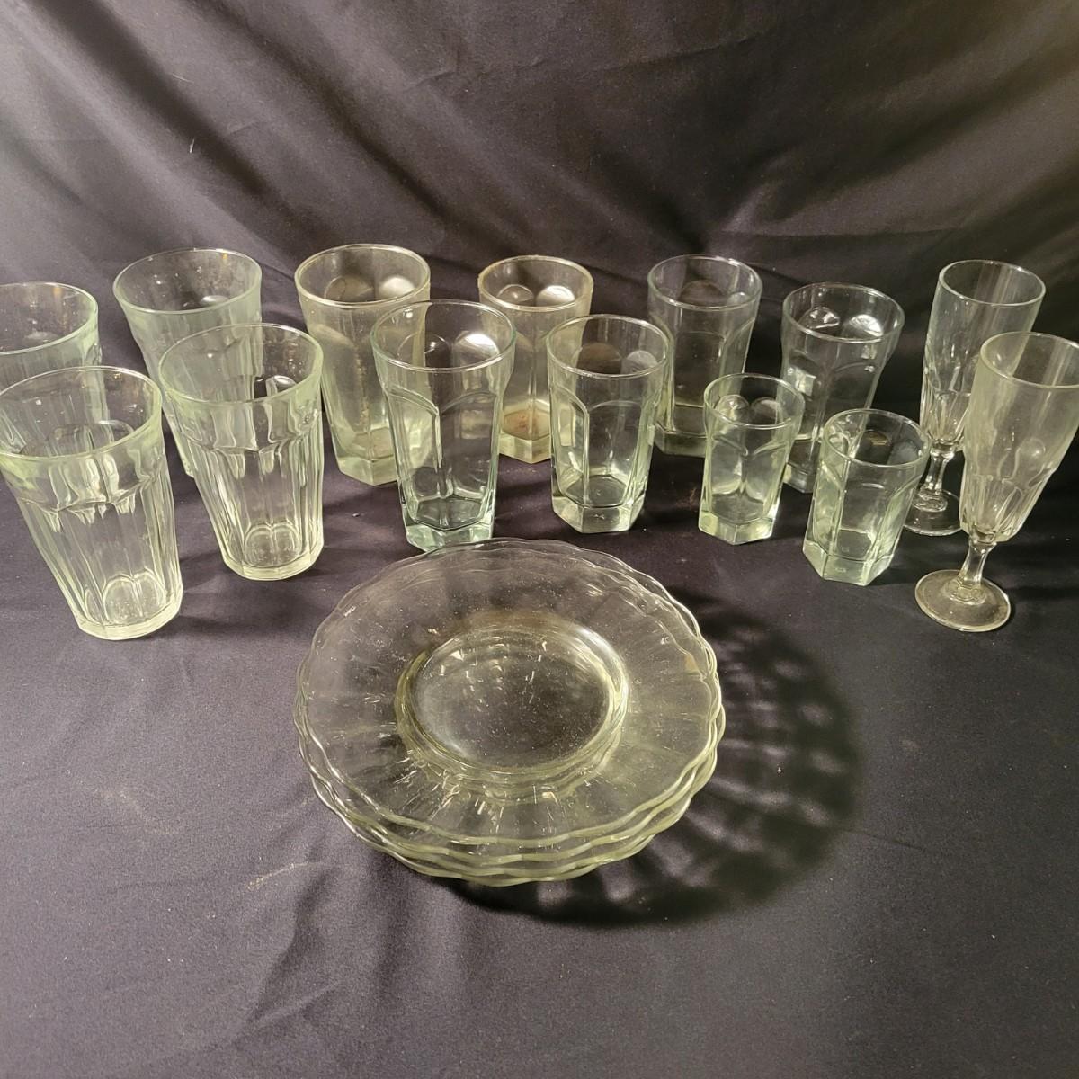 An assortment of glasses and glass plates in good condition with no notable damage. Included is 4 glass plates measuring 9", 6 large glasses approximately 5.5" tall, 4 medium glasses approximately 5" tall, 2 small glasses 4" tall and 2 glass Flutes approximately 7" tall. Shipping available