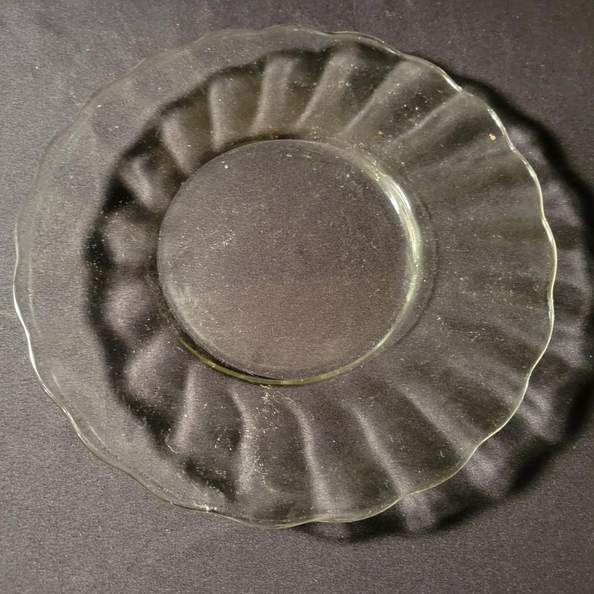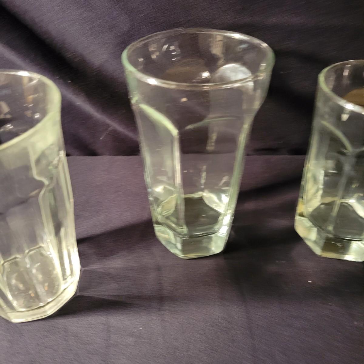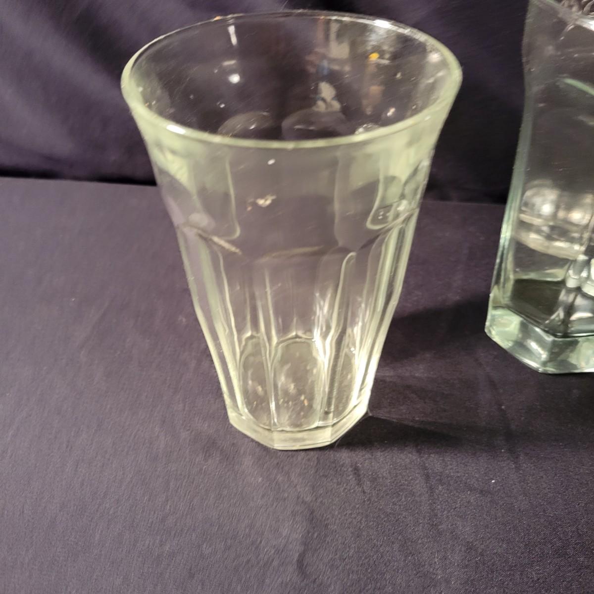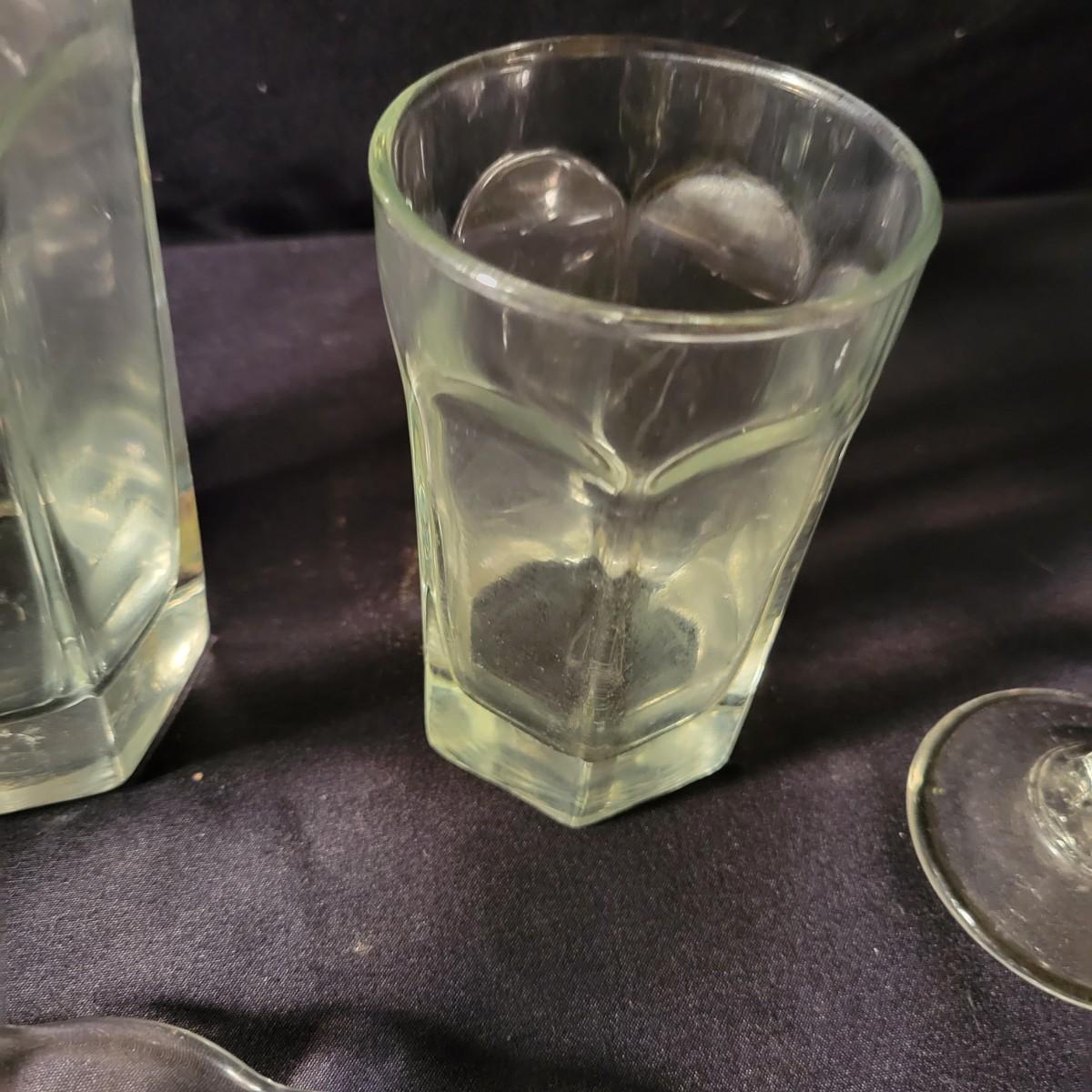 An assortment of glasses and glass plates in good condition with no notable damage. Included is 4 glass plates measuring 9", 6 large glasses approximately 5.5" tall, 4 medium glasses approximately 5" tall, 2 small glasses 4" tall and 2 glass Flutes approximately 7" tall. Shipping available