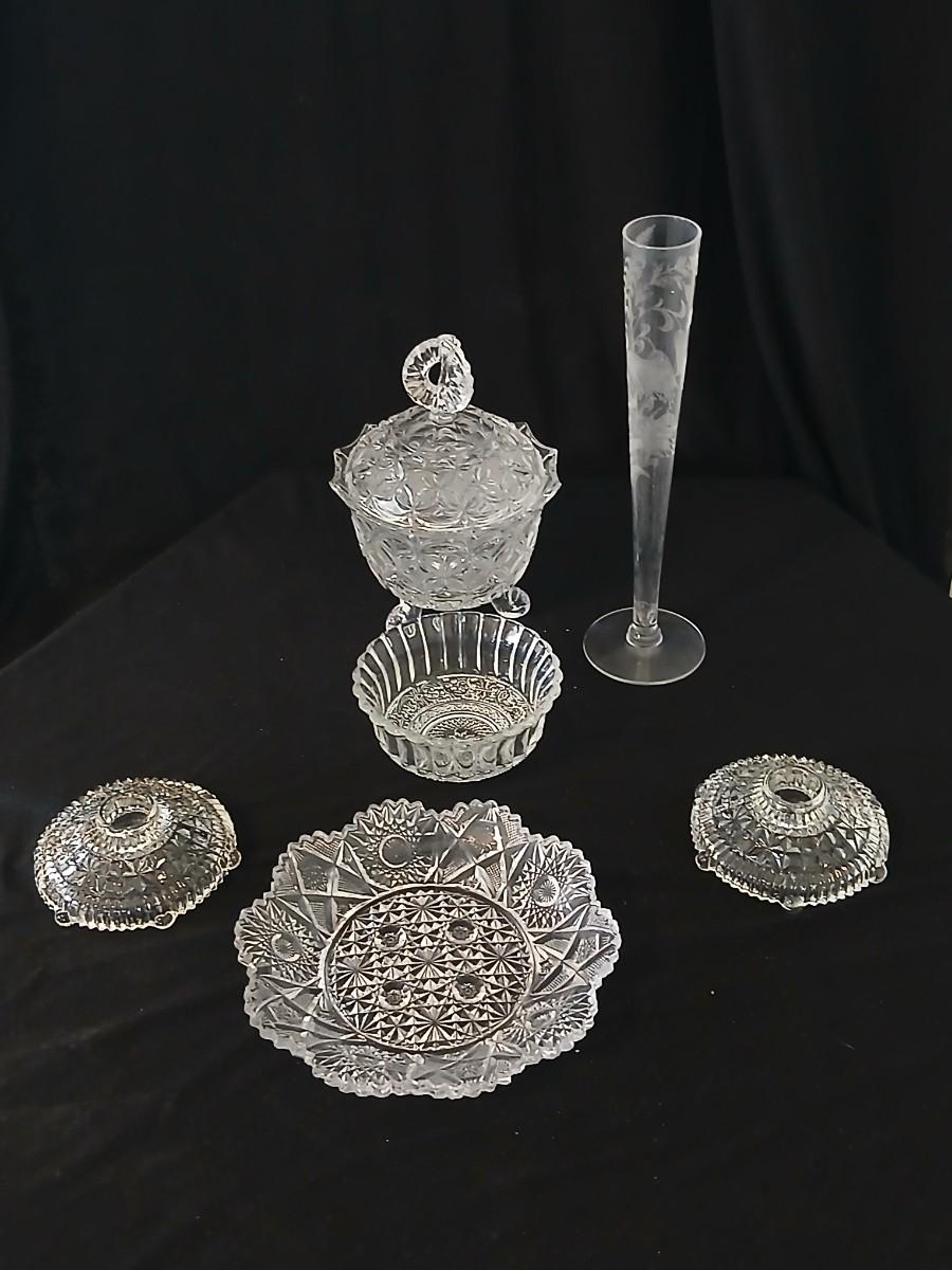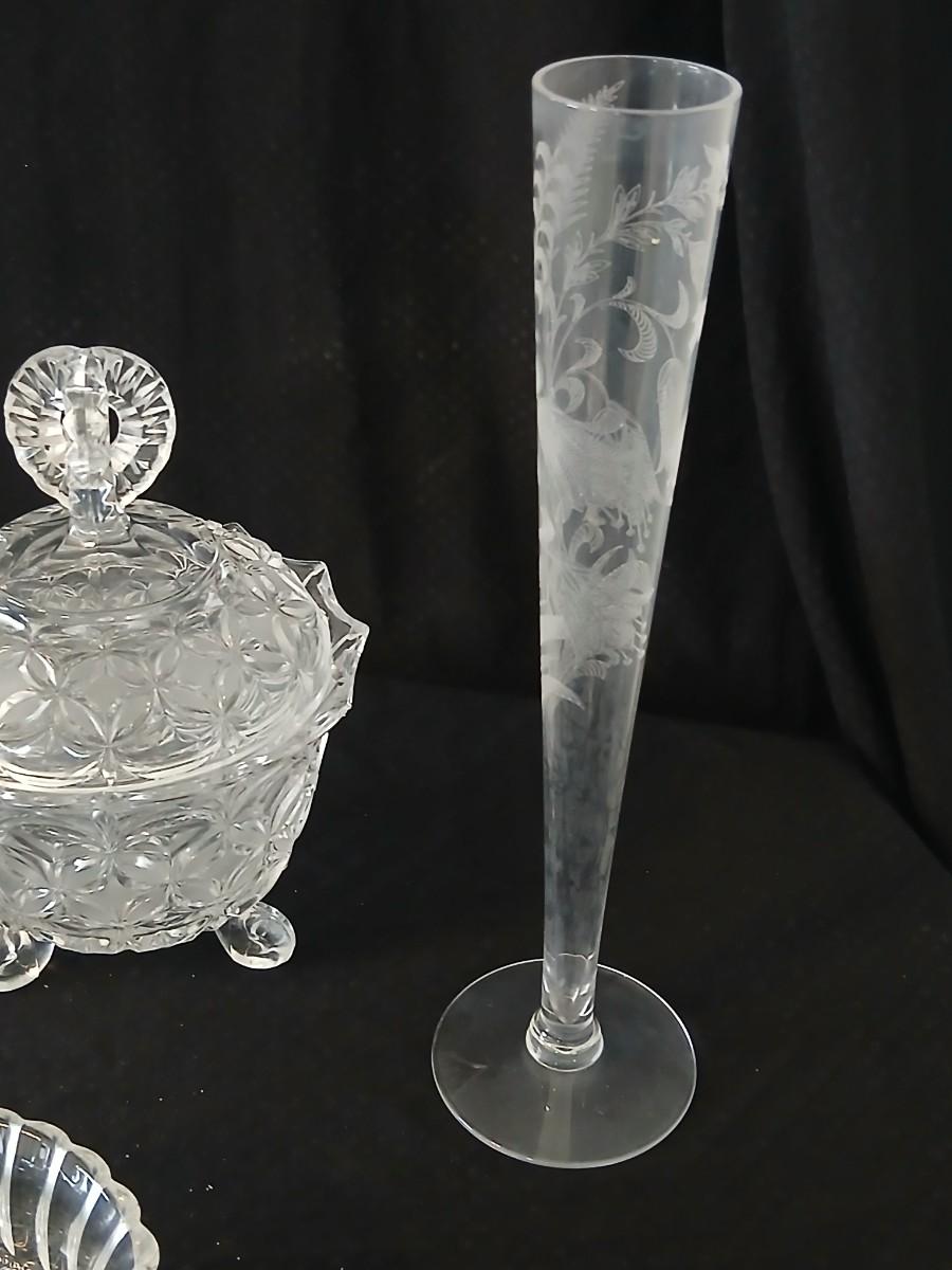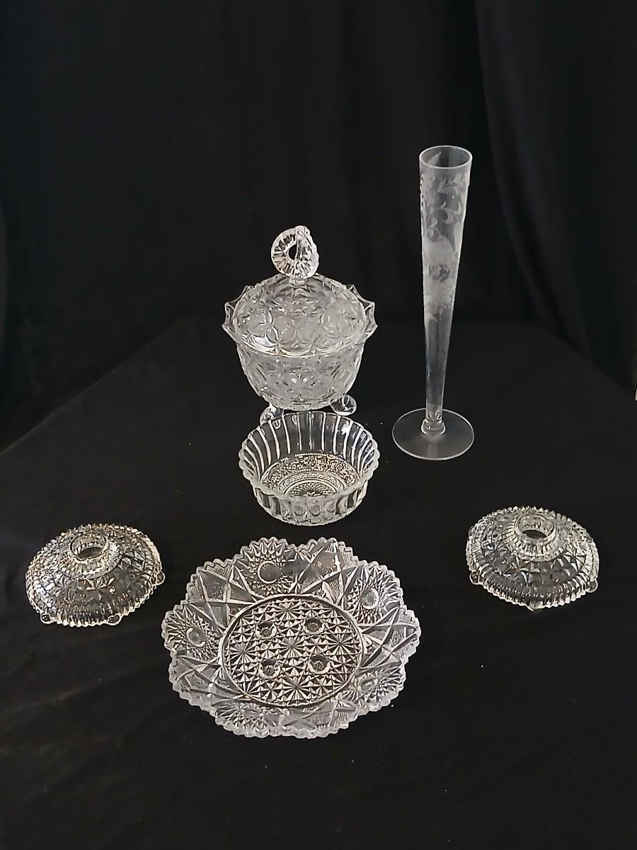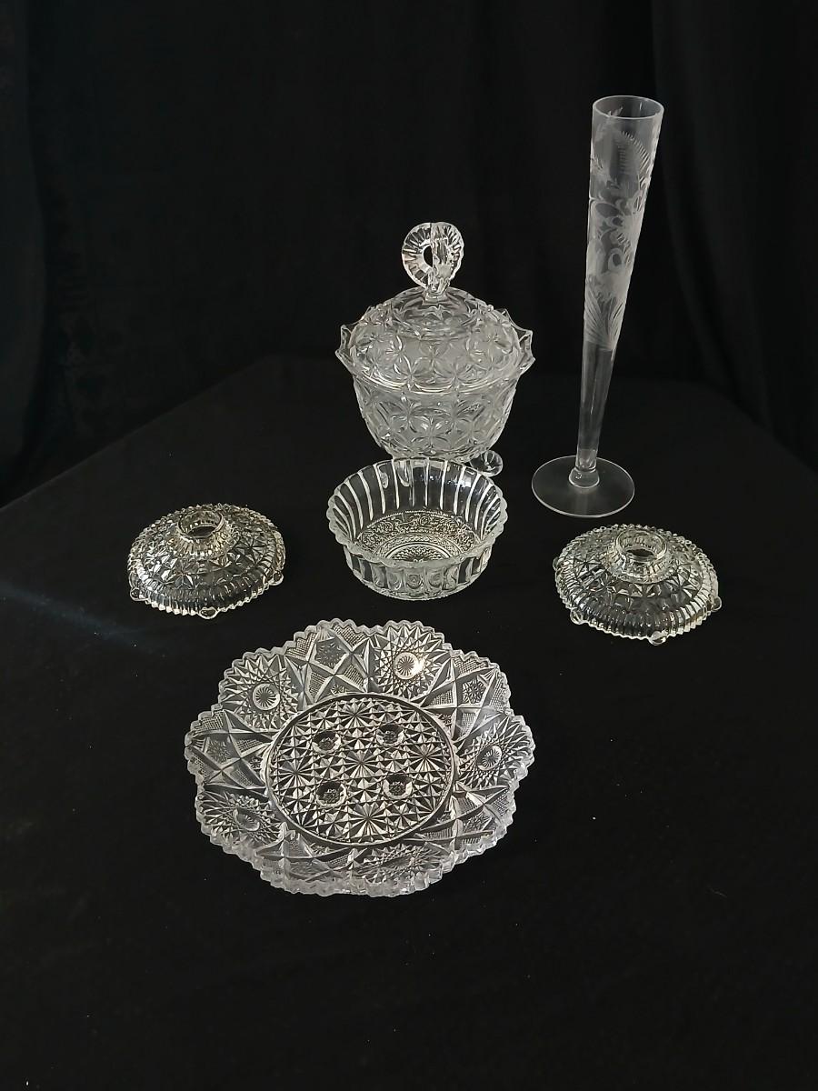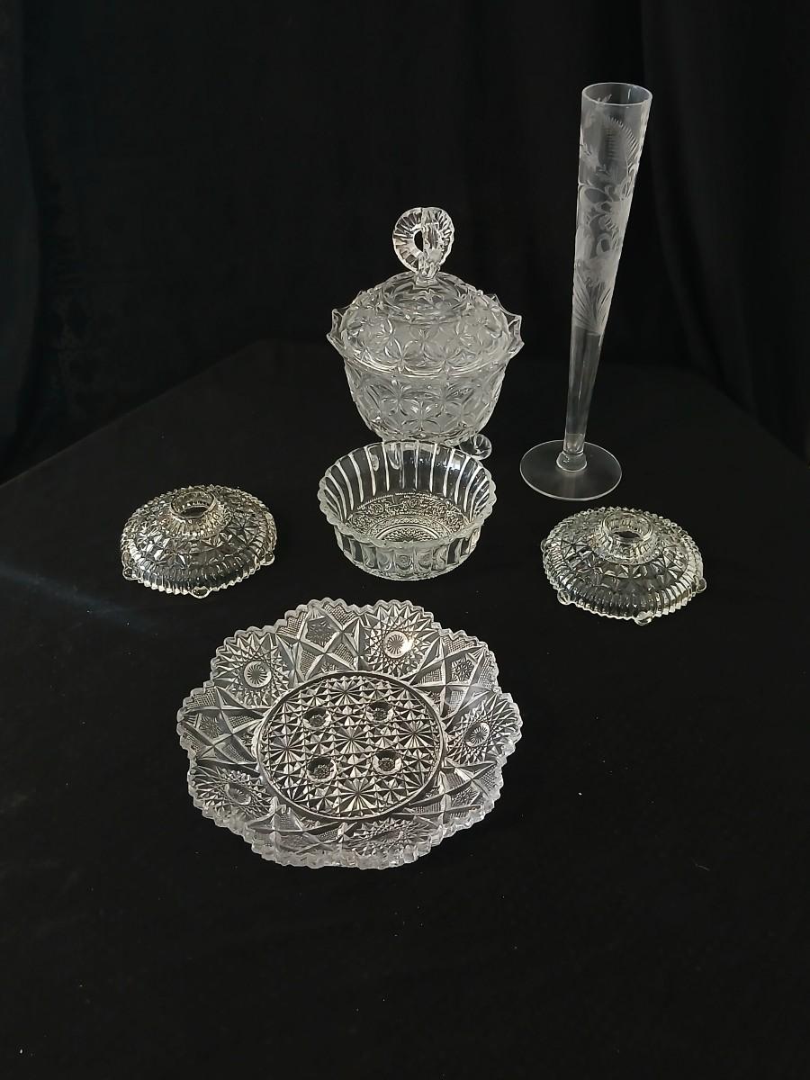 Assortment of glassware - Etched Daffodil Vase, Bowls, candy dish, Candle stick holders