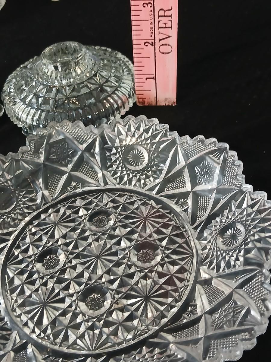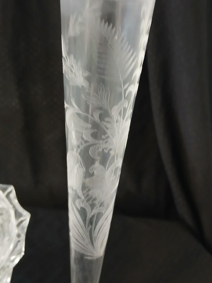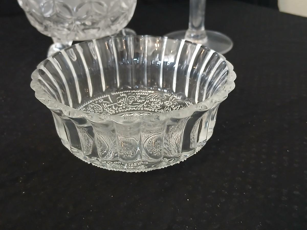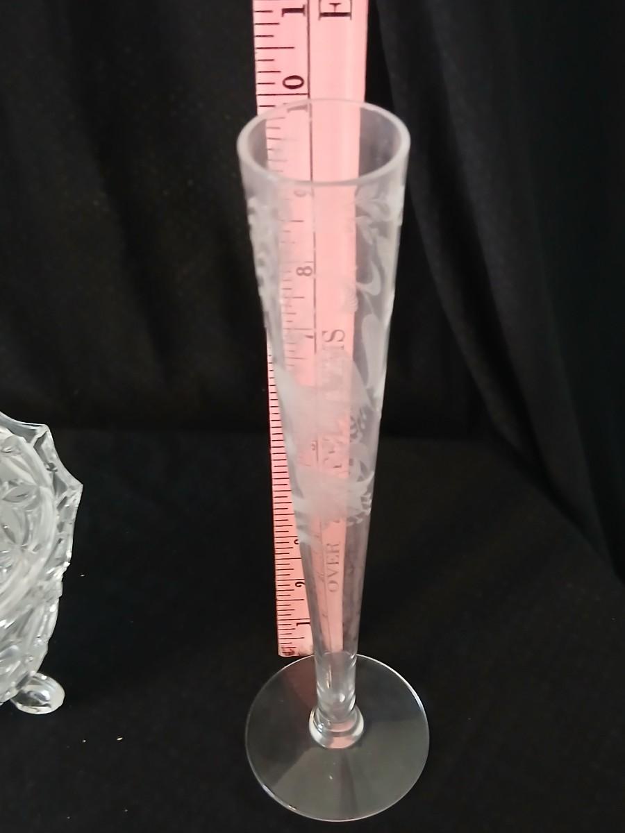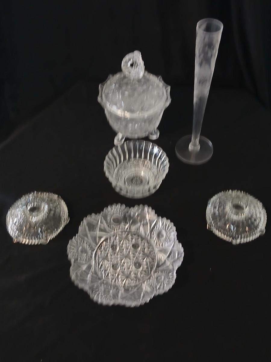 Assortment of glassware - Etched Daffodil Vase, Bowls, candy dish, Candle stick holders