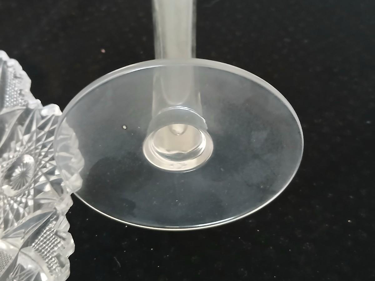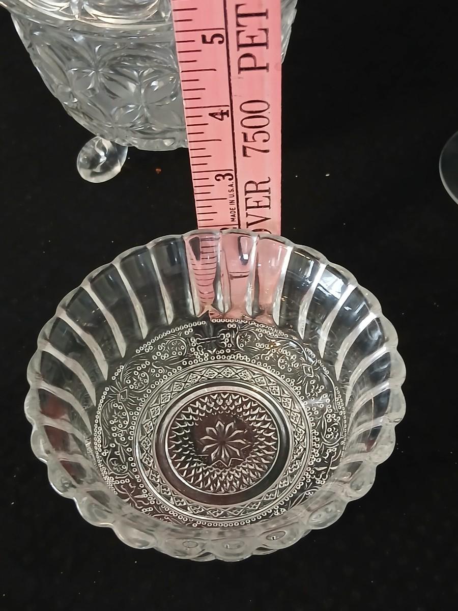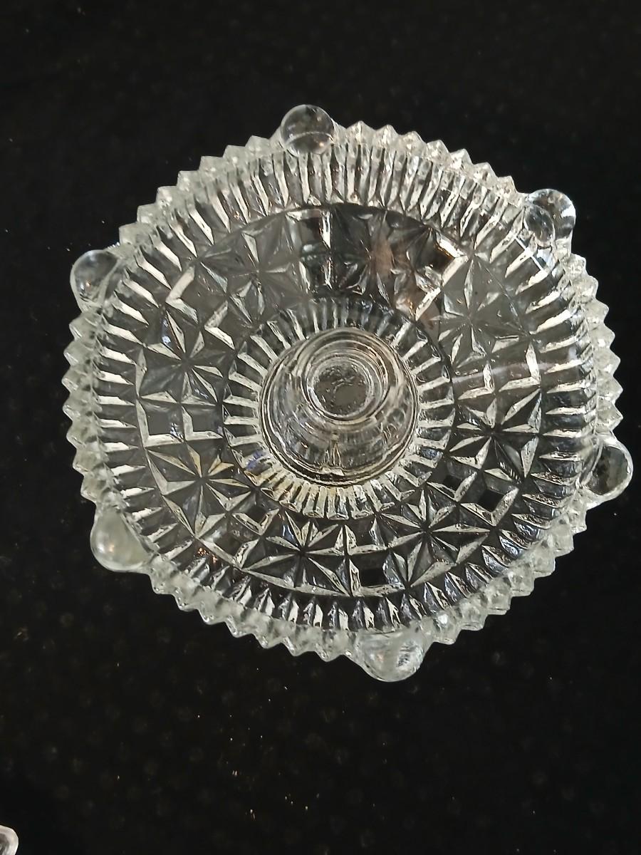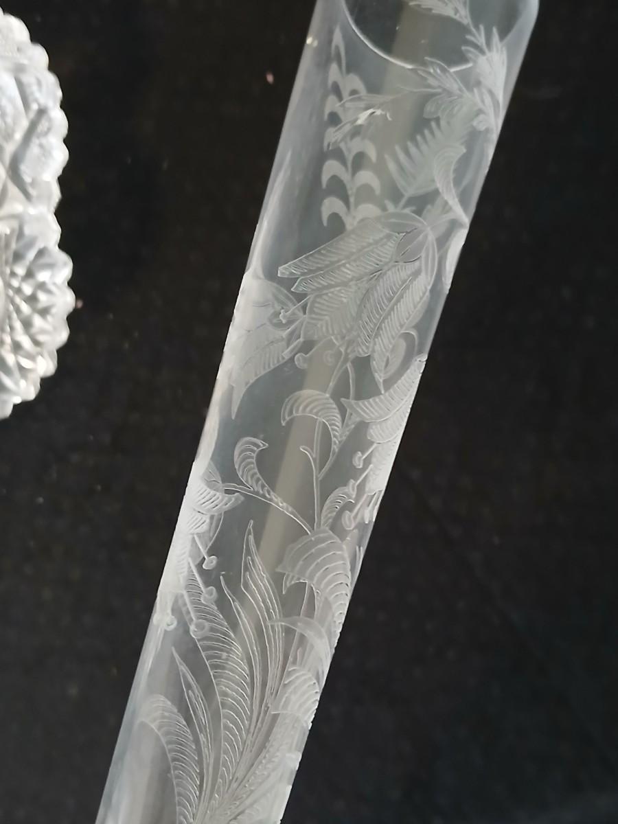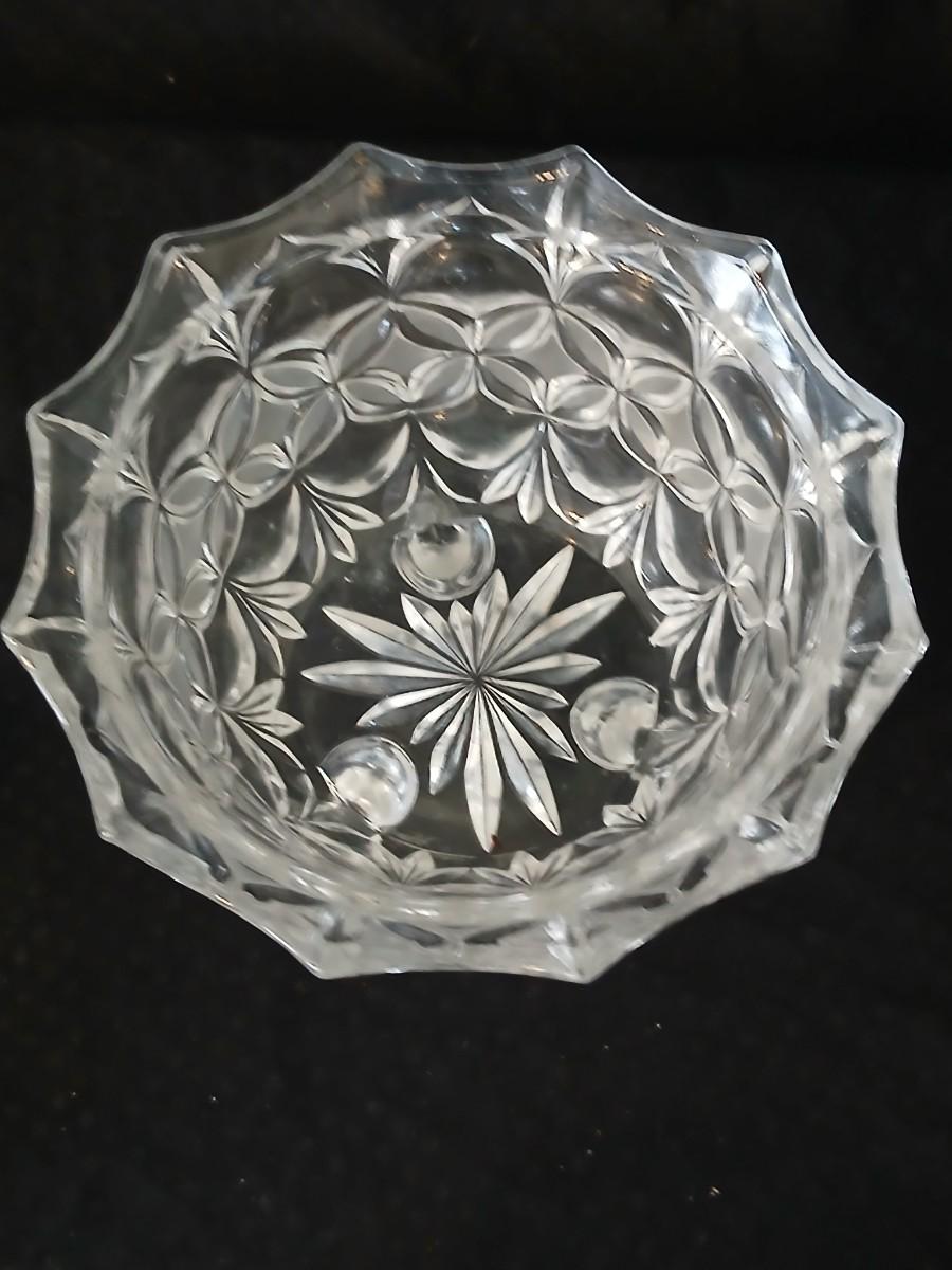 Assortment of glassware - Etched Daffodil Vase, Bowls, candy dish, Candle stick holders