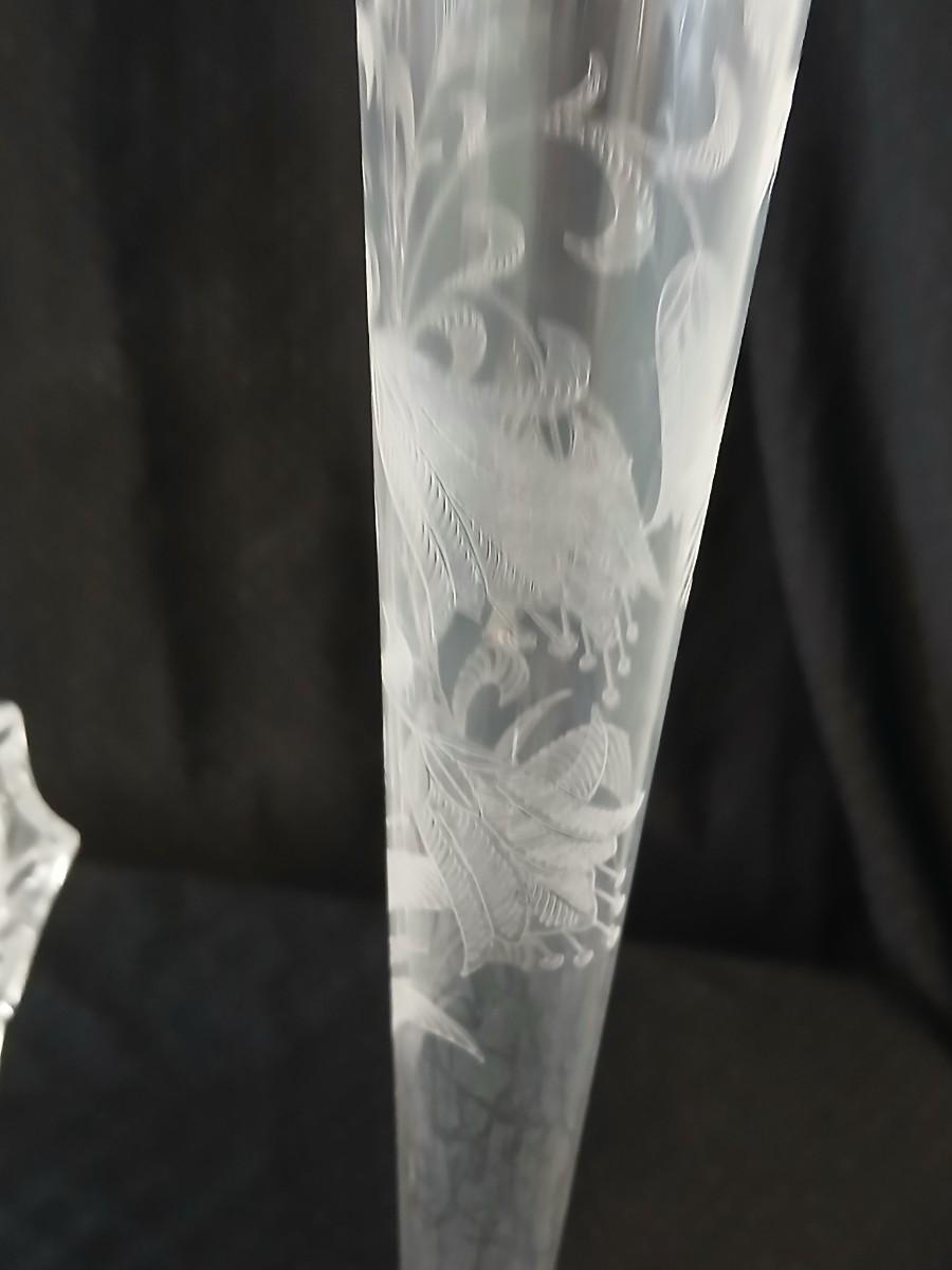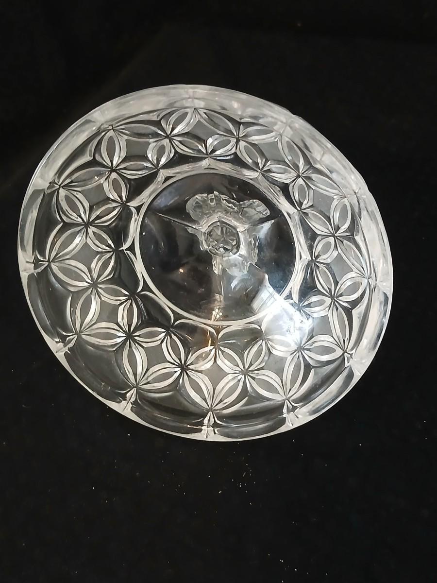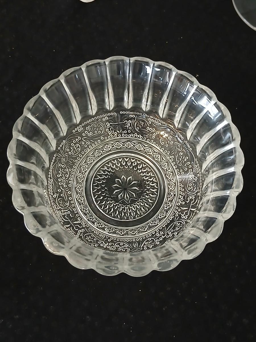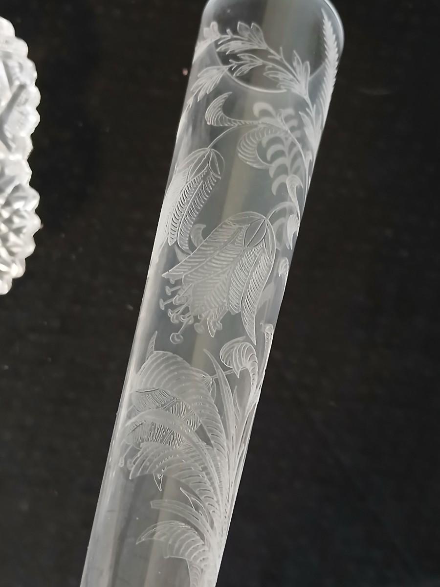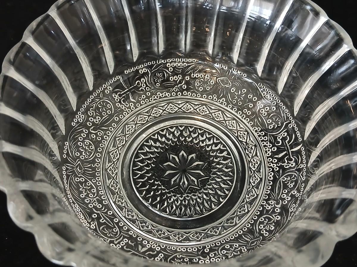 Assortment of glassware - Etched Daffodil Vase, Bowls, candy dish, Candle stick holders