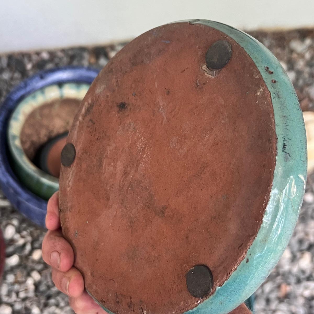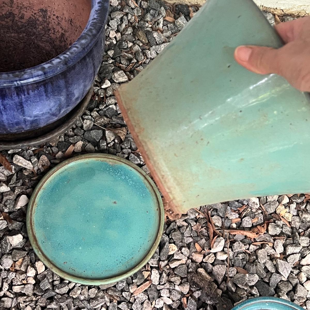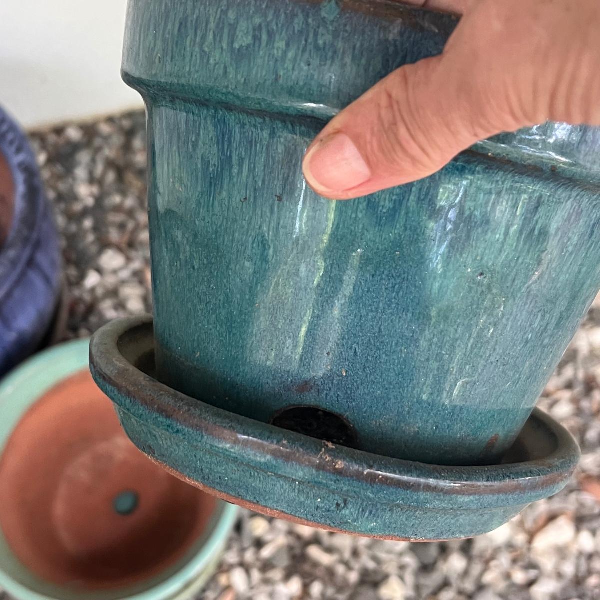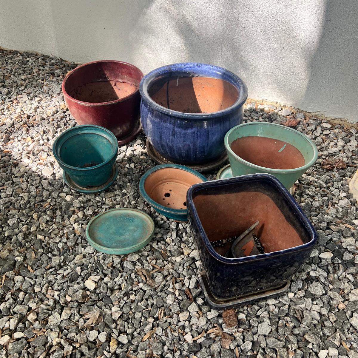 Six glazed plant pots plus an extra saucer. Most pots have built in drip saucers. Two pots have damage but are still functional and one of these two pots has pieces that could be glued.