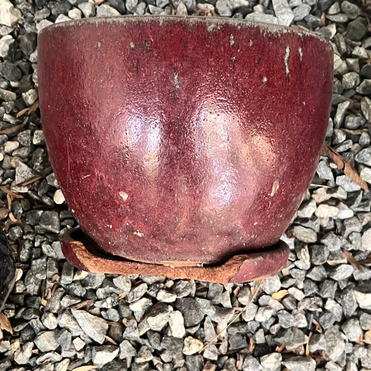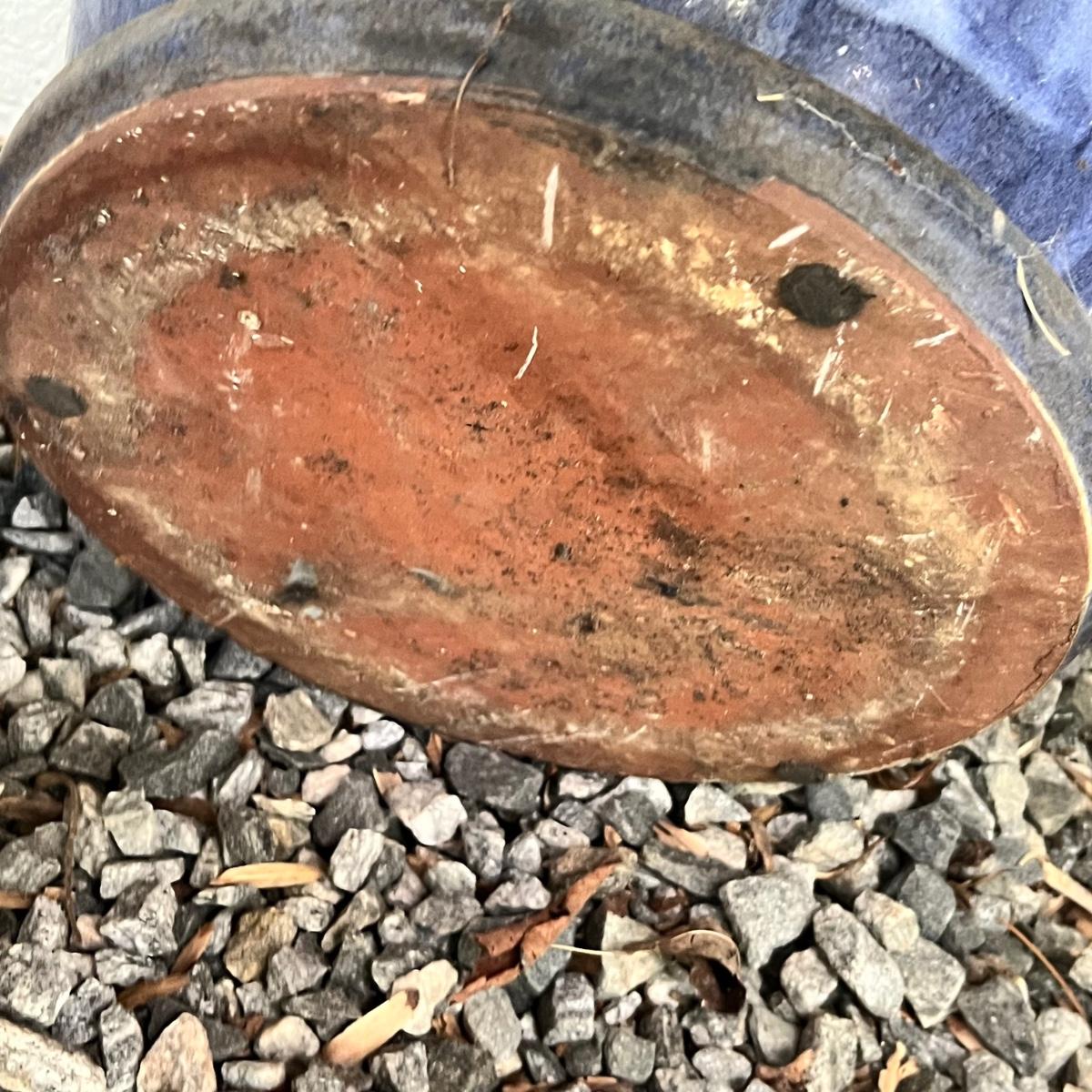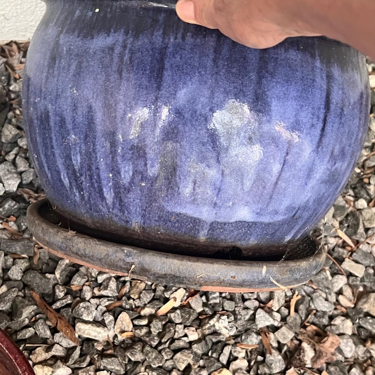 Six glazed plant pots plus an extra saucer. Most pots have built in drip saucers. Two pots have damage but are still functional and one of these two pots has pieces that could be glued.