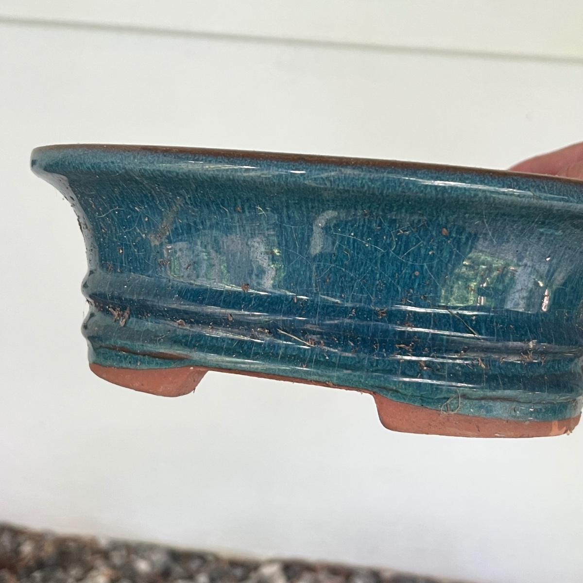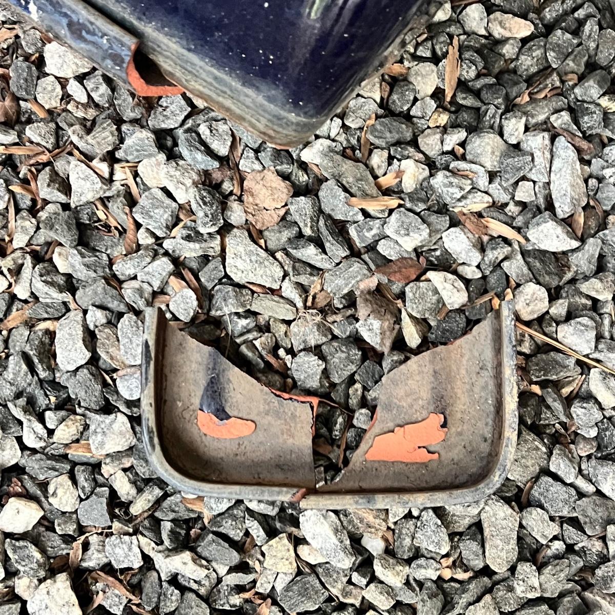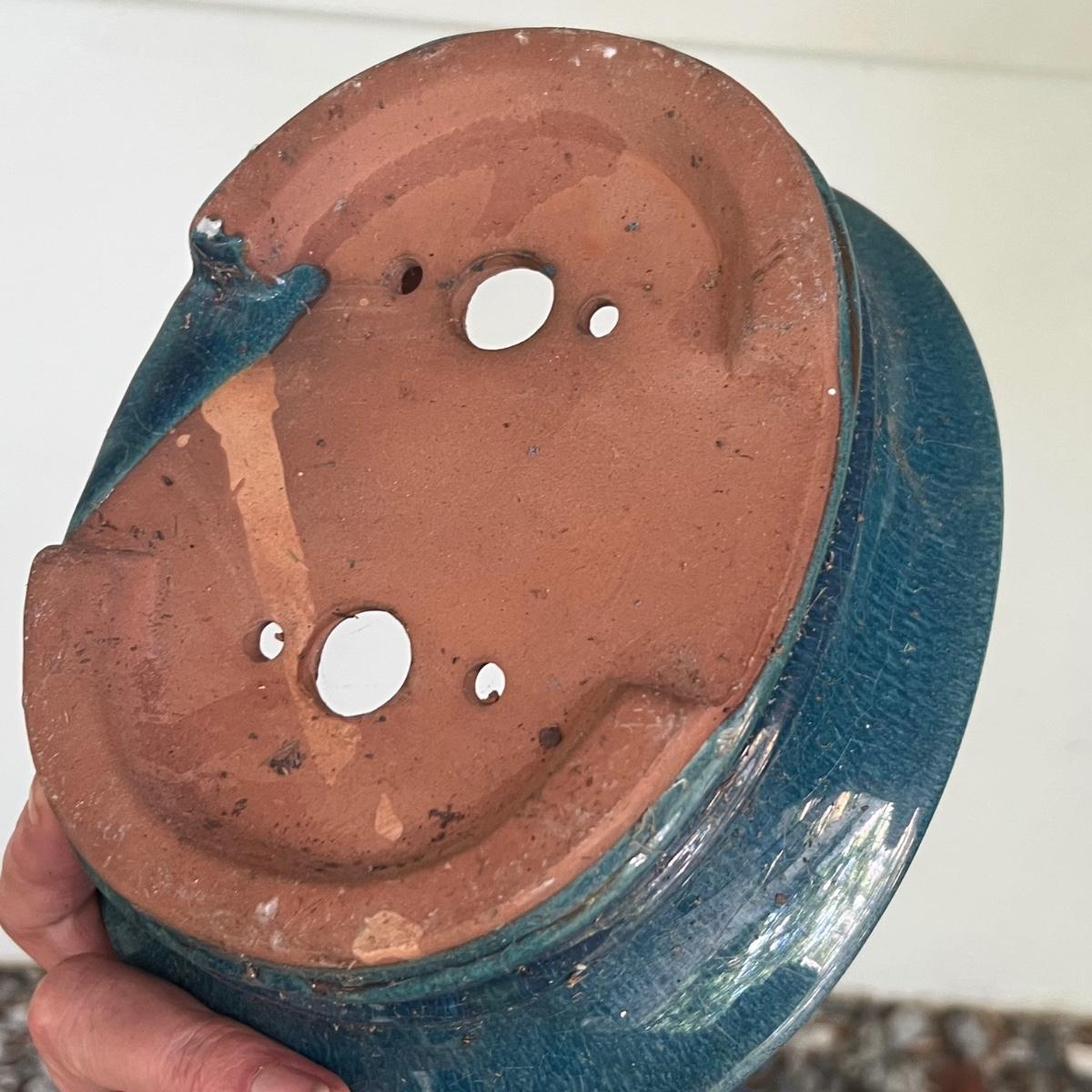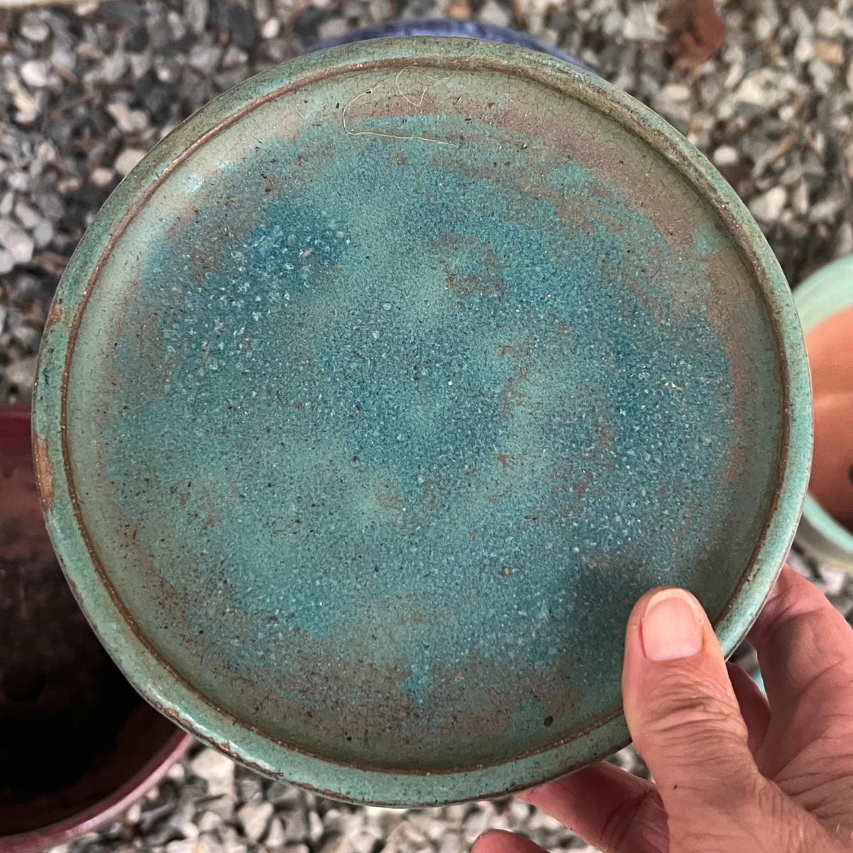 Six glazed plant pots plus an extra saucer. Most pots have built in drip saucers. Two pots have damage but are still functional and one of these two pots has pieces that could be glued.