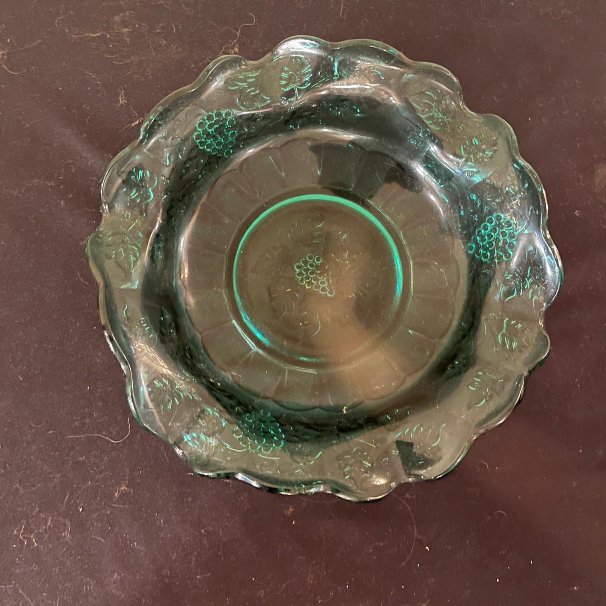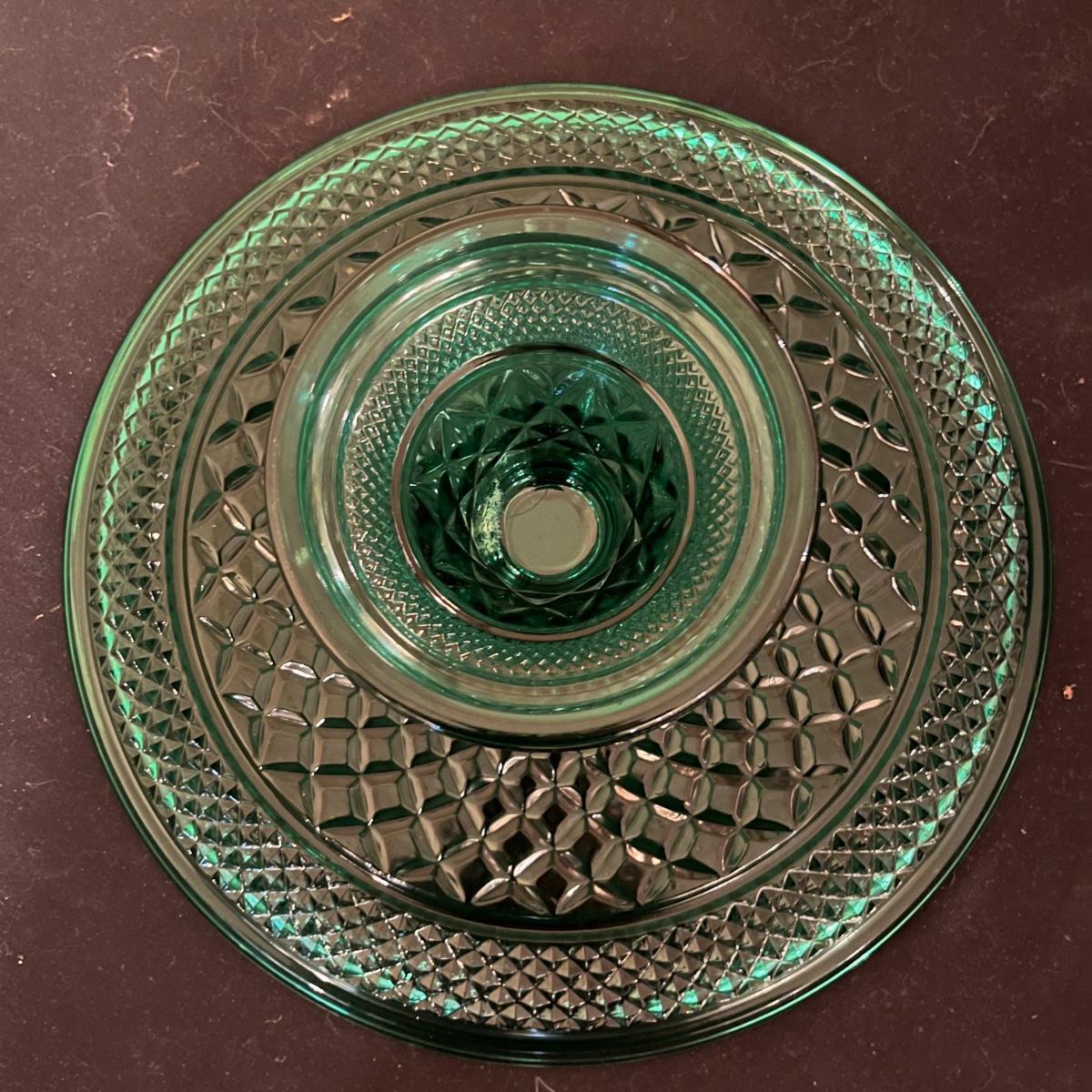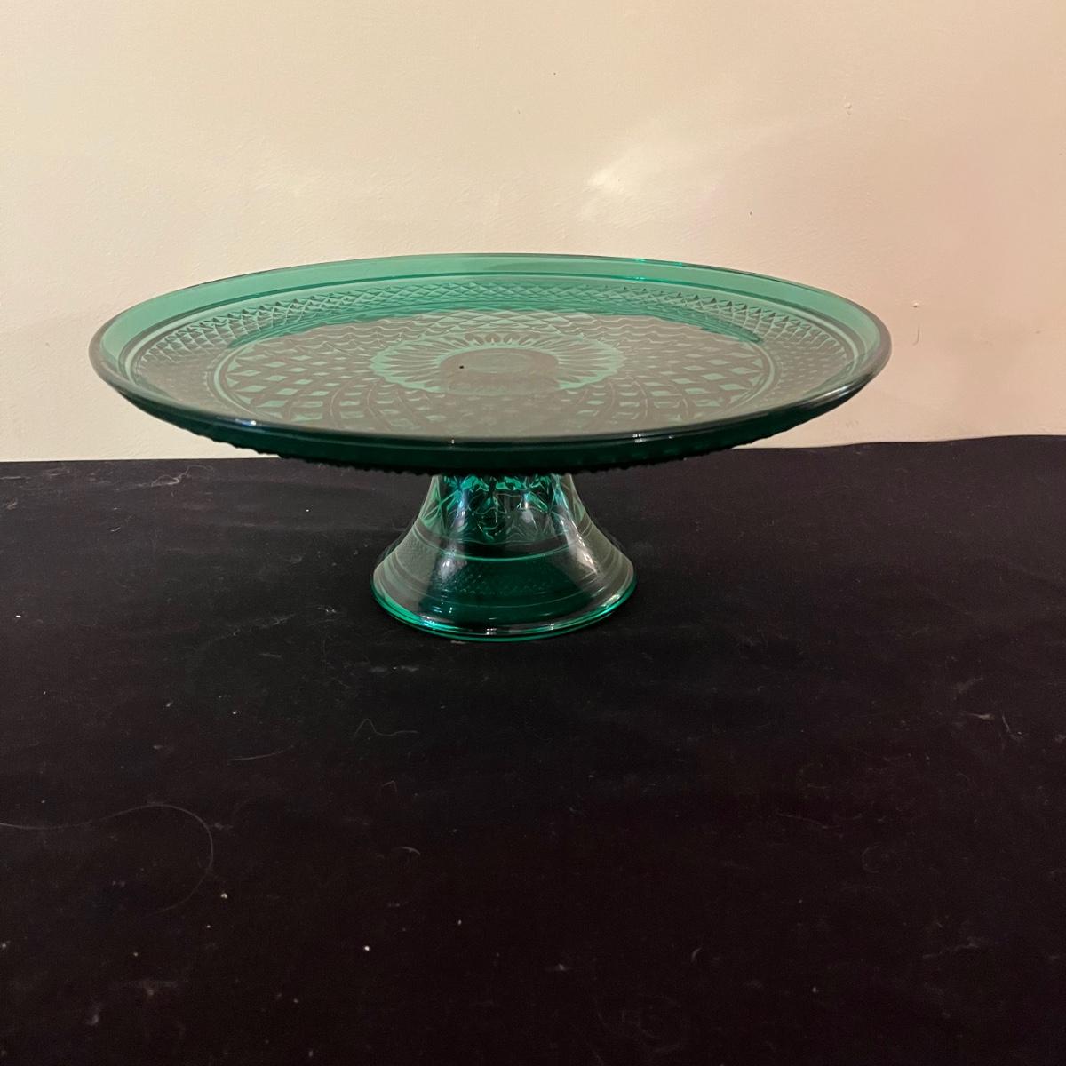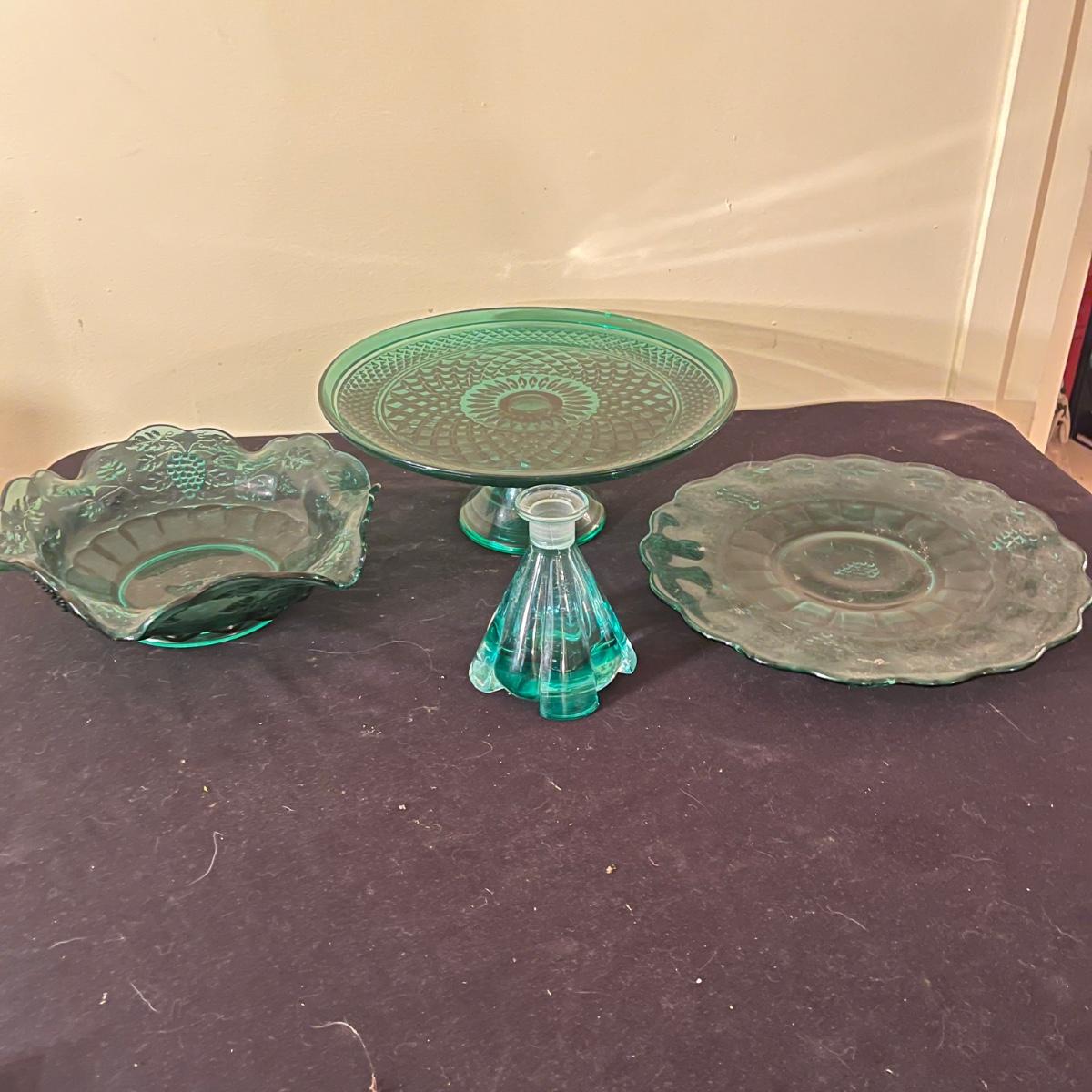 Lot includes a cake stand, bowl, plate and a bottle that is missing top. Cake stand measures 12”D x 5” tall.