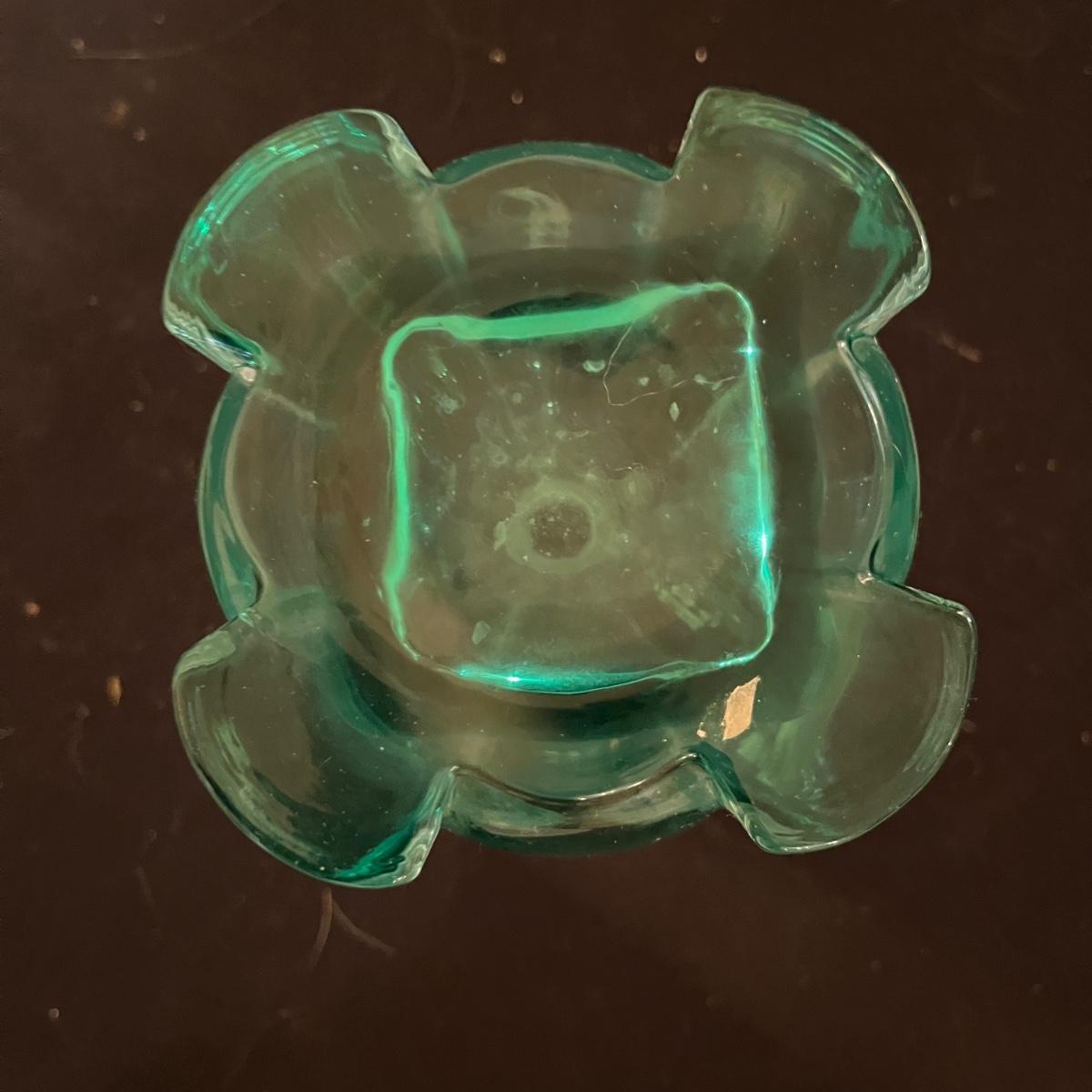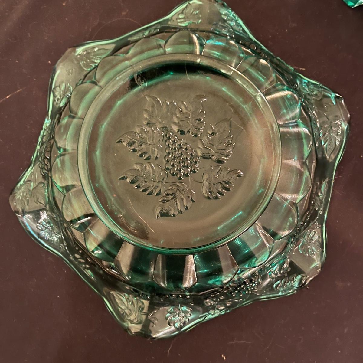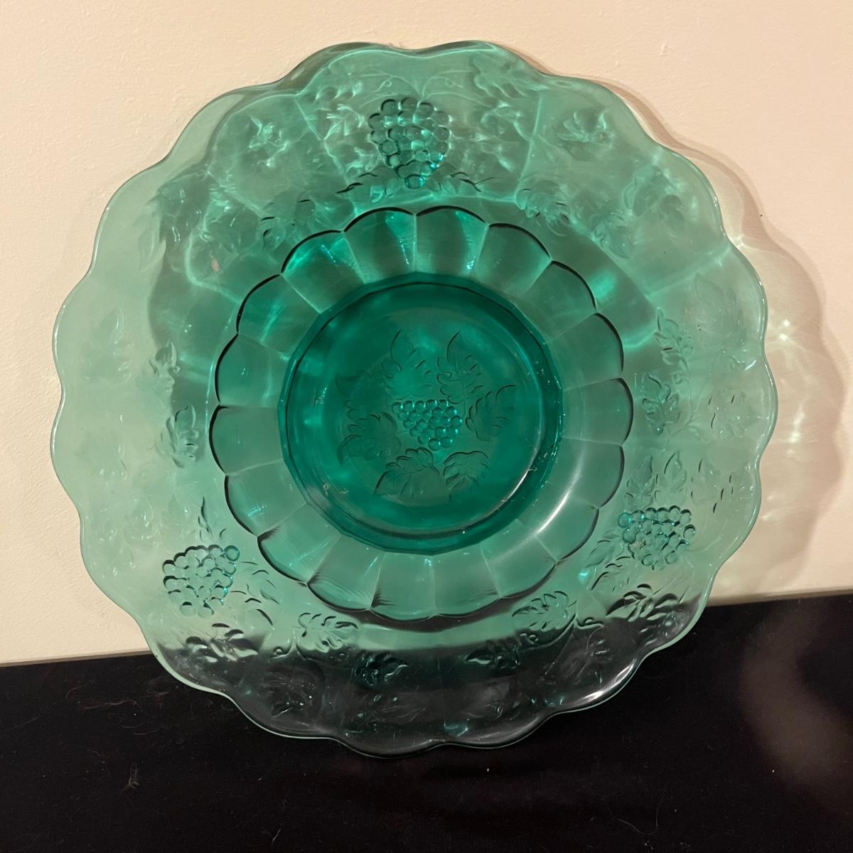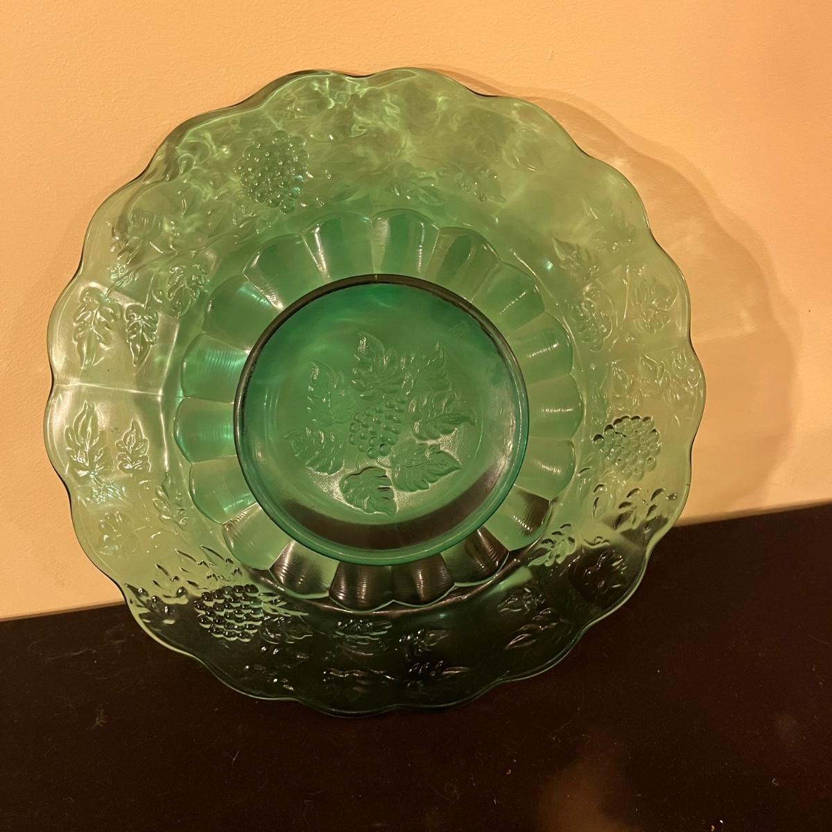 Lot includes a cake stand, bowl, plate and a bottle that is missing top. Cake stand measures 12”D x 5” tall.