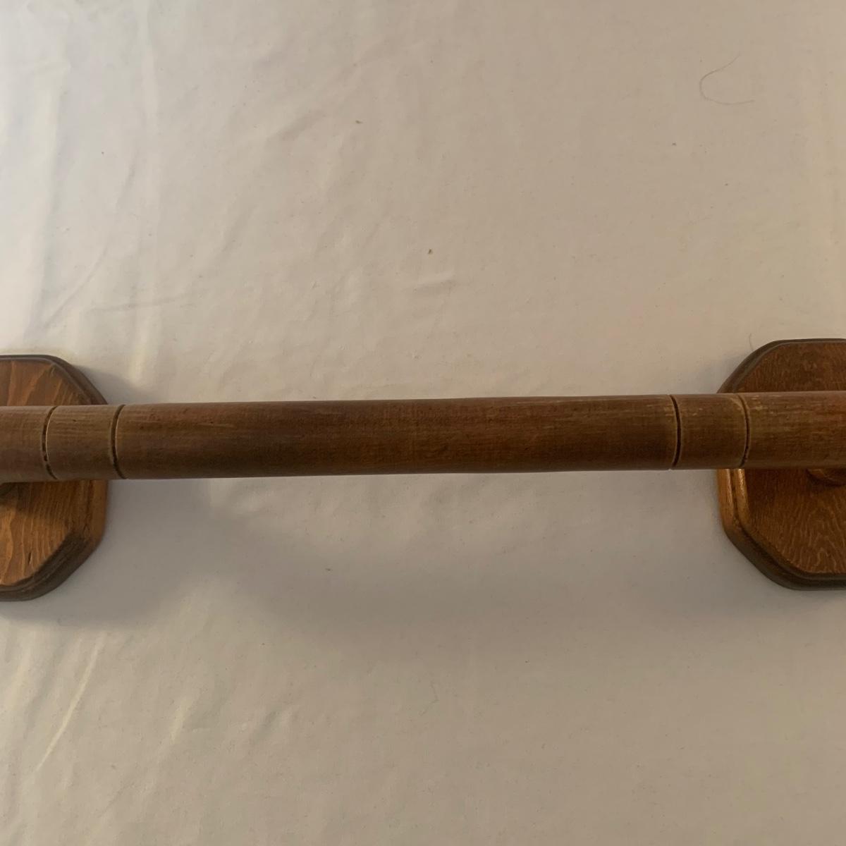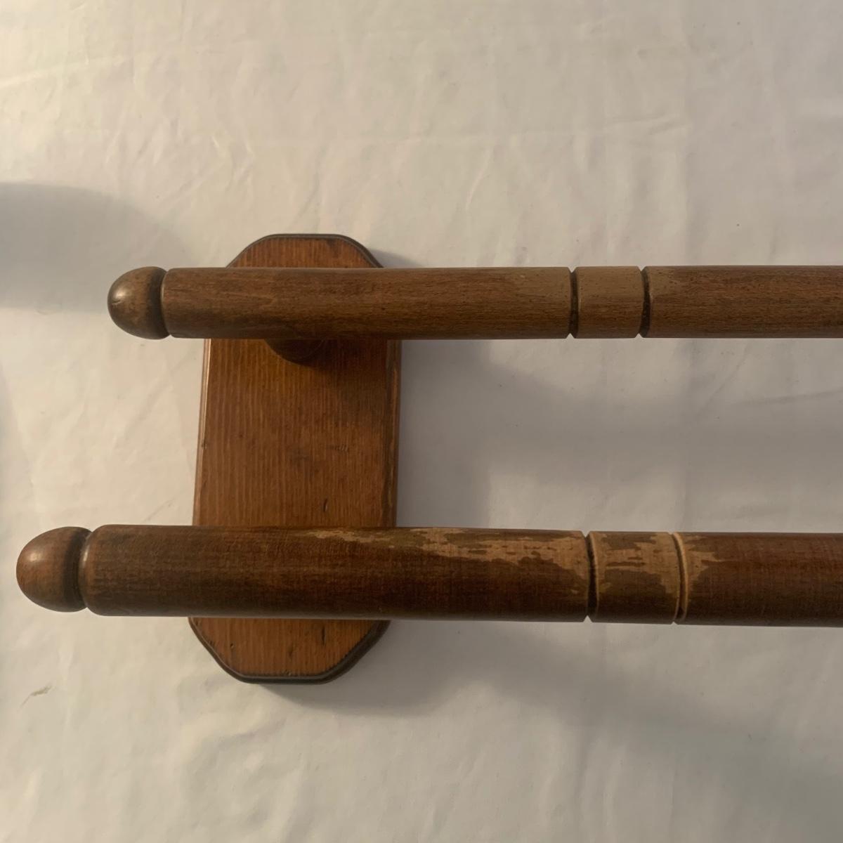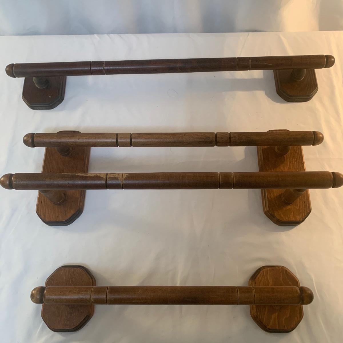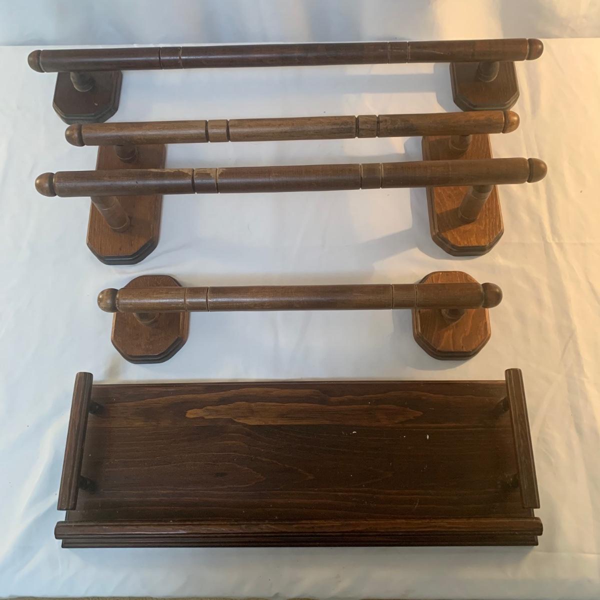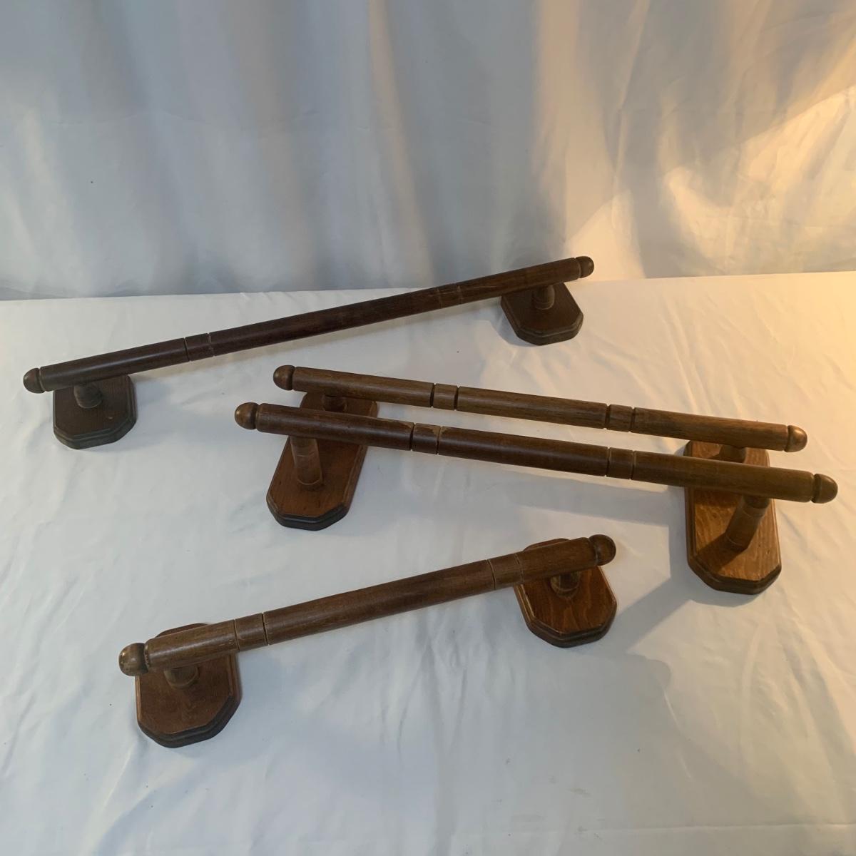 This assortment of handcrafted towel racks was made here in Asheville, NC by “Three Mountaineers”. Only one of the items has a brand sticker, so we cannot verify that all of these items are from Three Mountaineers. Lot includes three wood towel racks and small wood countertop organizer. Items show a little wear, but are overall in good condition. Please see photos for details. The largest rack measures 27”L. The base measures, 4.5”L x 3.5”W.