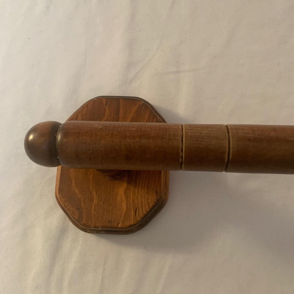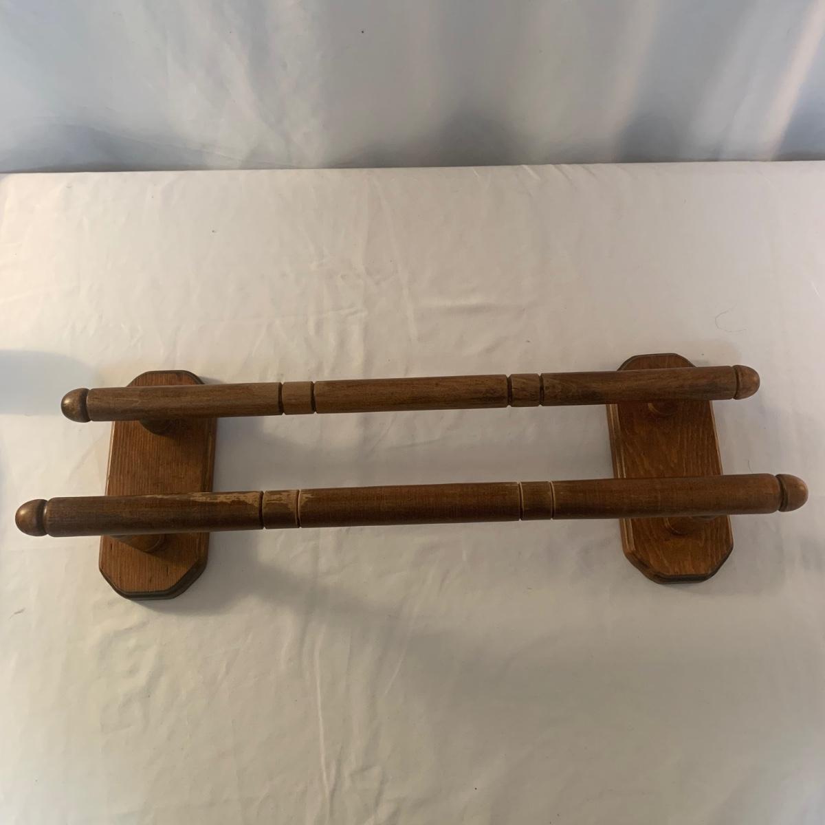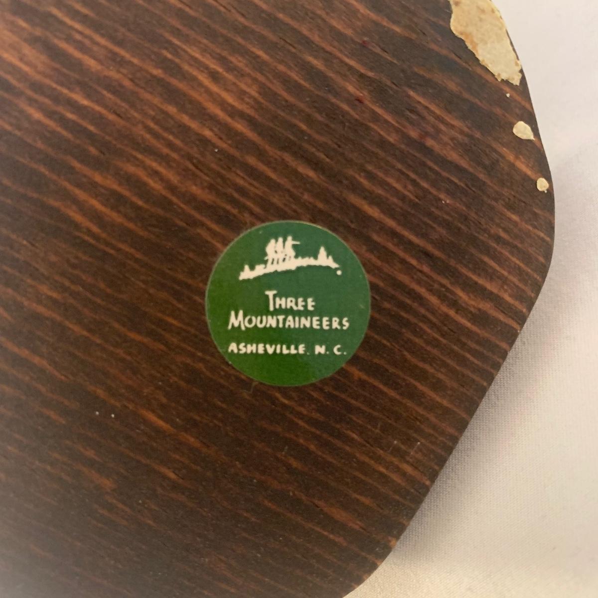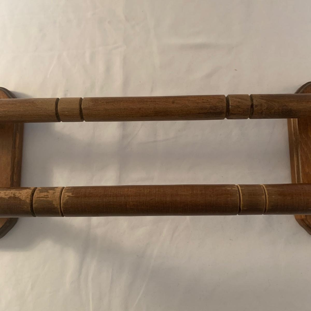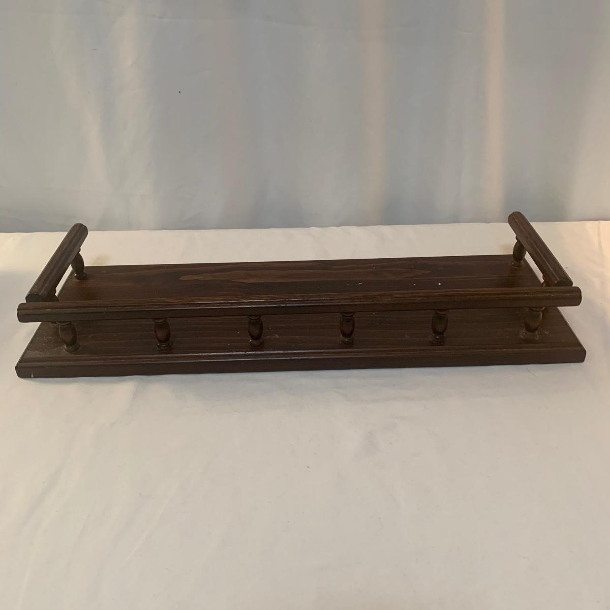 This assortment of handcrafted towel racks was made here in Asheville, NC by “Three Mountaineers”. Only one of the items has a brand sticker, so we cannot verify that all of these items are from Three Mountaineers. Lot includes three wood towel racks and small wood countertop organizer. Items show a little wear, but are overall in good condition. Please see photos for details. The largest rack measures 27”L. The base measures, 4.5”L x 3.5”W.