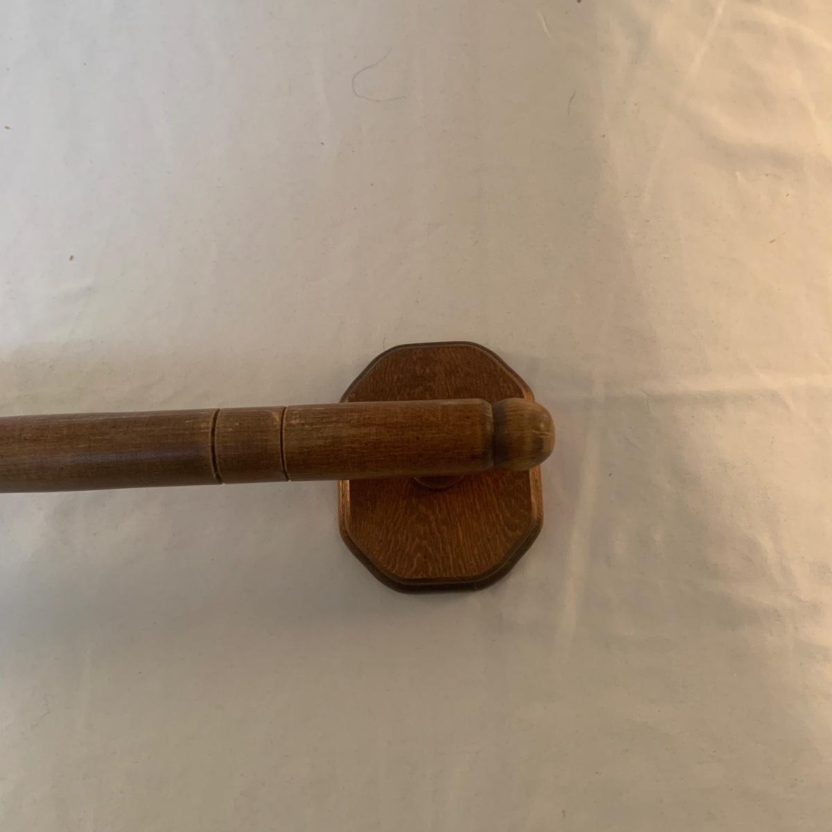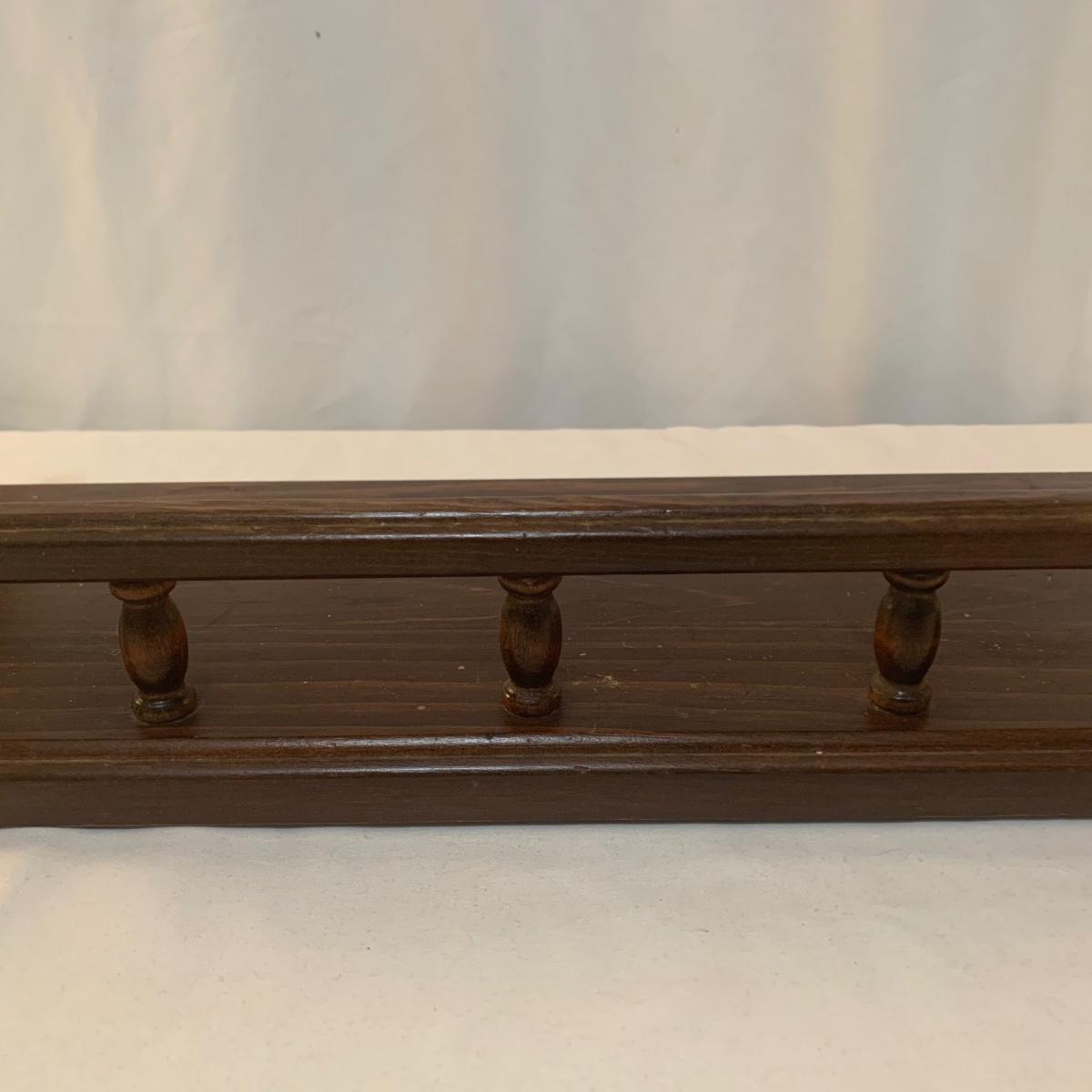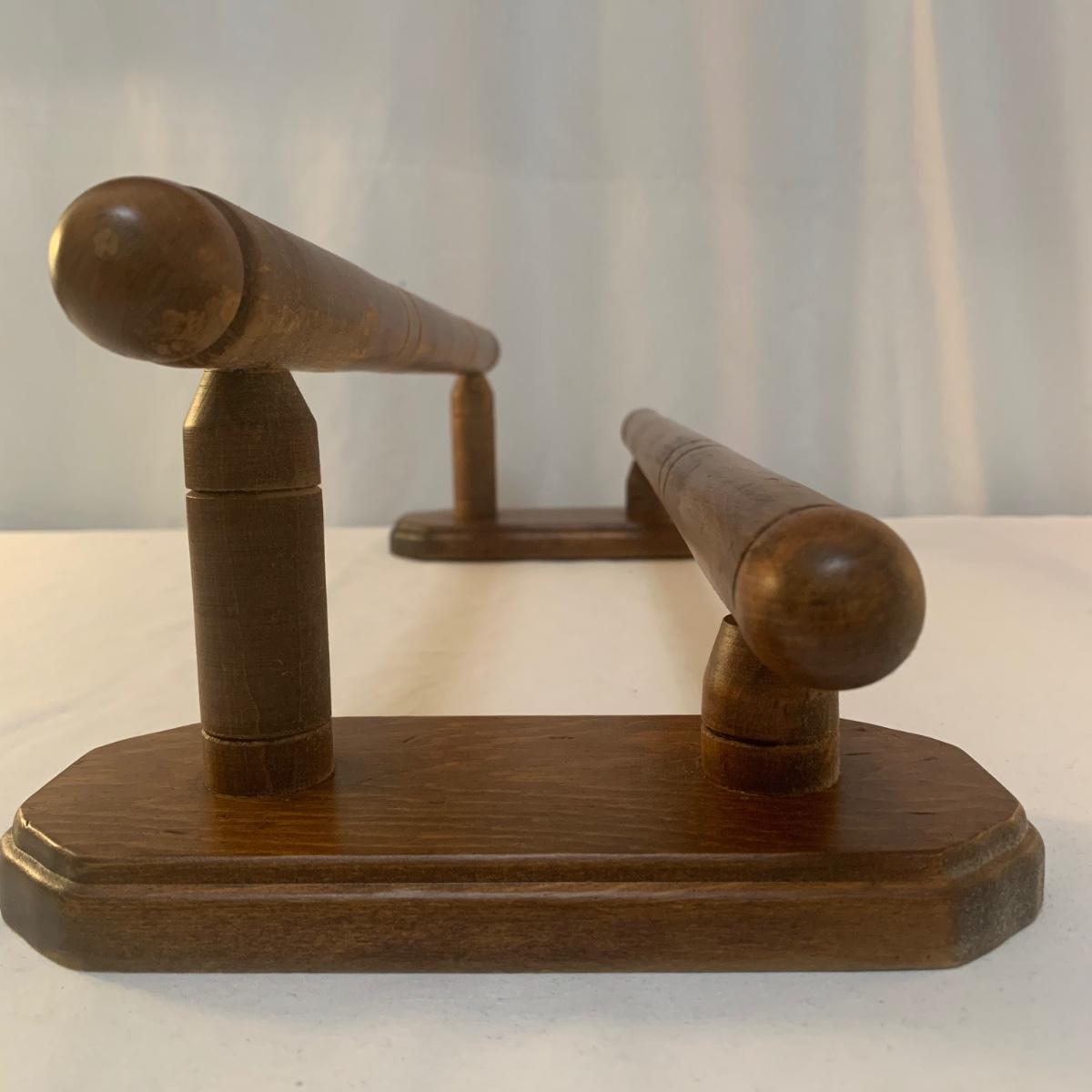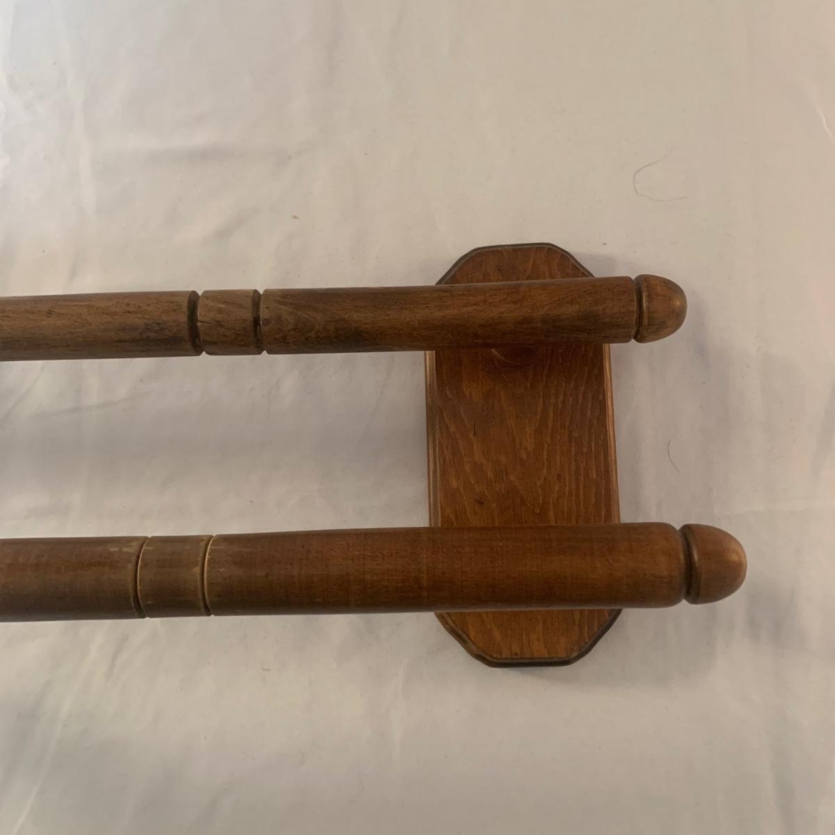 This assortment of handcrafted towel racks was made here in Asheville, NC by “Three Mountaineers”. Only one of the items has a brand sticker, so we cannot verify that all of these items are from Three Mountaineers. Lot includes three wood towel racks and small wood countertop organizer. Items show a little wear, but are overall in good condition. Please see photos for details. The largest rack measures 27”L. The base measures, 4.5”L x 3.5”W.