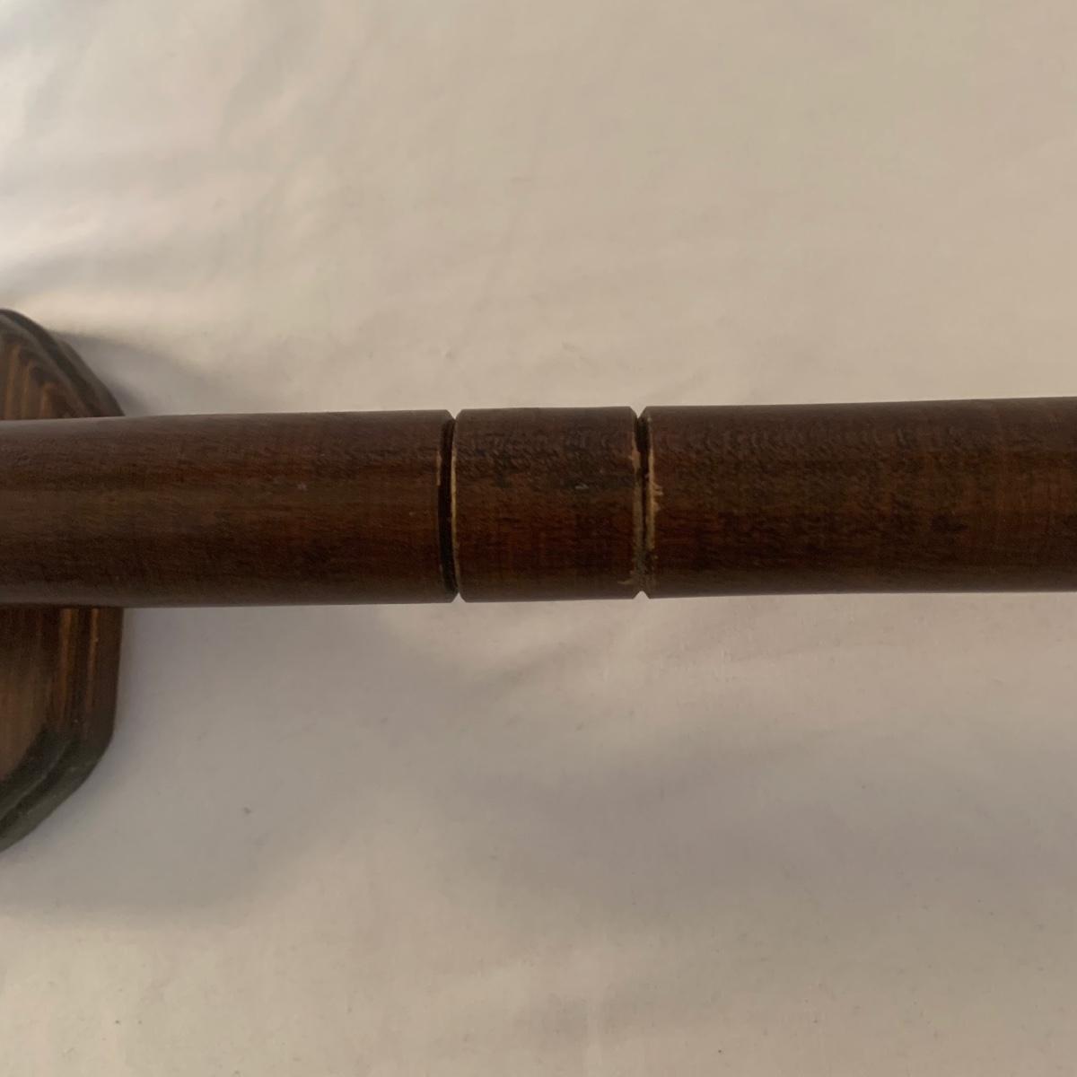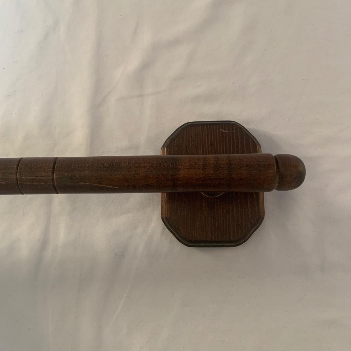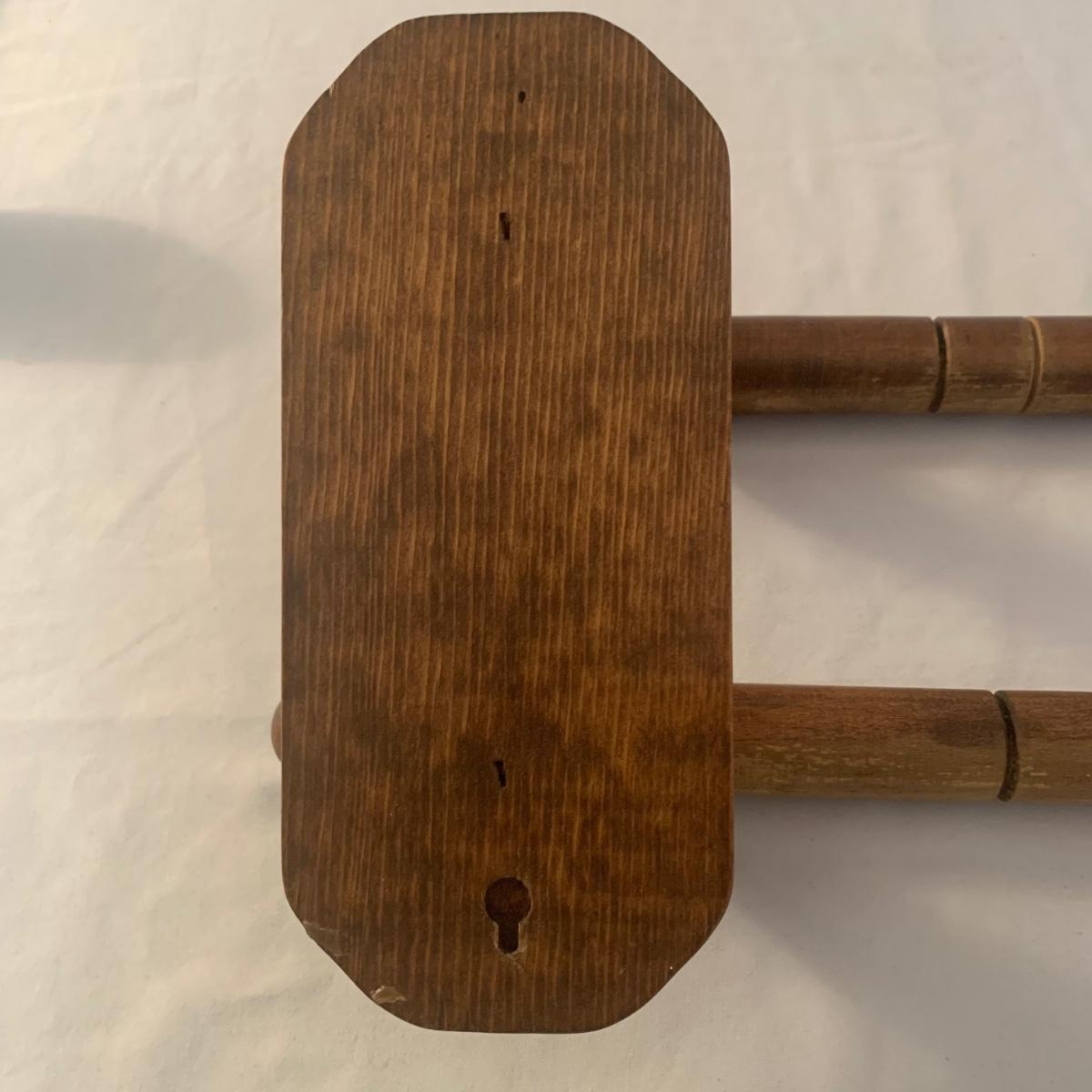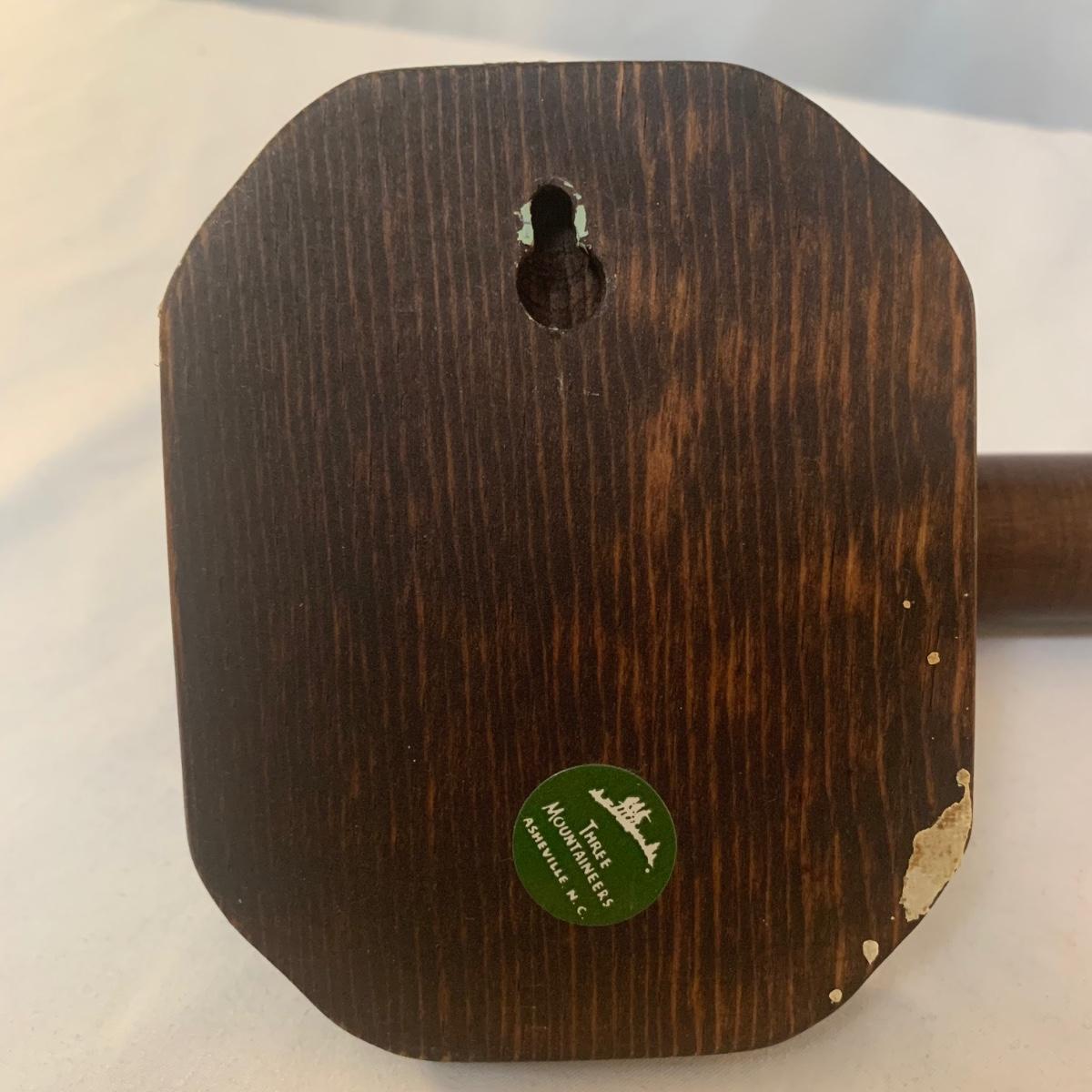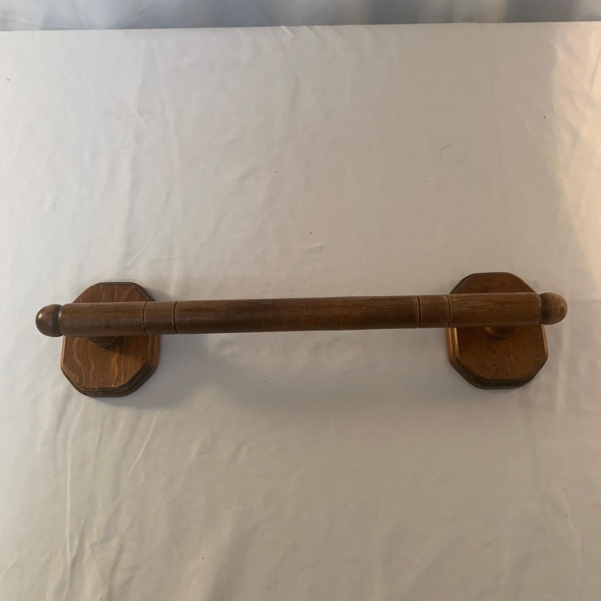 This assortment of handcrafted towel racks was made here in Asheville, NC by “Three Mountaineers”. Only one of the items has a brand sticker, so we cannot verify that all of these items are from Three Mountaineers. Lot includes three wood towel racks and small wood countertop organizer. Items show a little wear, but are overall in good condition. Please see photos for details. The largest rack measures 27”L. The base measures, 4.5”L x 3.5”W.
