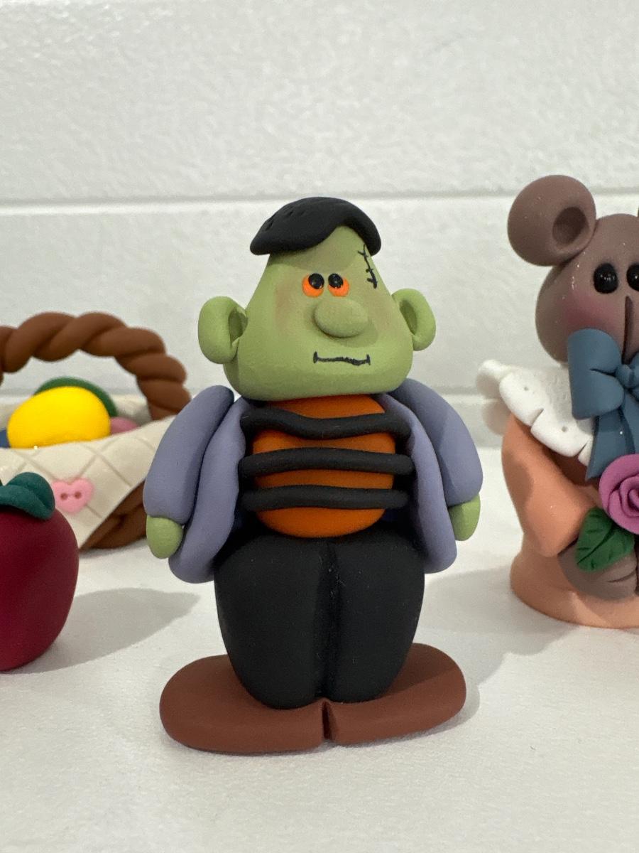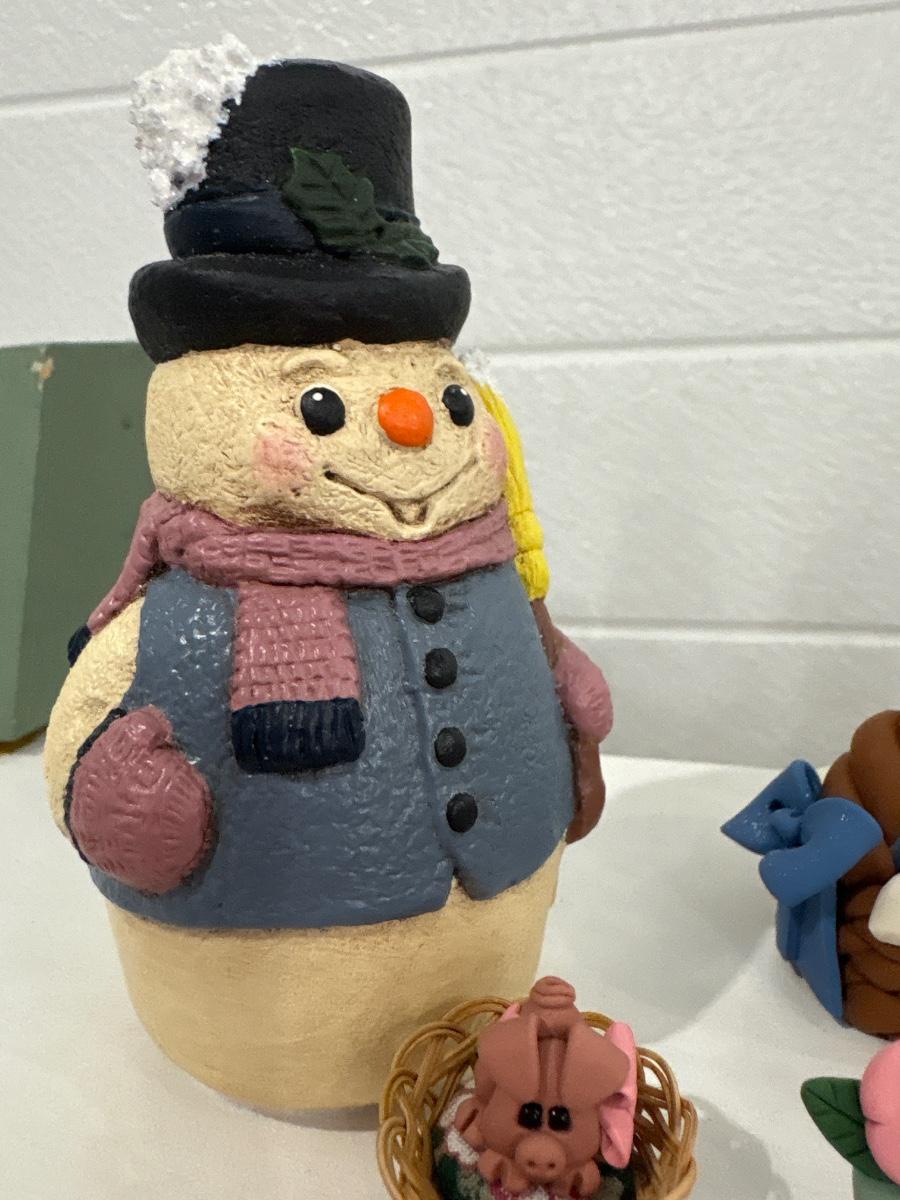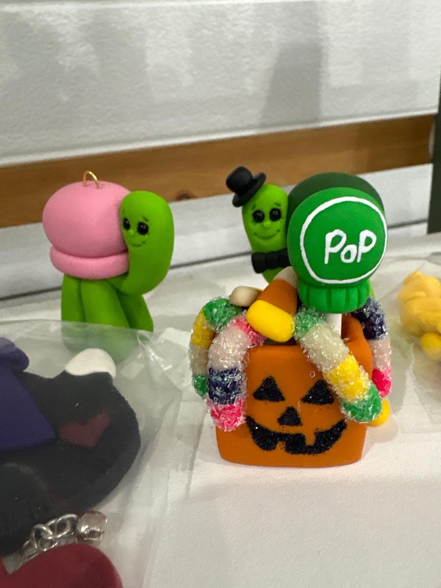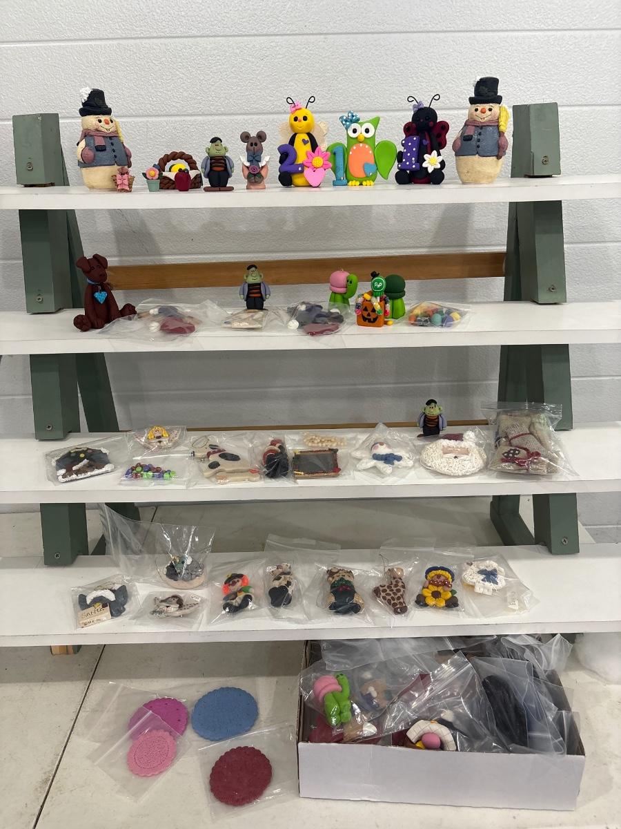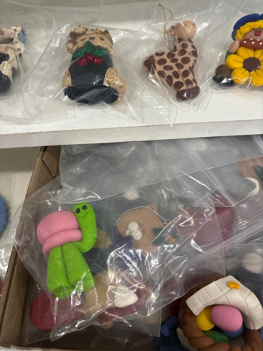 A large variety of handmade polymer clay figures. Includes snowmen, turtles, Halloween and more..