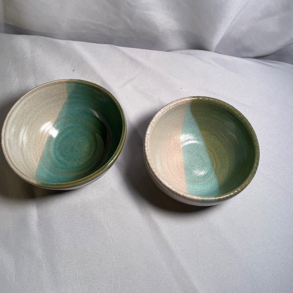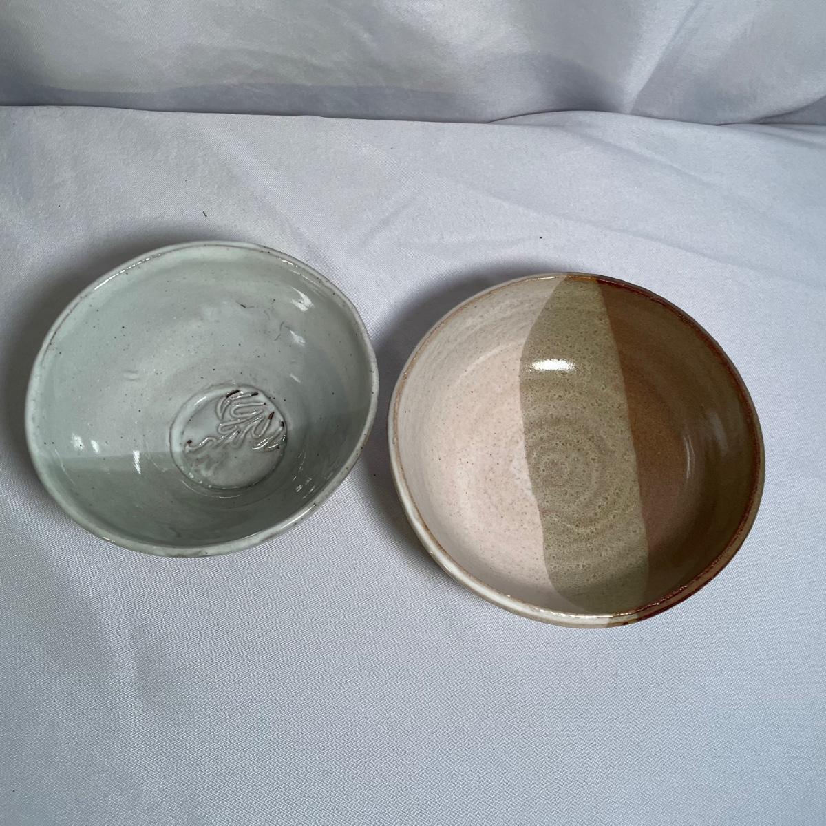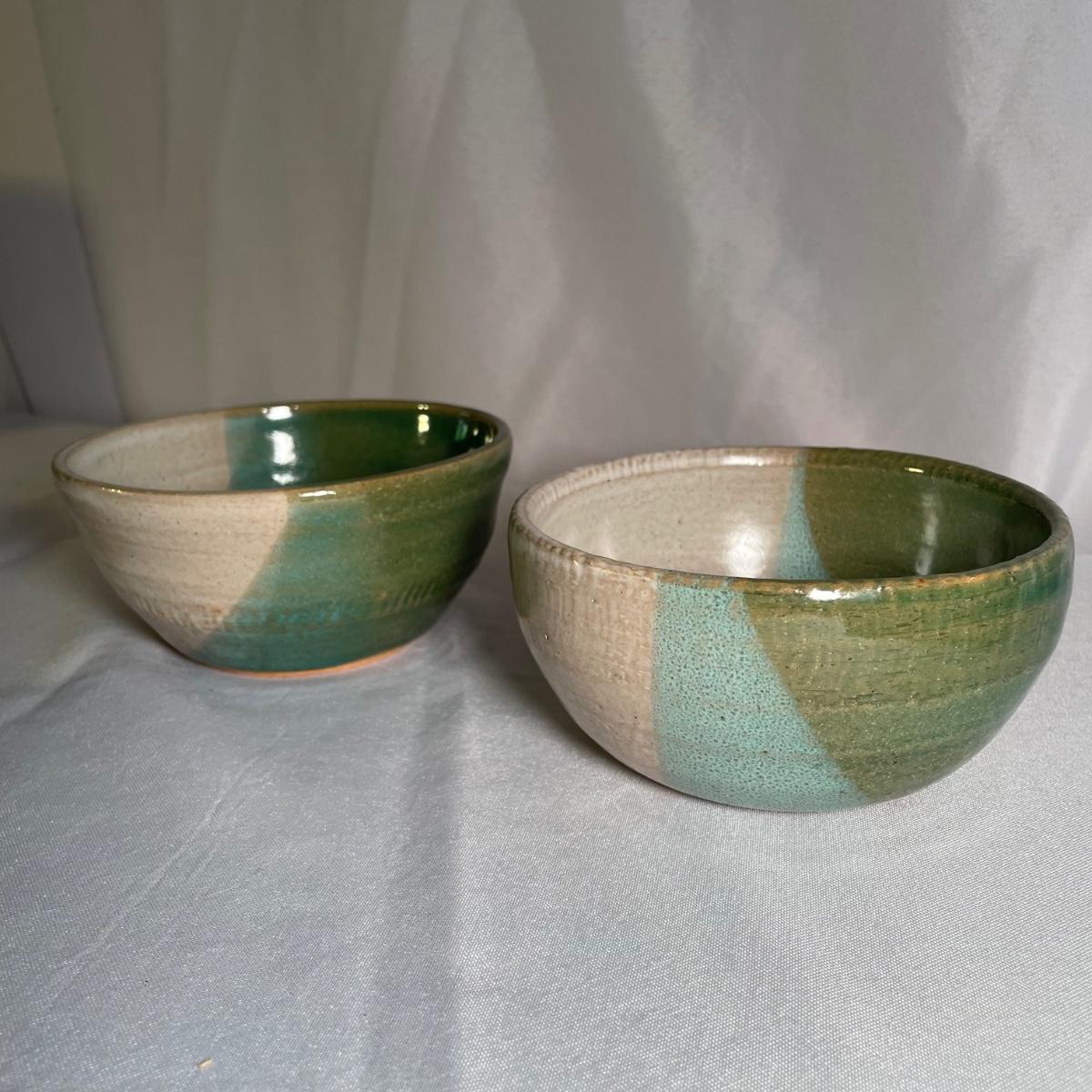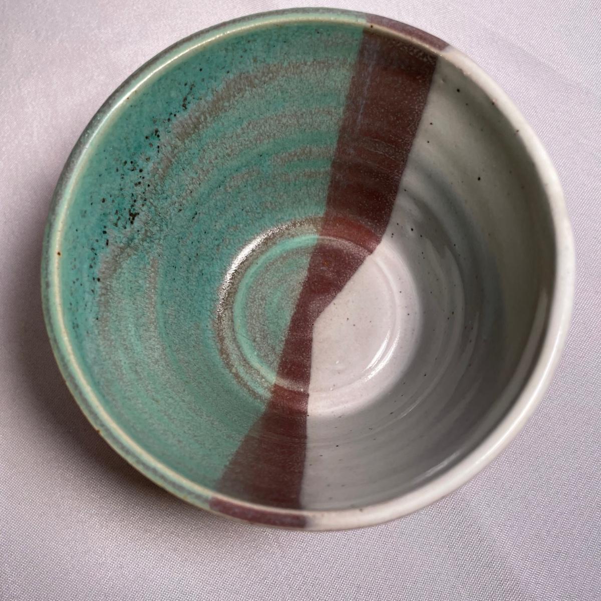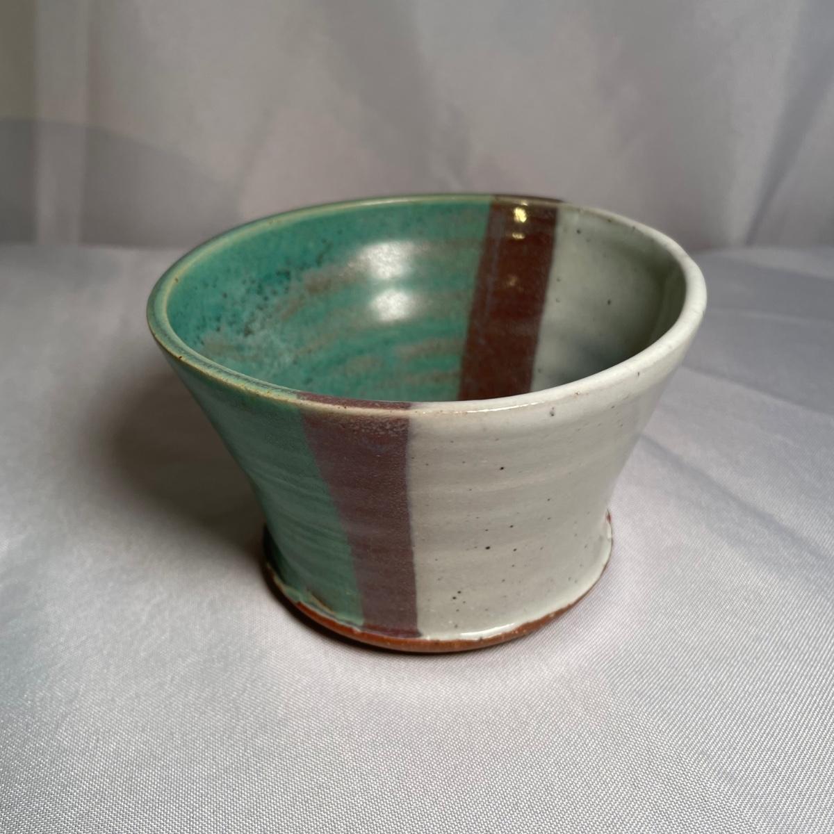 Widest diameter bowl (with brown stripe) measures 5.5” d x 2” tall.