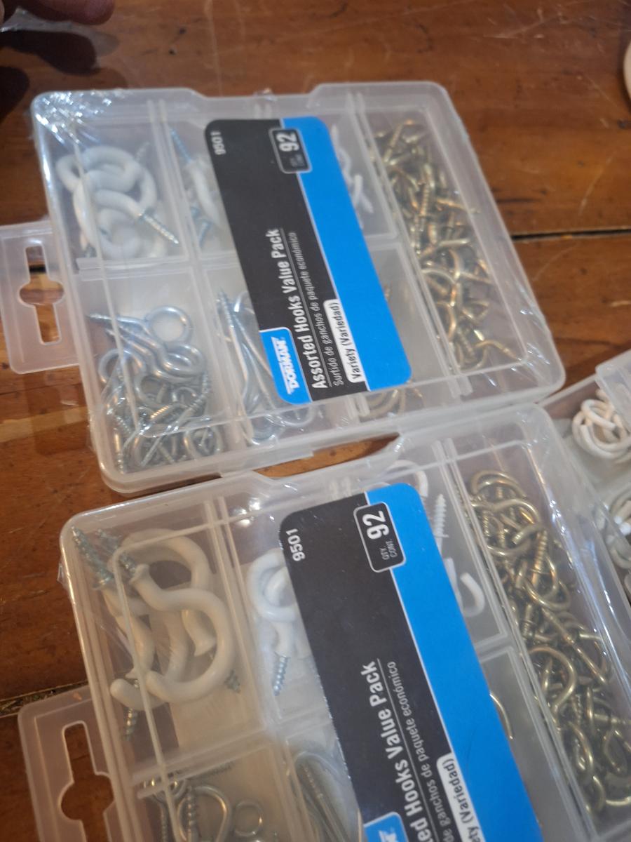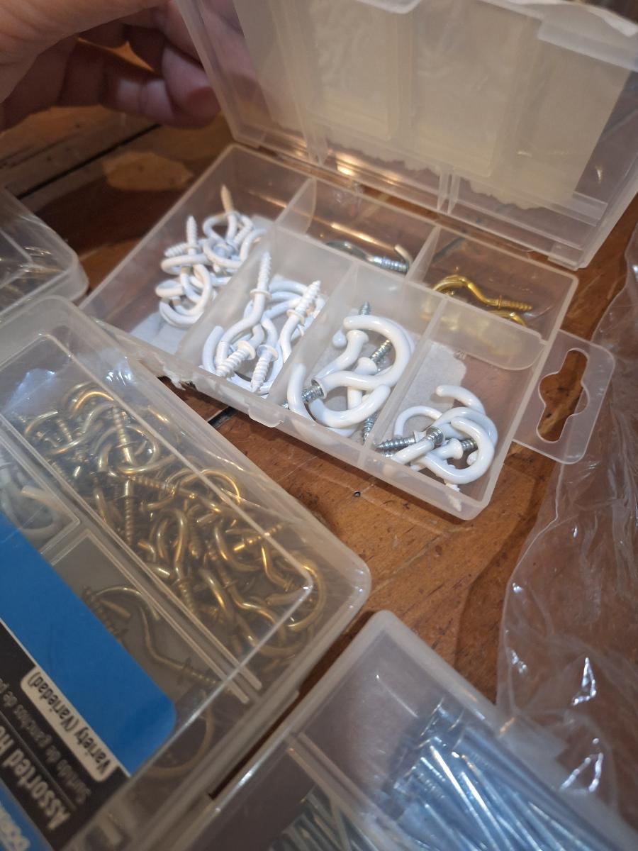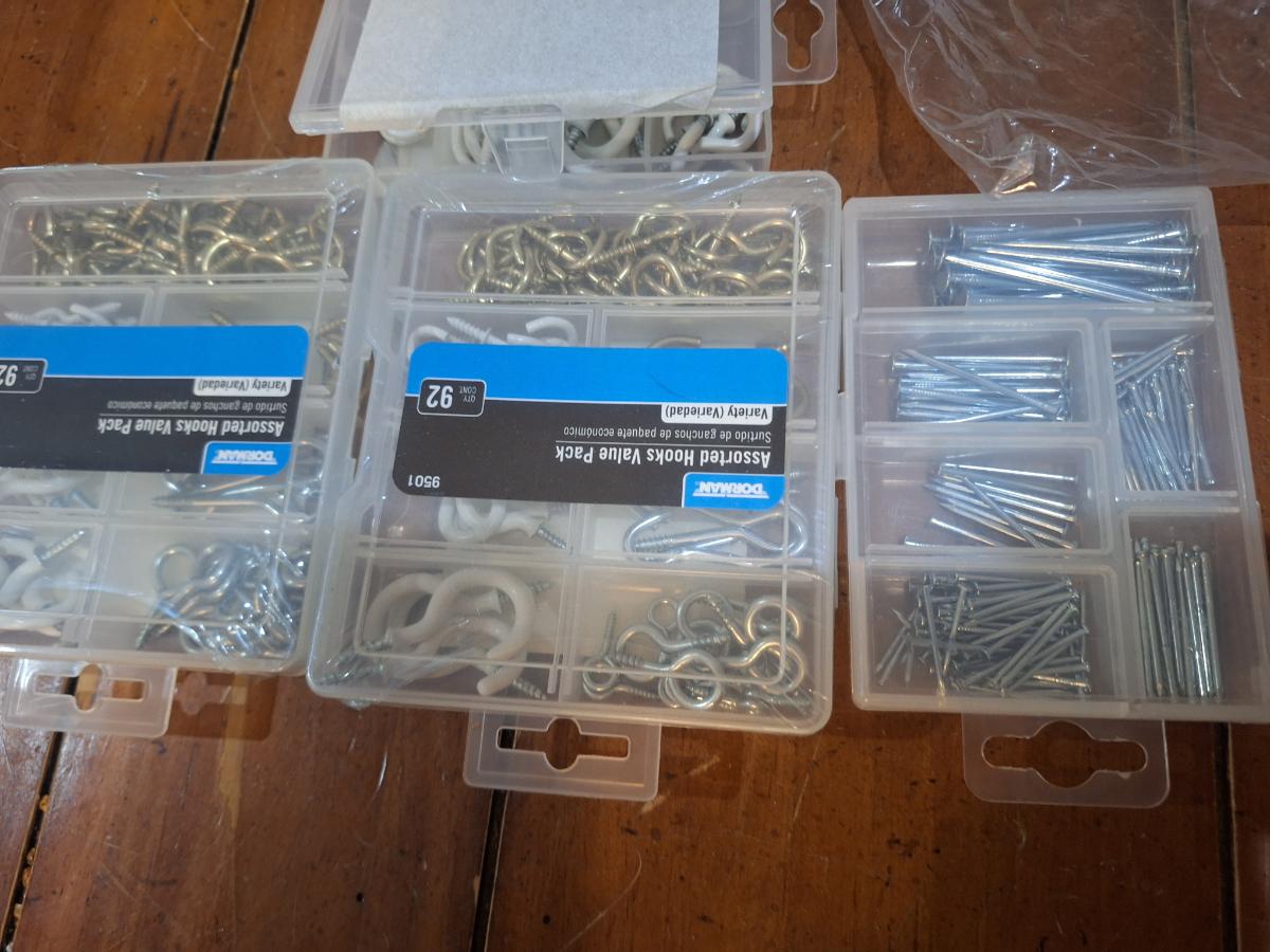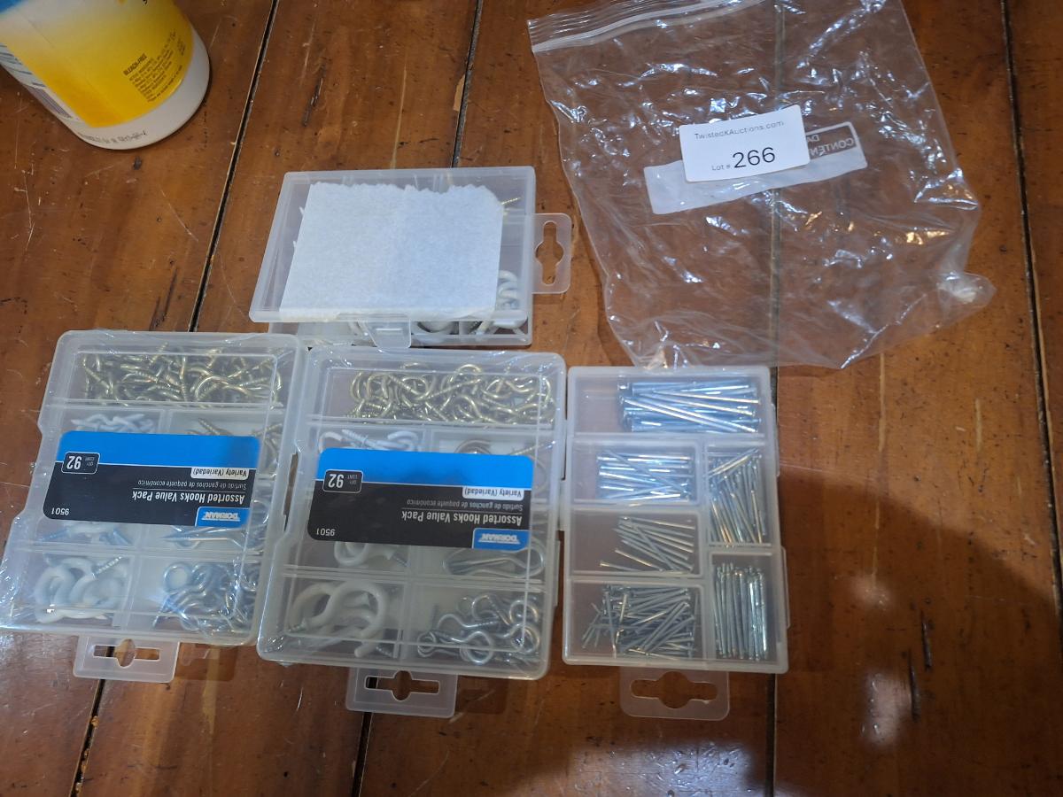 assortment of hardware, nails, screws, cup hooks etc.