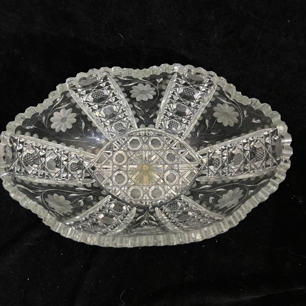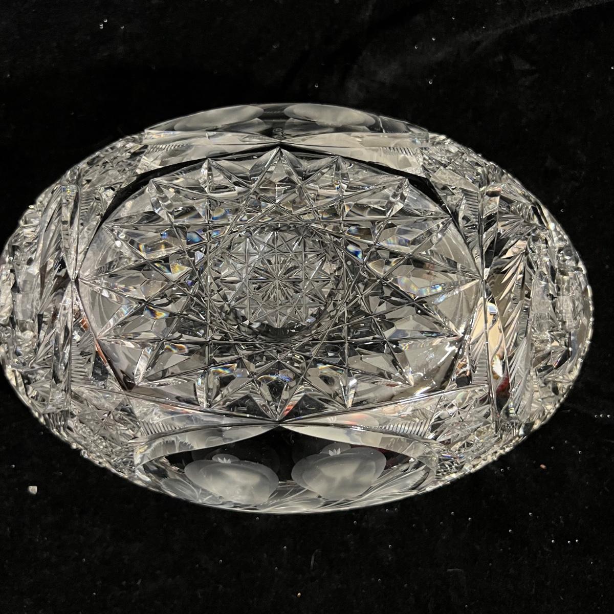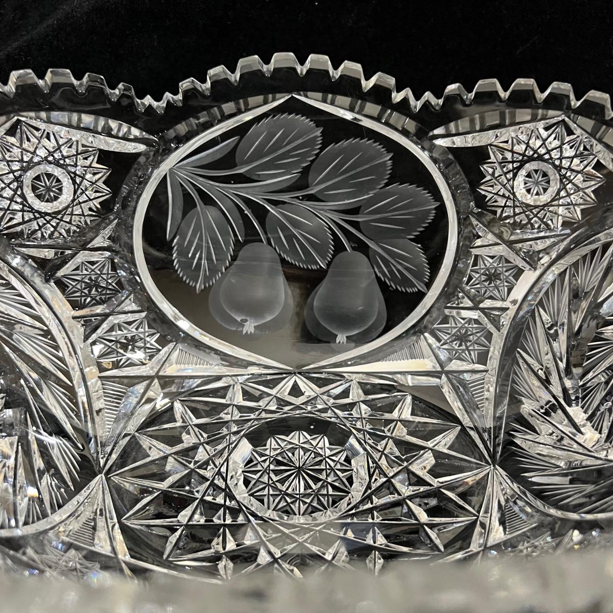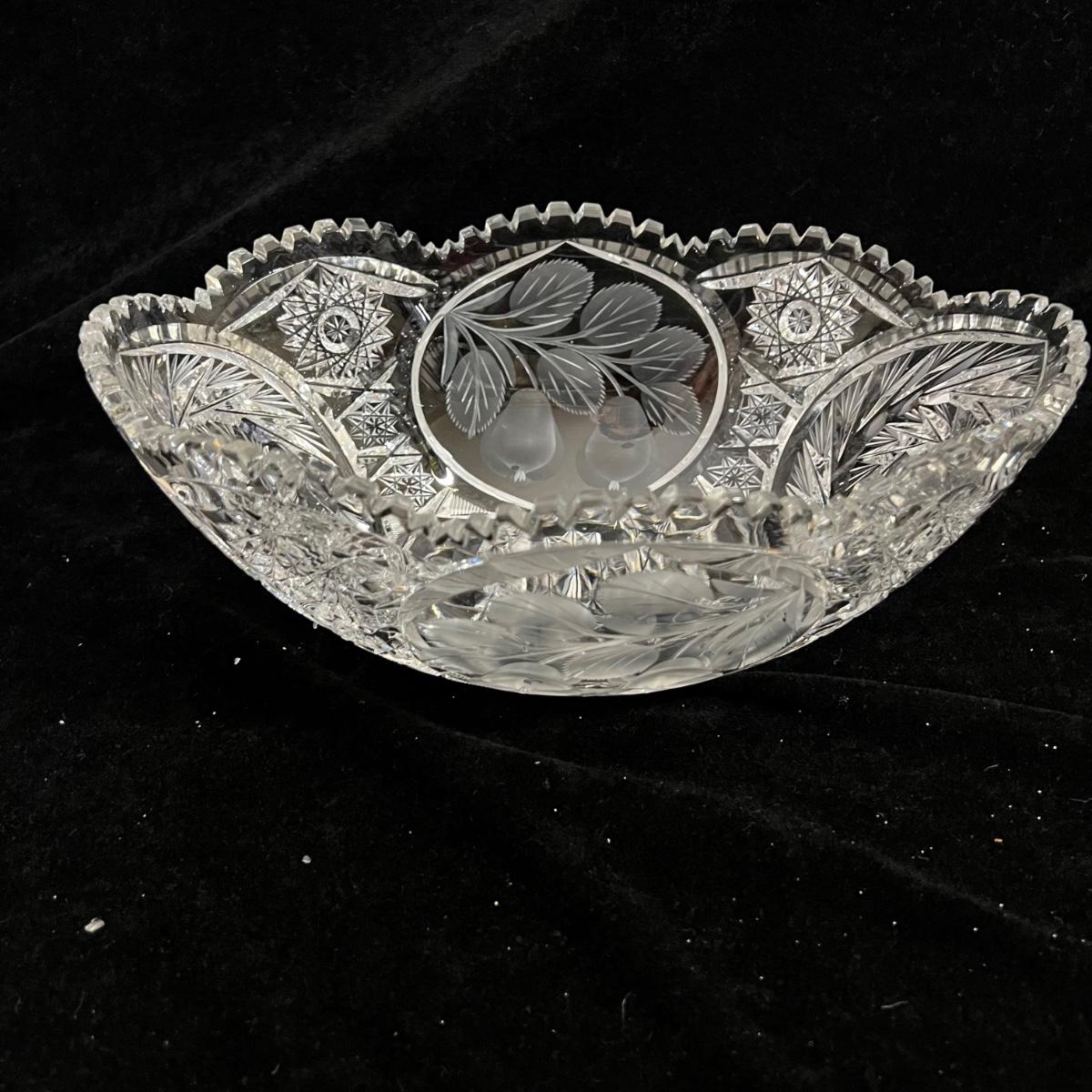 Lovely Hobstar patterned crystal bowls with floral and pear motifs. Largest oval bowl is 11.5”L x 7.5”W x 4.5”T, it is etched with pears and leaves. Large basket-like oval bowl has a small chip on the edge as shown in the photographs. Slightly smaller oval bowl has a flower pattern. Six salt cellar bowls measure 1.5”D x 1”H and a lovely round dish is 6”D x 1.25”H. Shipping available.