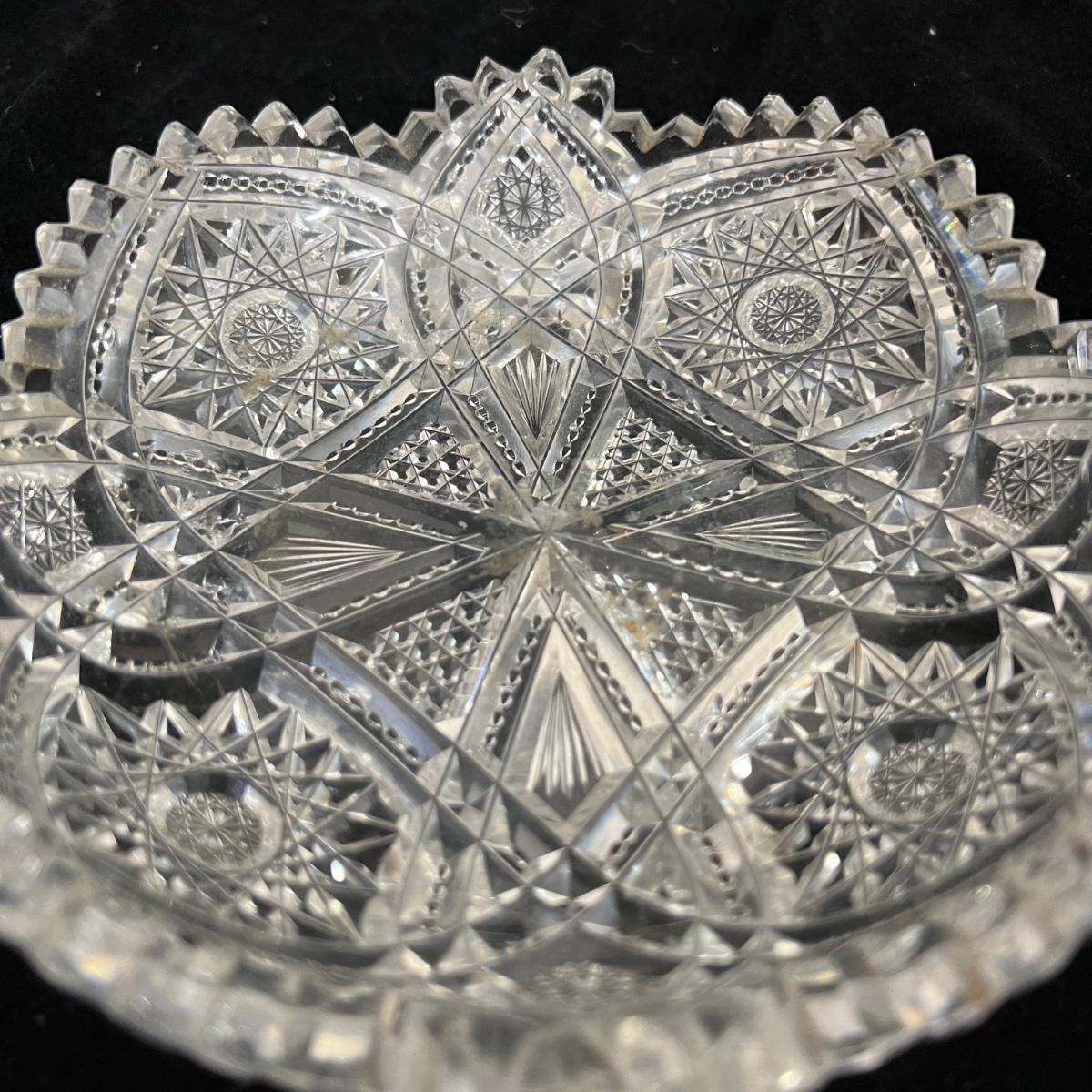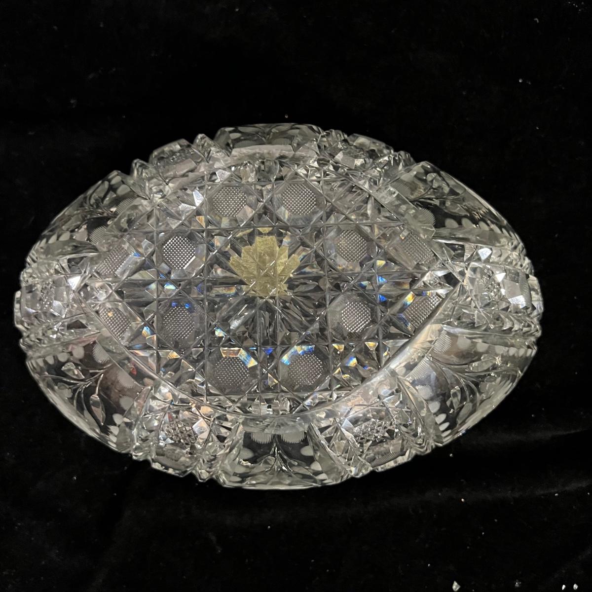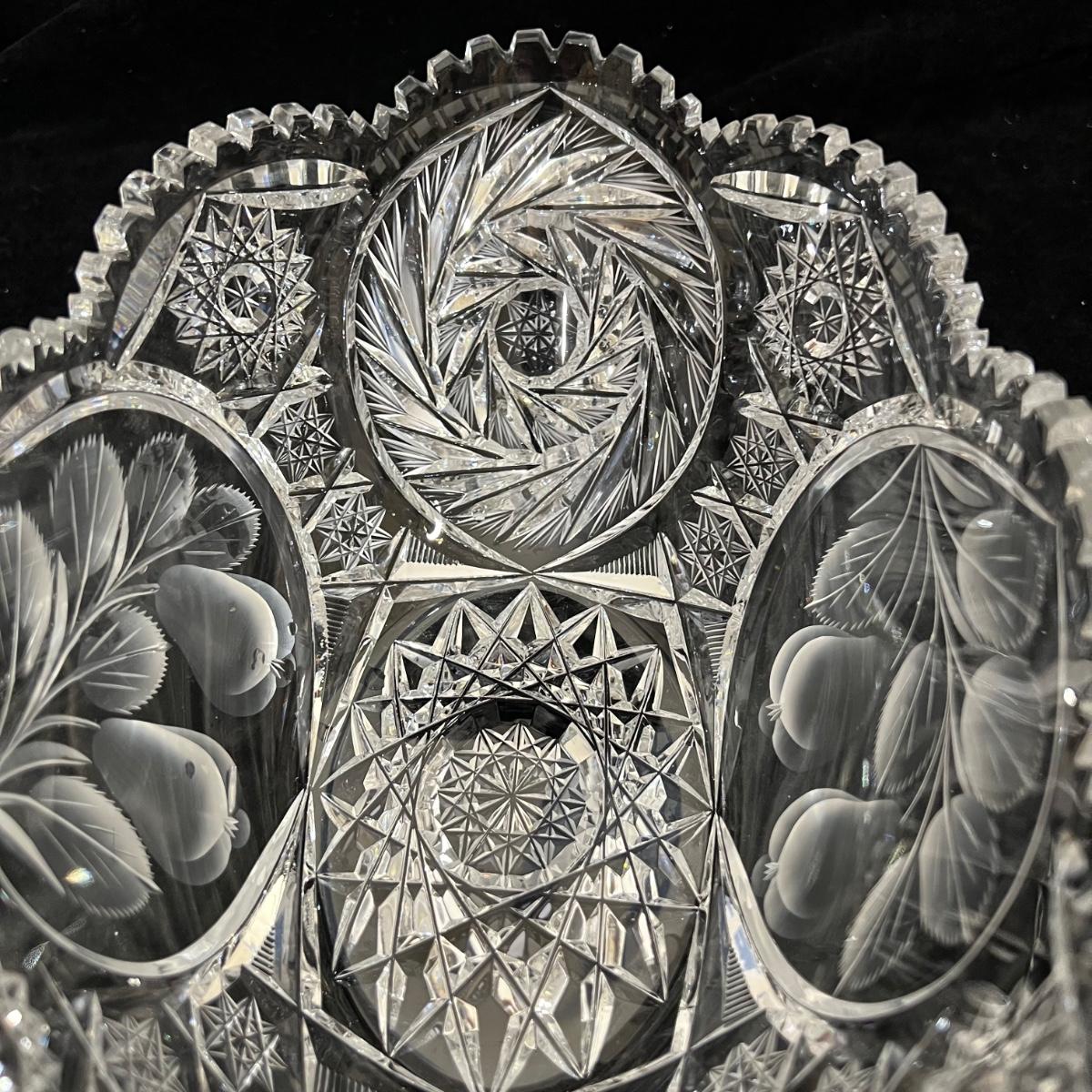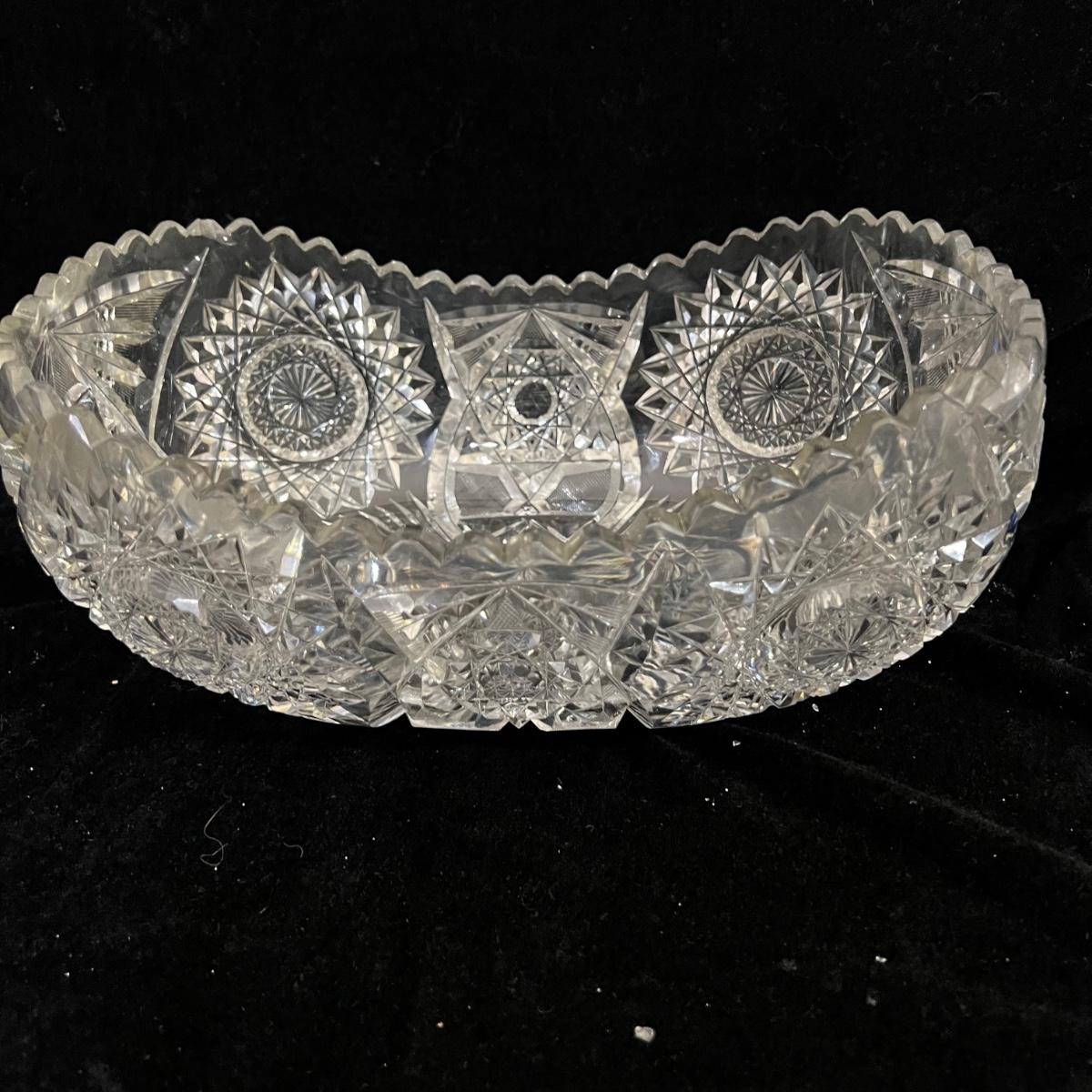 Lovely Hobstar patterned crystal bowls with floral and pear motifs. Largest oval bowl is 11.5”L x 7.5”W x 4.5”T, it is etched with pears and leaves. Large basket-like oval bowl has a small chip on the edge as shown in the photographs. Slightly smaller oval bowl has a flower pattern. Six salt cellar bowls measure 1.5”D x 1”H and a lovely round dish is 6”D x 1.25”H. Shipping available.