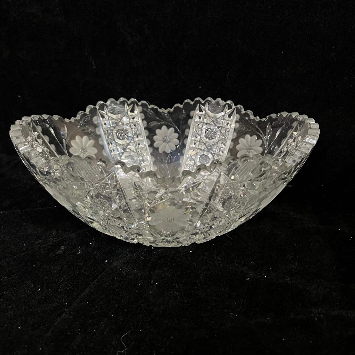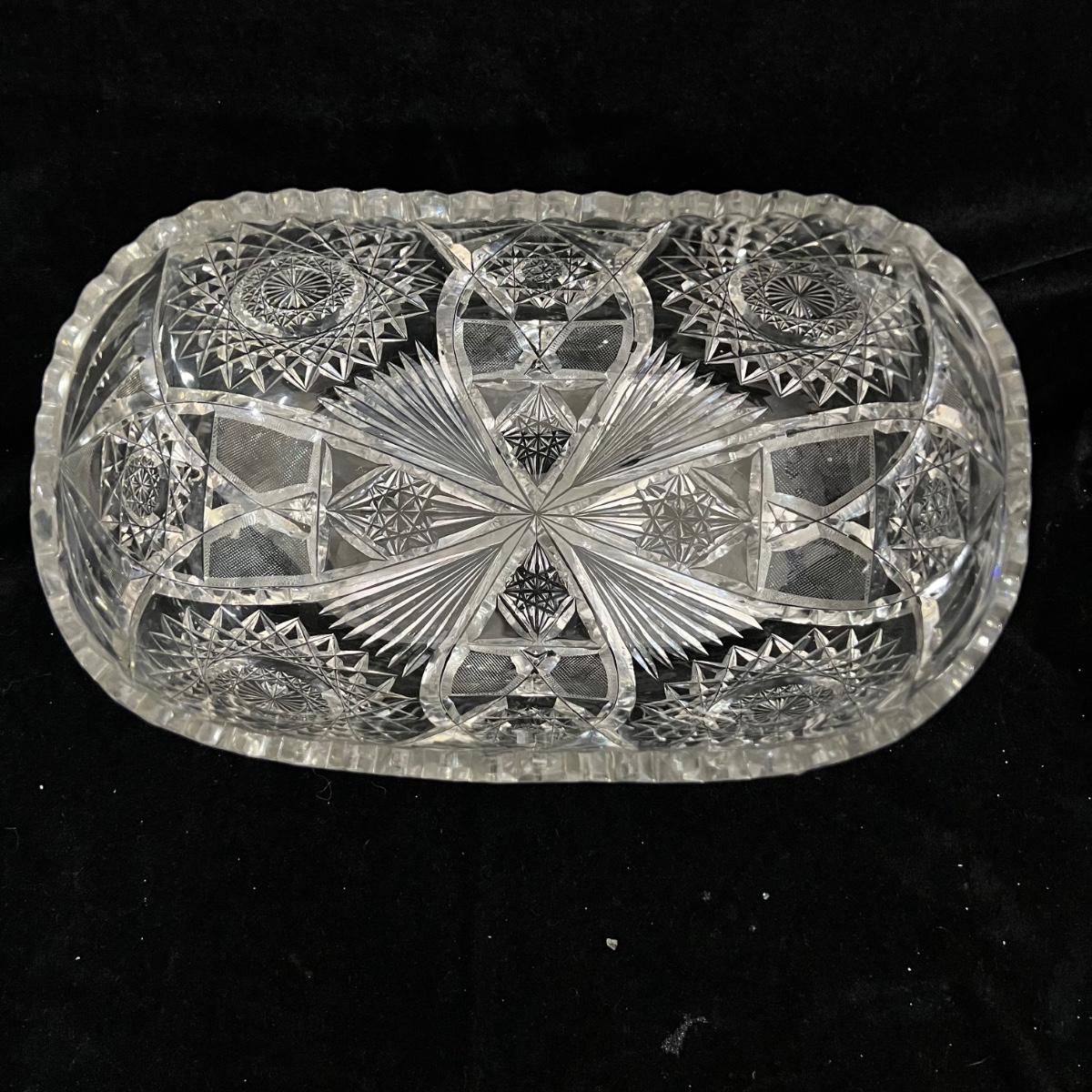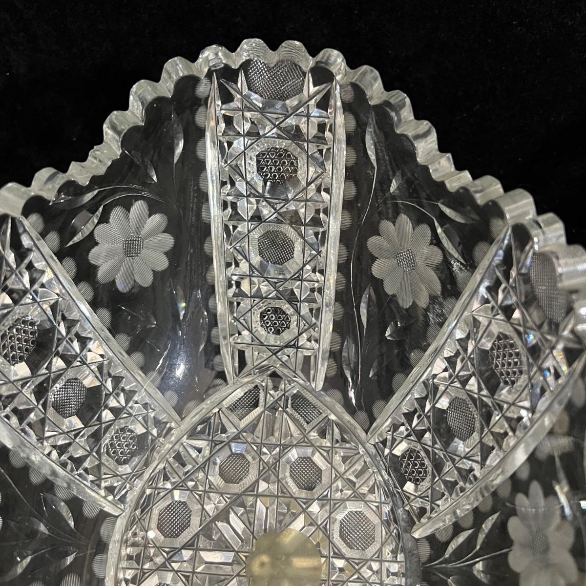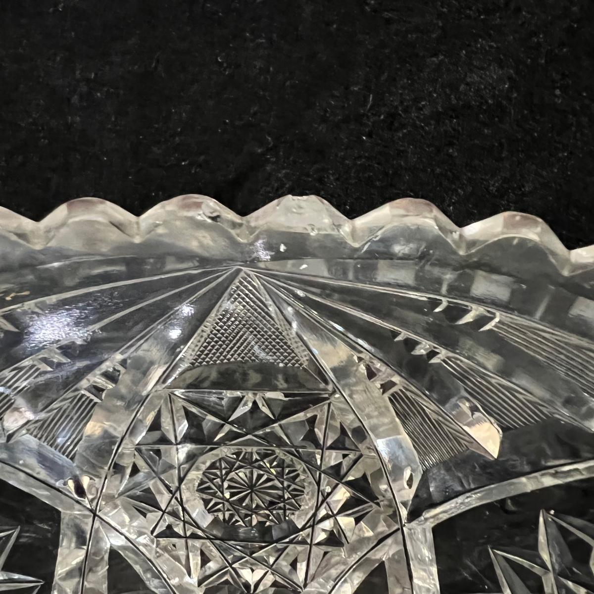 Lovely Hobstar patterned crystal bowls with floral and pear motifs. Largest oval bowl is 11.5”L x 7.5”W x 4.5”T, it is etched with pears and leaves. Large basket-like oval bowl has a small chip on the edge as shown in the photographs. Slightly smaller oval bowl has a flower pattern. Six salt cellar bowls measure 1.5”D x 1”H and a lovely round dish is 6”D x 1.25”H. Shipping available.