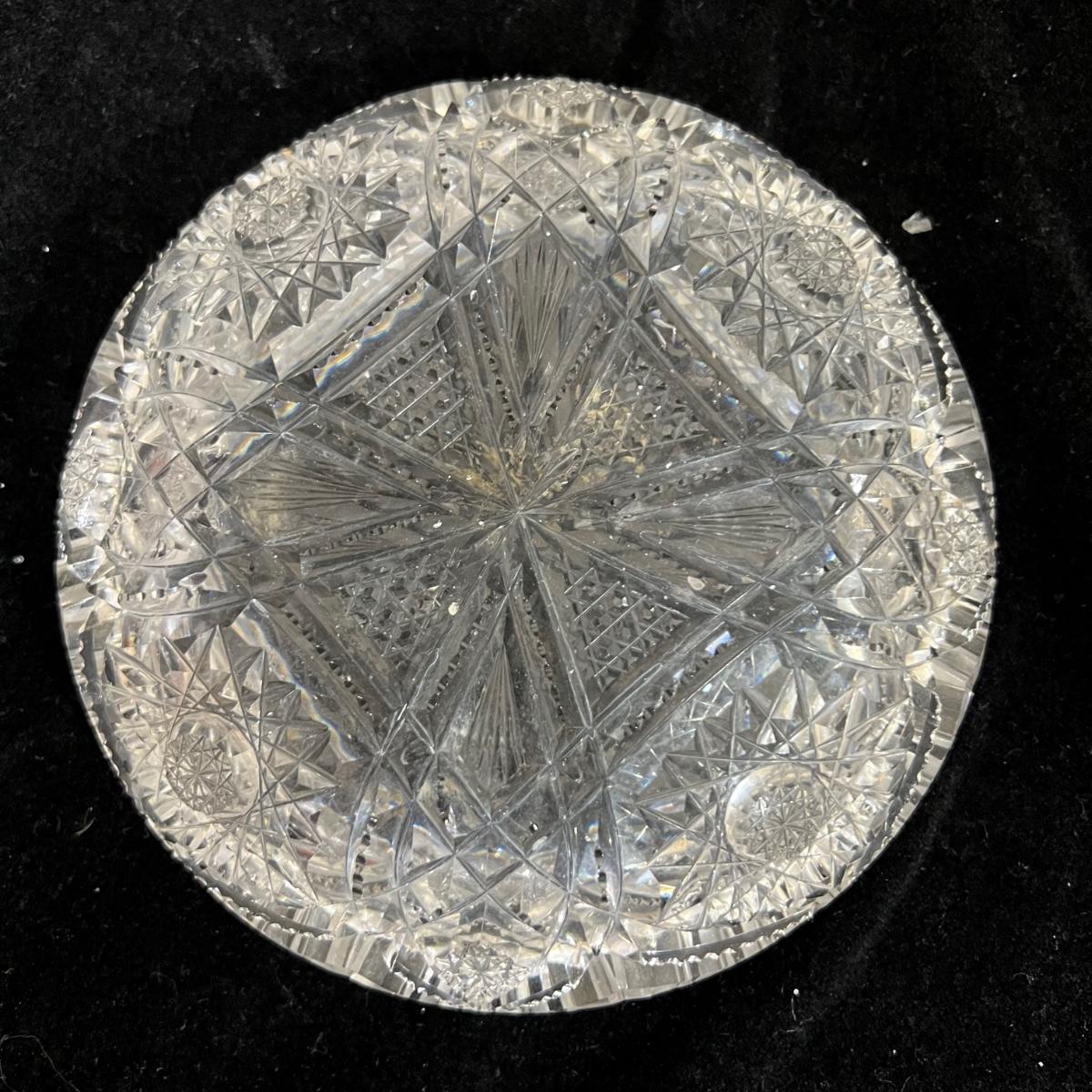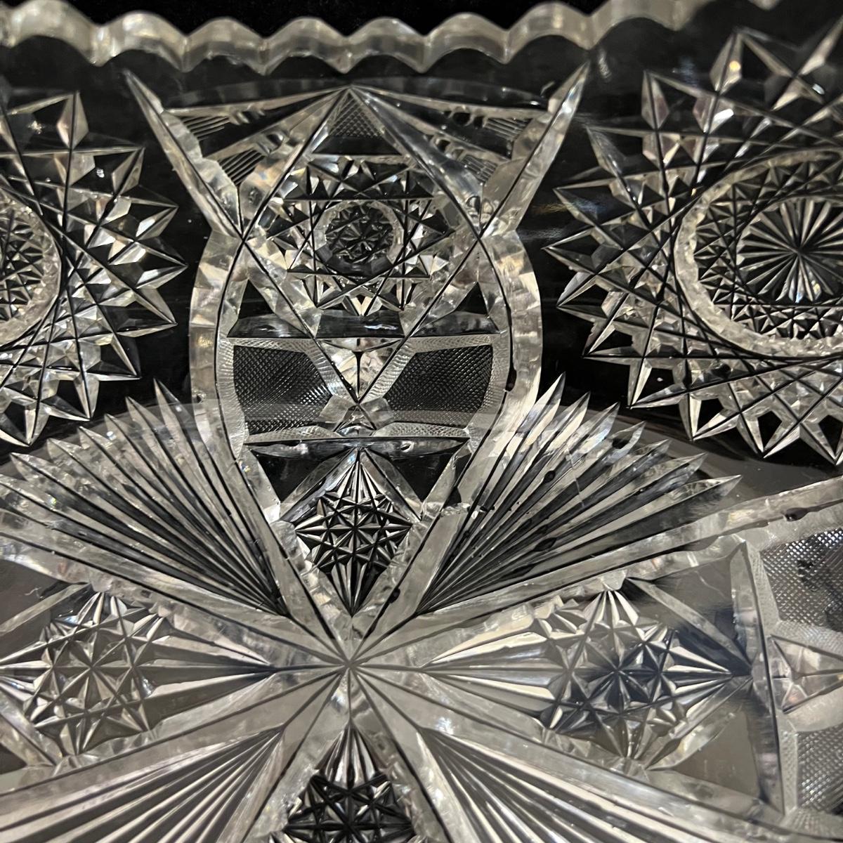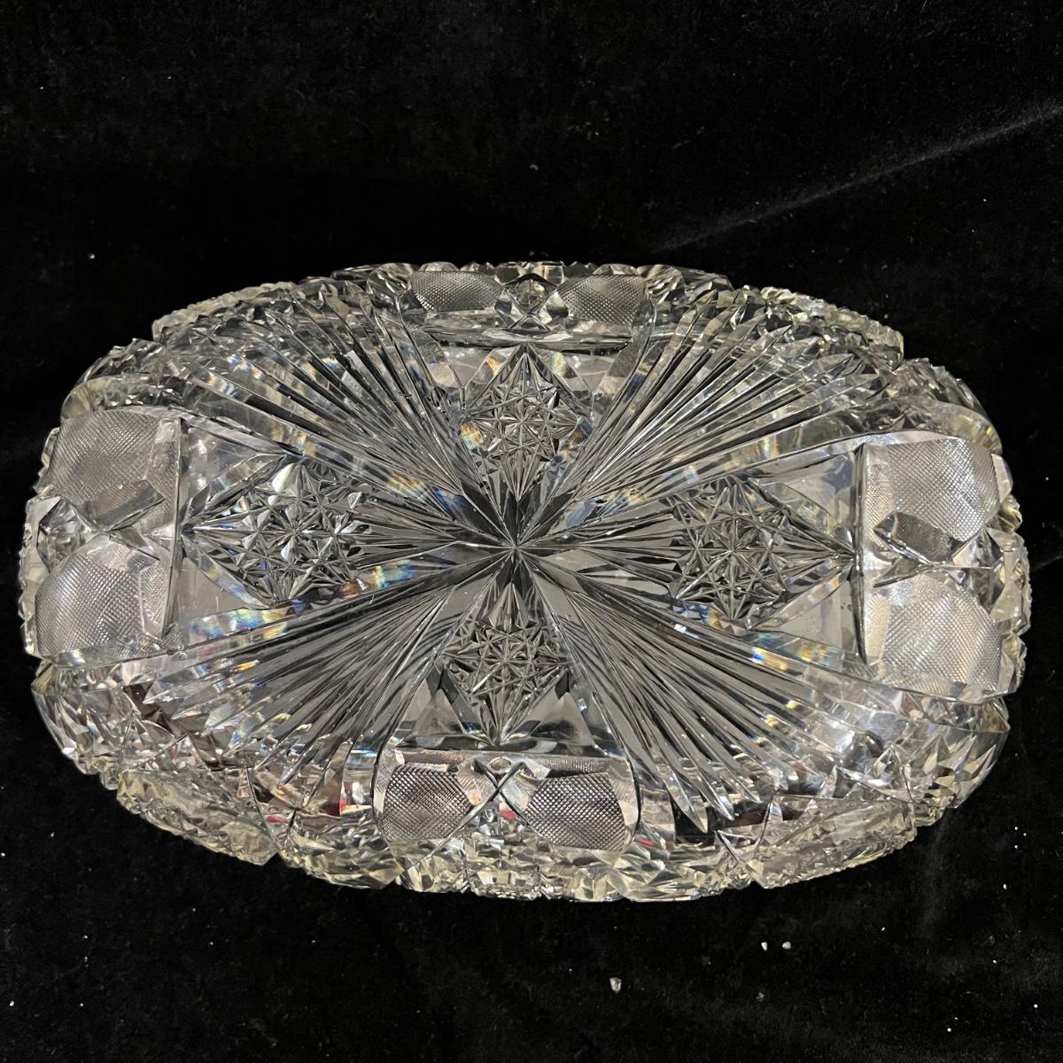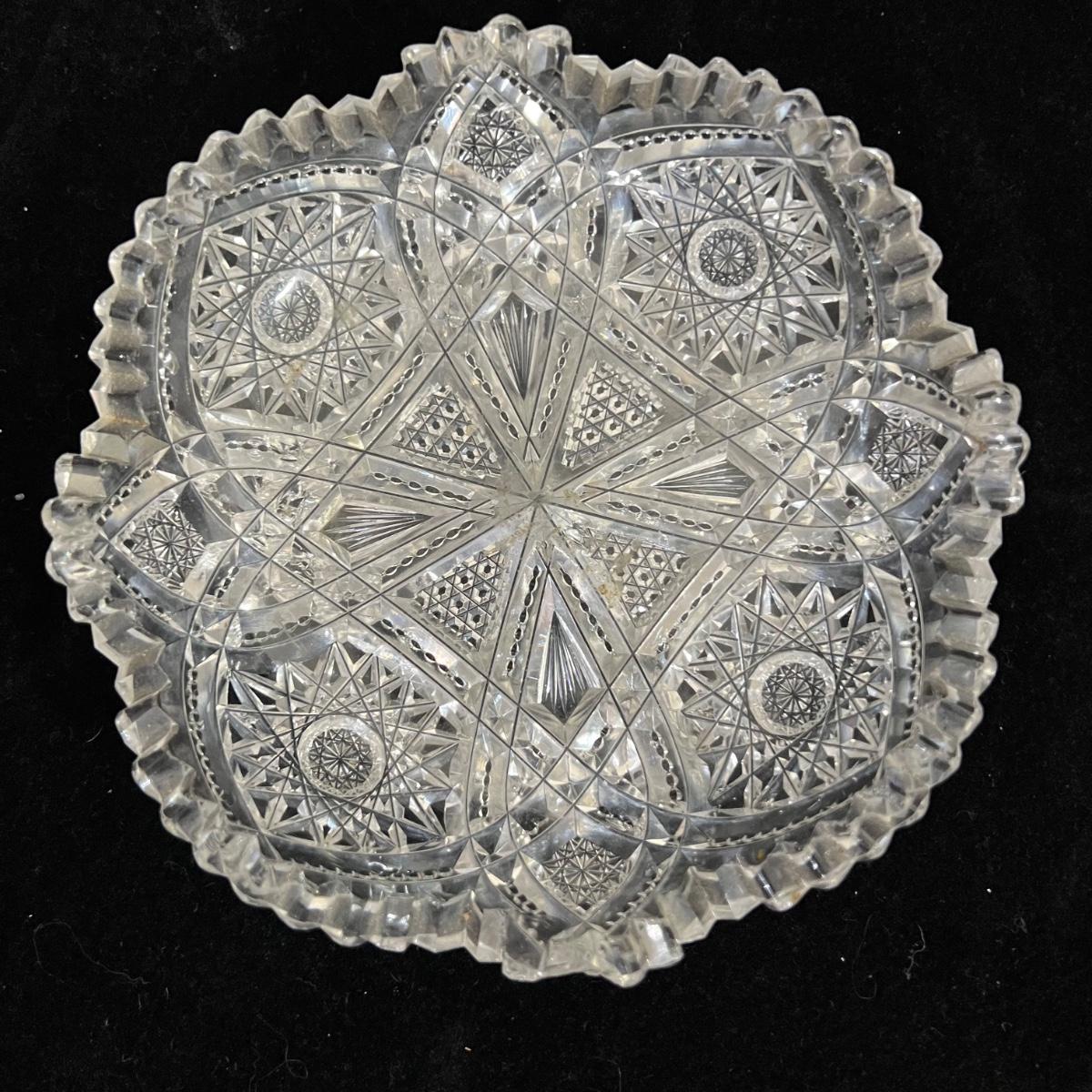 Lovely Hobstar patterned crystal bowls with floral and pear motifs. Largest oval bowl is 11.5”L x 7.5”W x 4.5”T, it is etched with pears and leaves. Large basket-like oval bowl has a small chip on the edge as shown in the photographs. Slightly smaller oval bowl has a flower pattern. Six salt cellar bowls measure 1.5”D x 1”H and a lovely round dish is 6”D x 1.25”H. Shipping available.