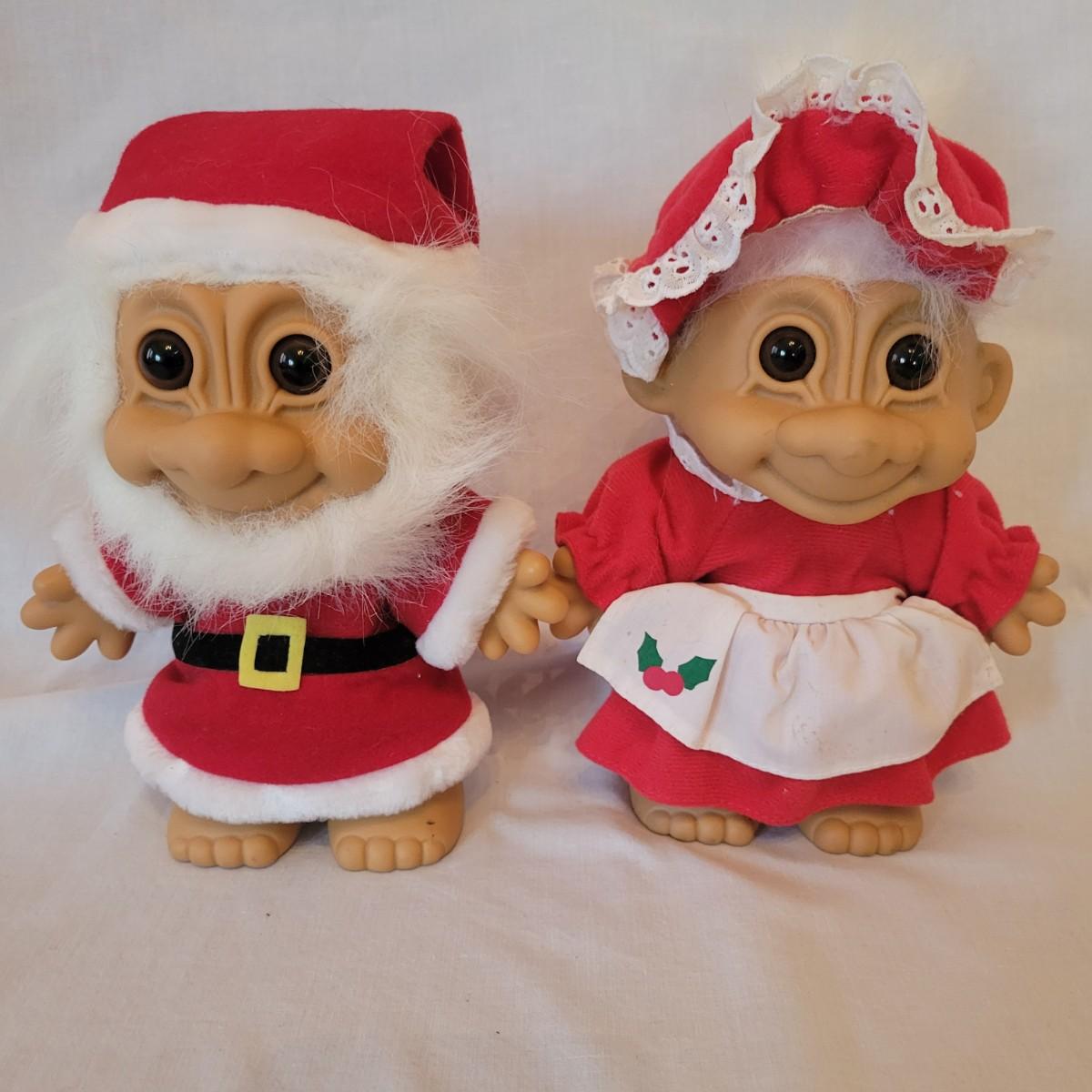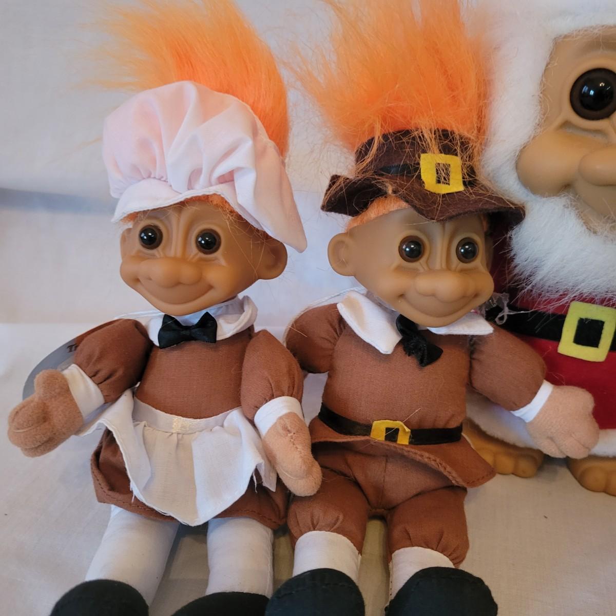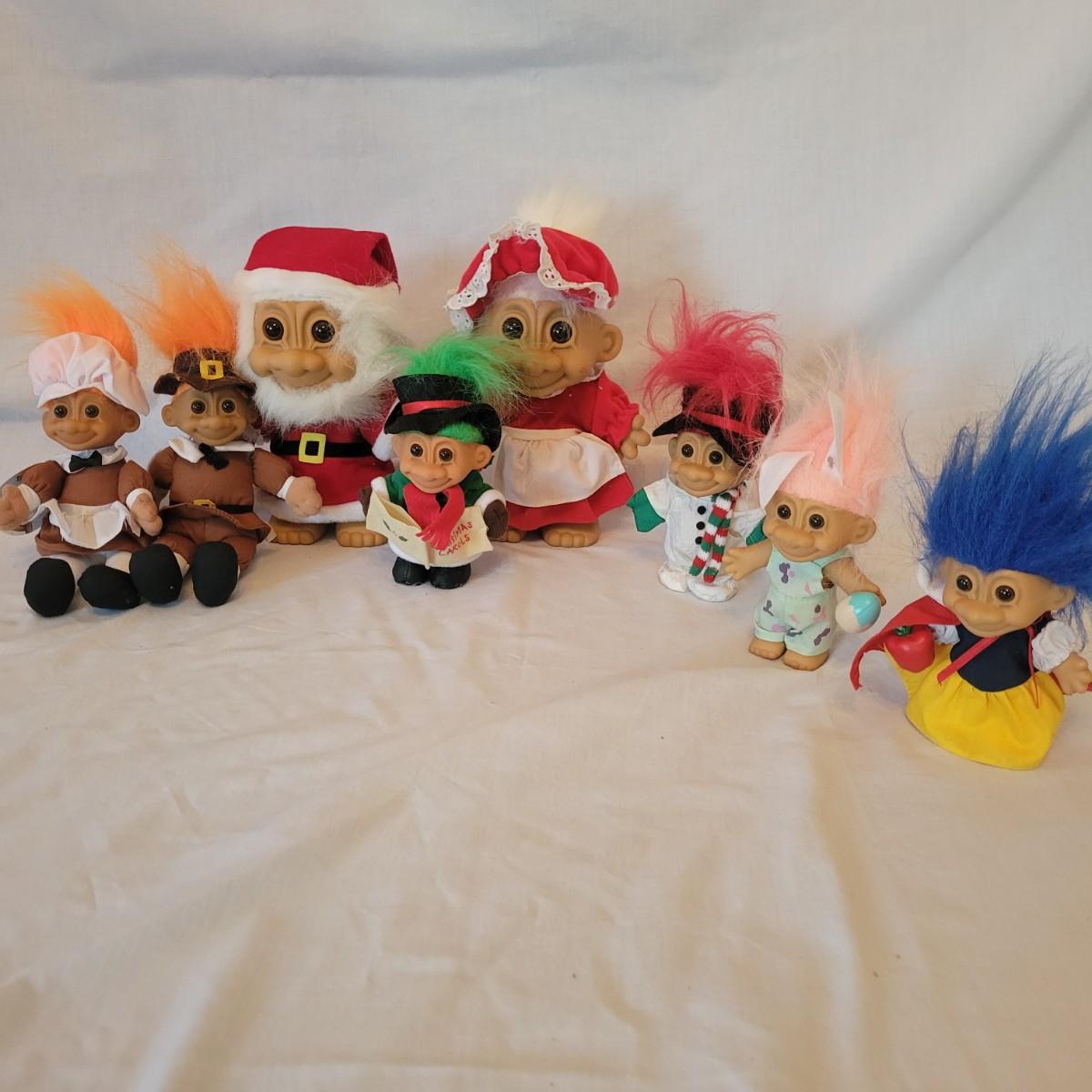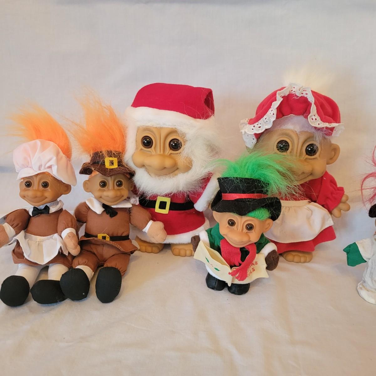 An assortment of eight holiday trolls. This assortment features Thanksgiving, Christmas, Easter and even a Snow White troll. The largest Christmas trolls measure approximately 6" x 4.5" x 10". Shipping available