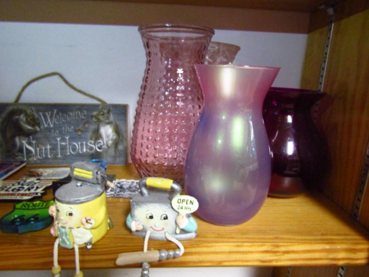 Assortment of Home Decor- Glass Vases, Magnets, Shelf-Sitters, Witty Signs, etc. Please see all pictures.