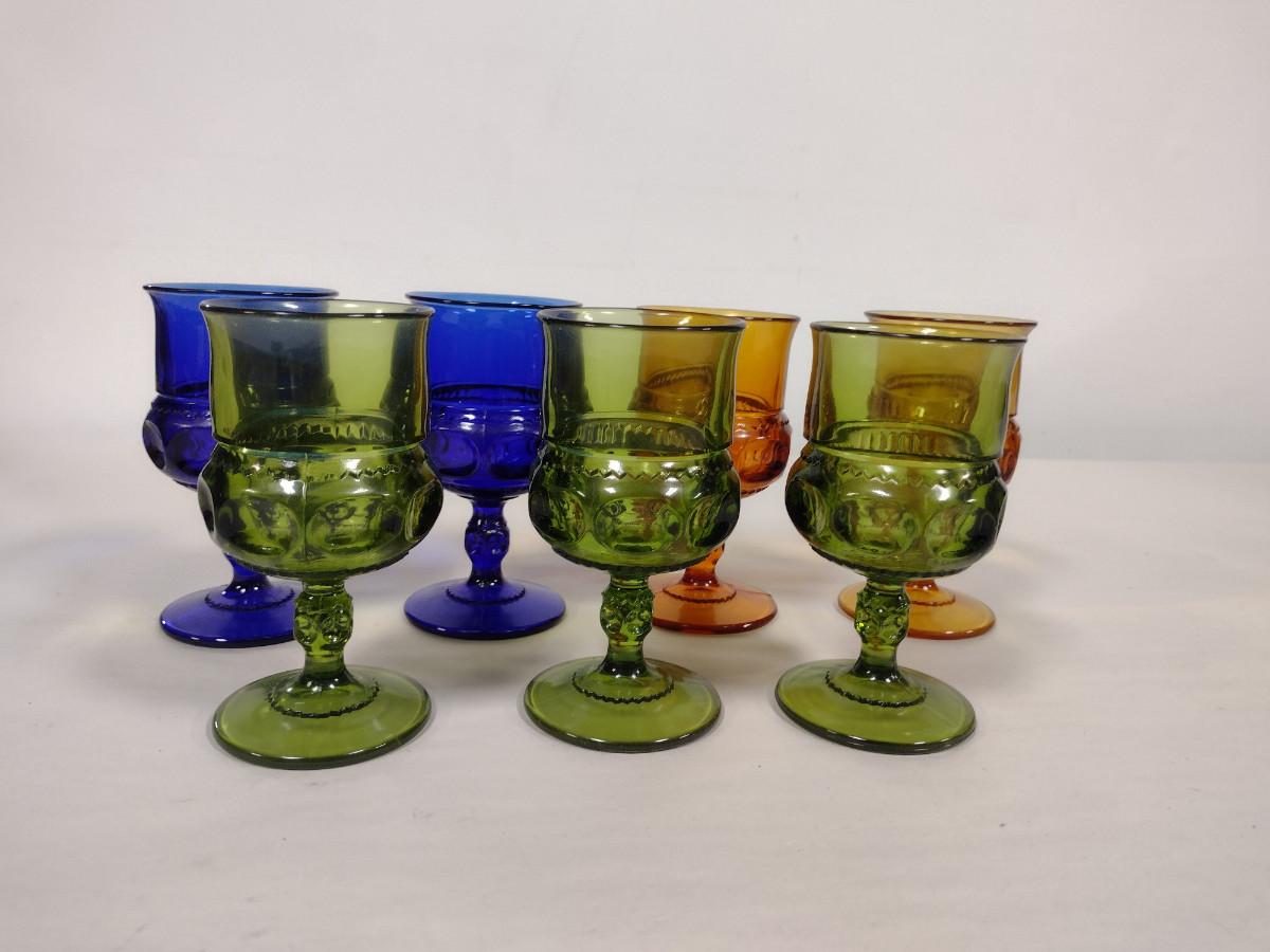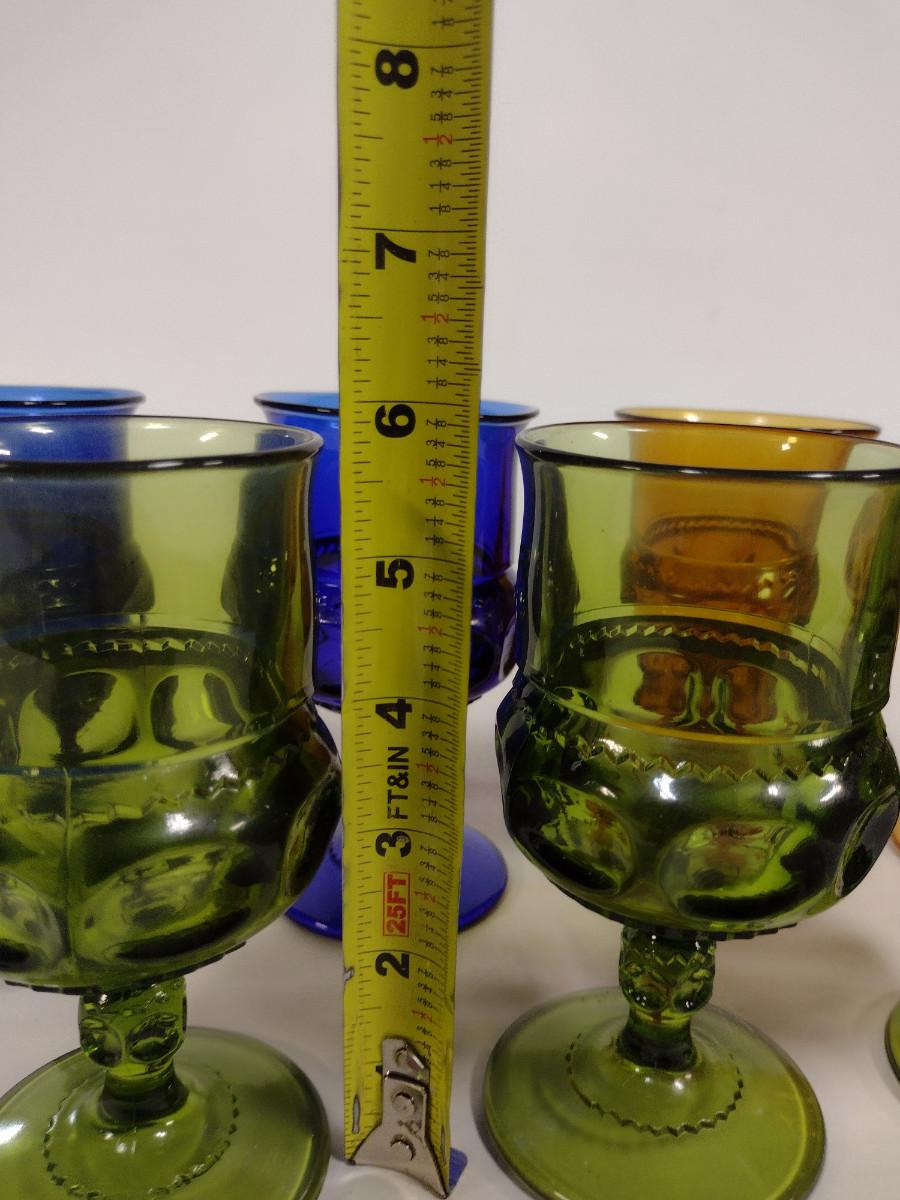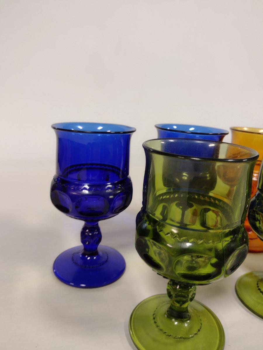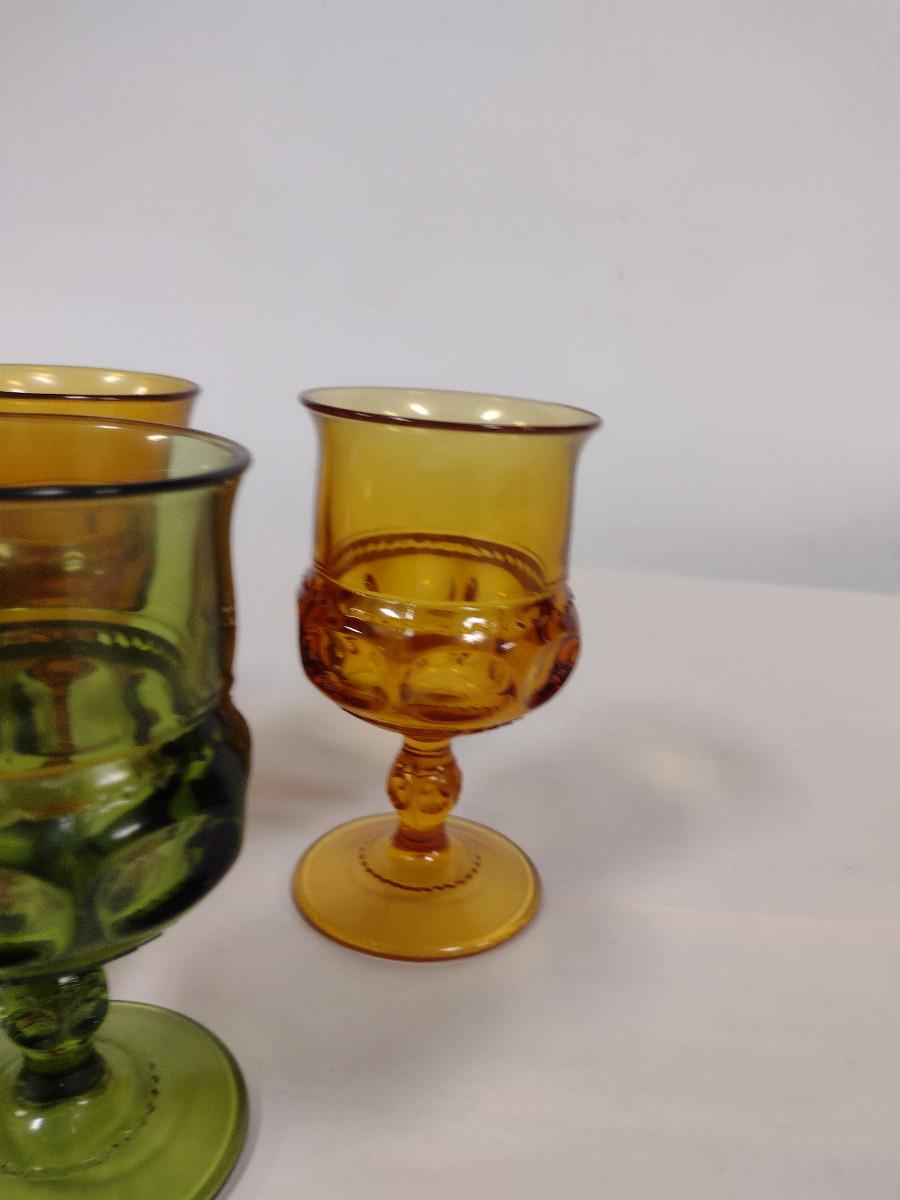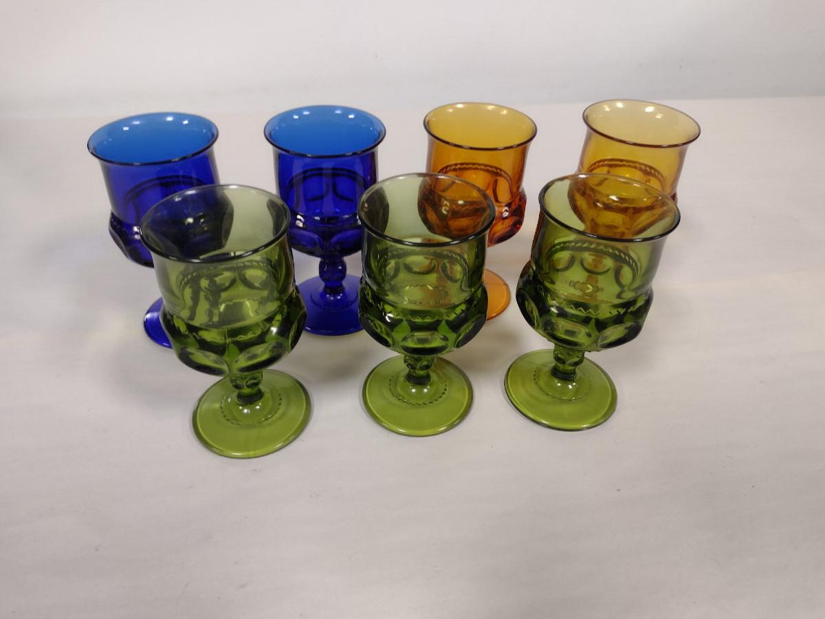 Assortment of Indiana Glass King's Crown Goblets- Cobalt, Amber, and Avocado Colored- 7 Pieces Total