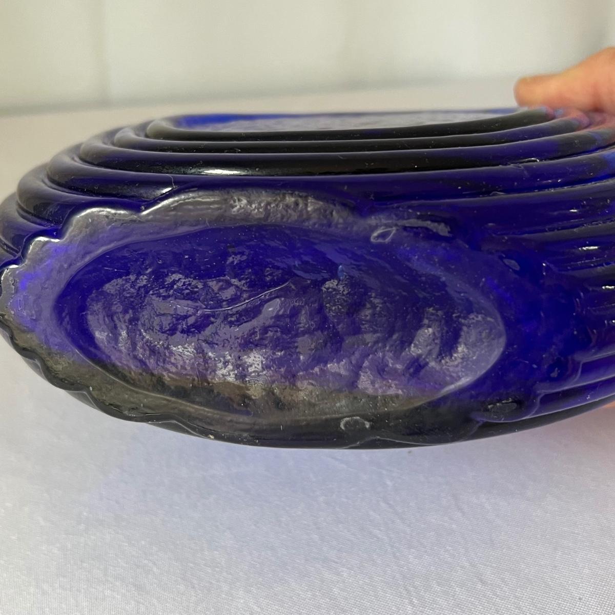 Blue decanter measures 8” x 2” x 12”H.