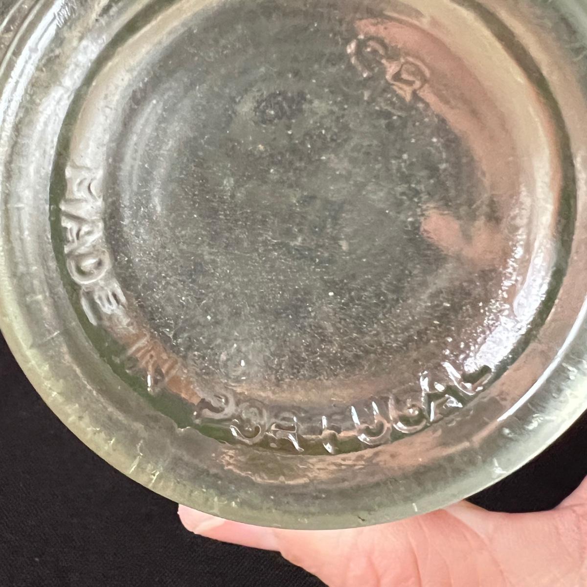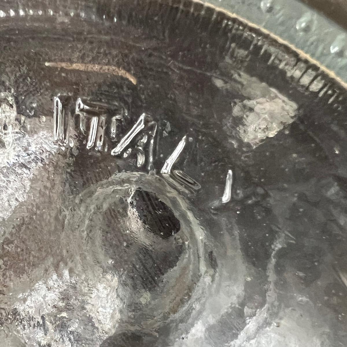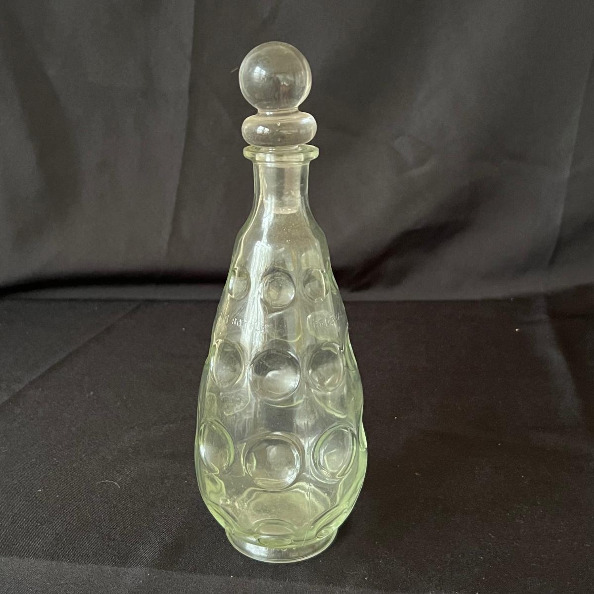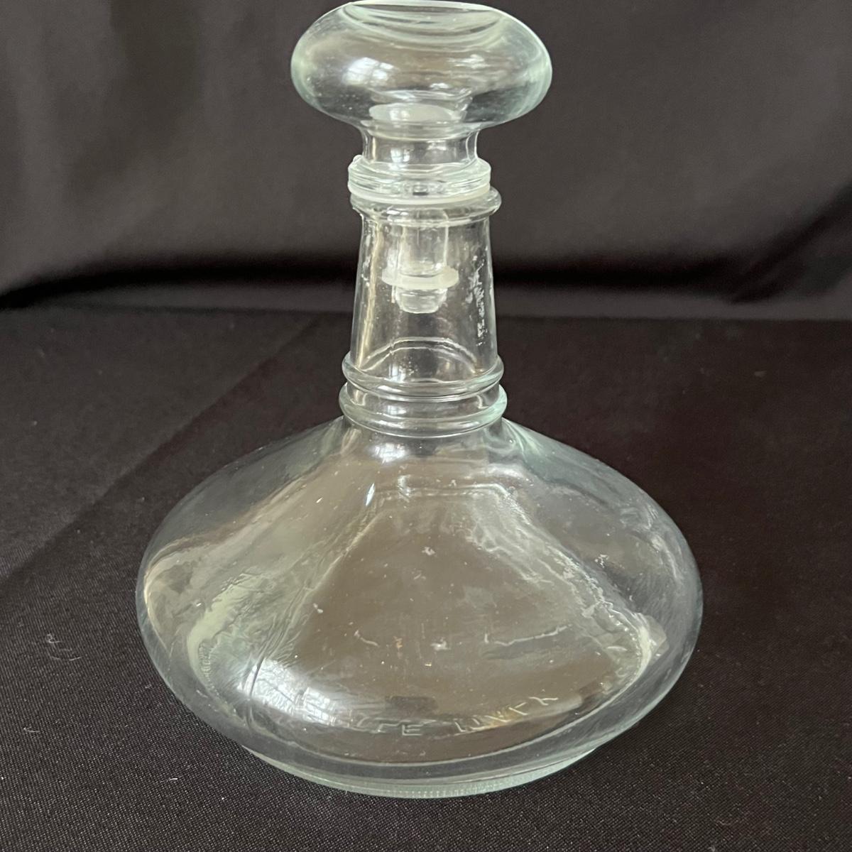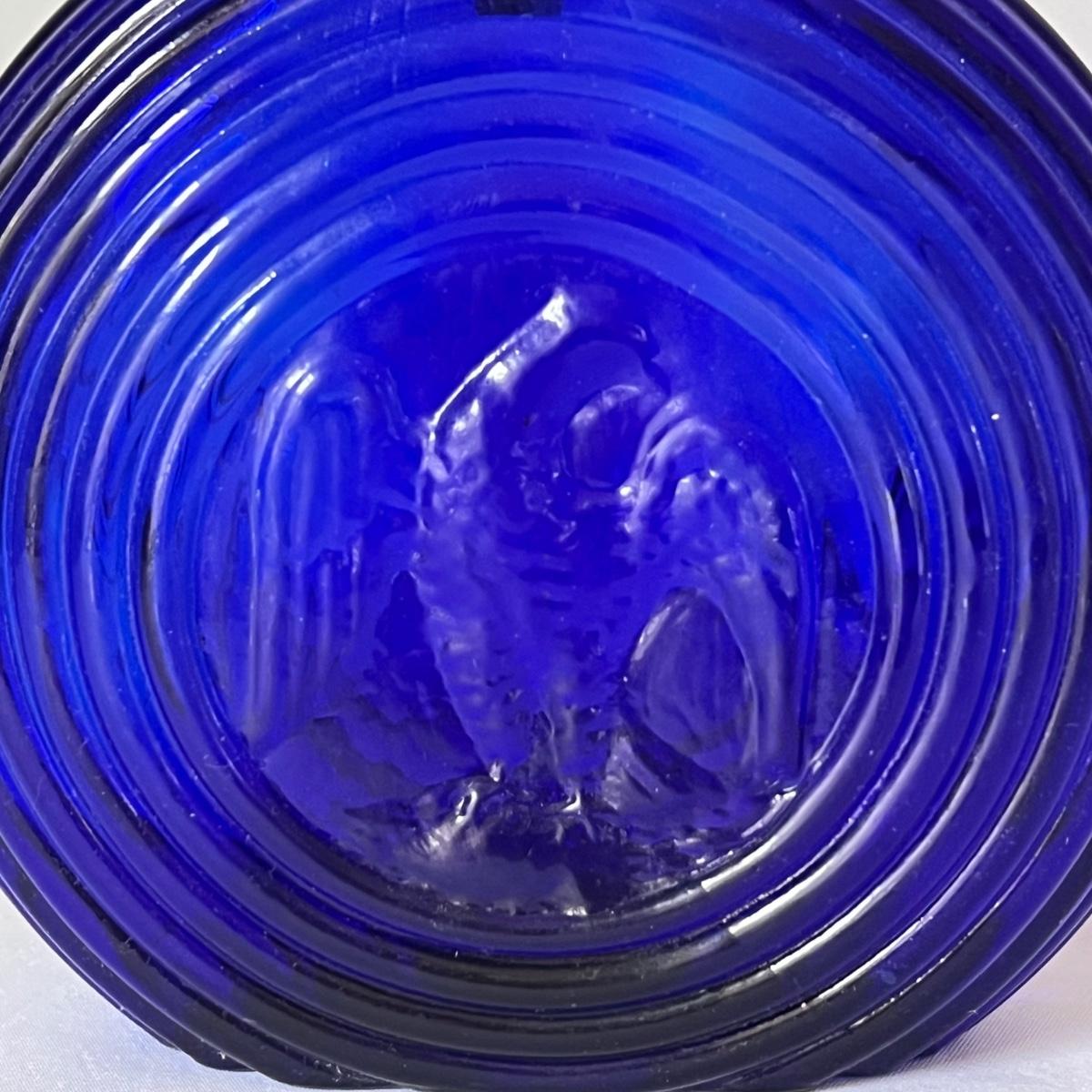 Three decanters includes clear glass ones from Italy and from Portugal. The cobalt blue decanter features a bald Eagle and no other markings. One decanter top with no bottle completes this lot. Bottles need cleaning and the blue bottle has sticker residue which should scrape off.