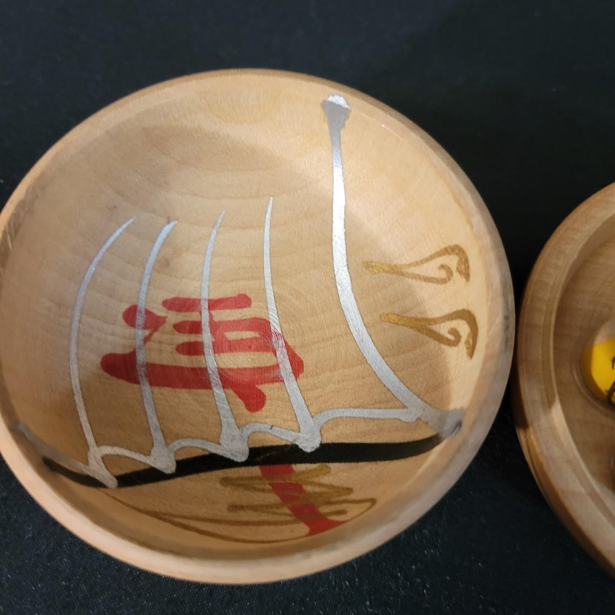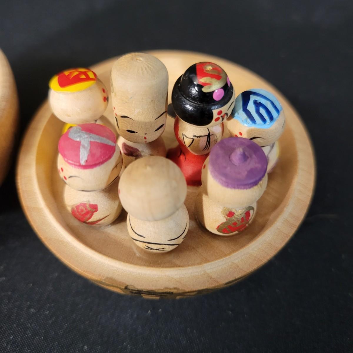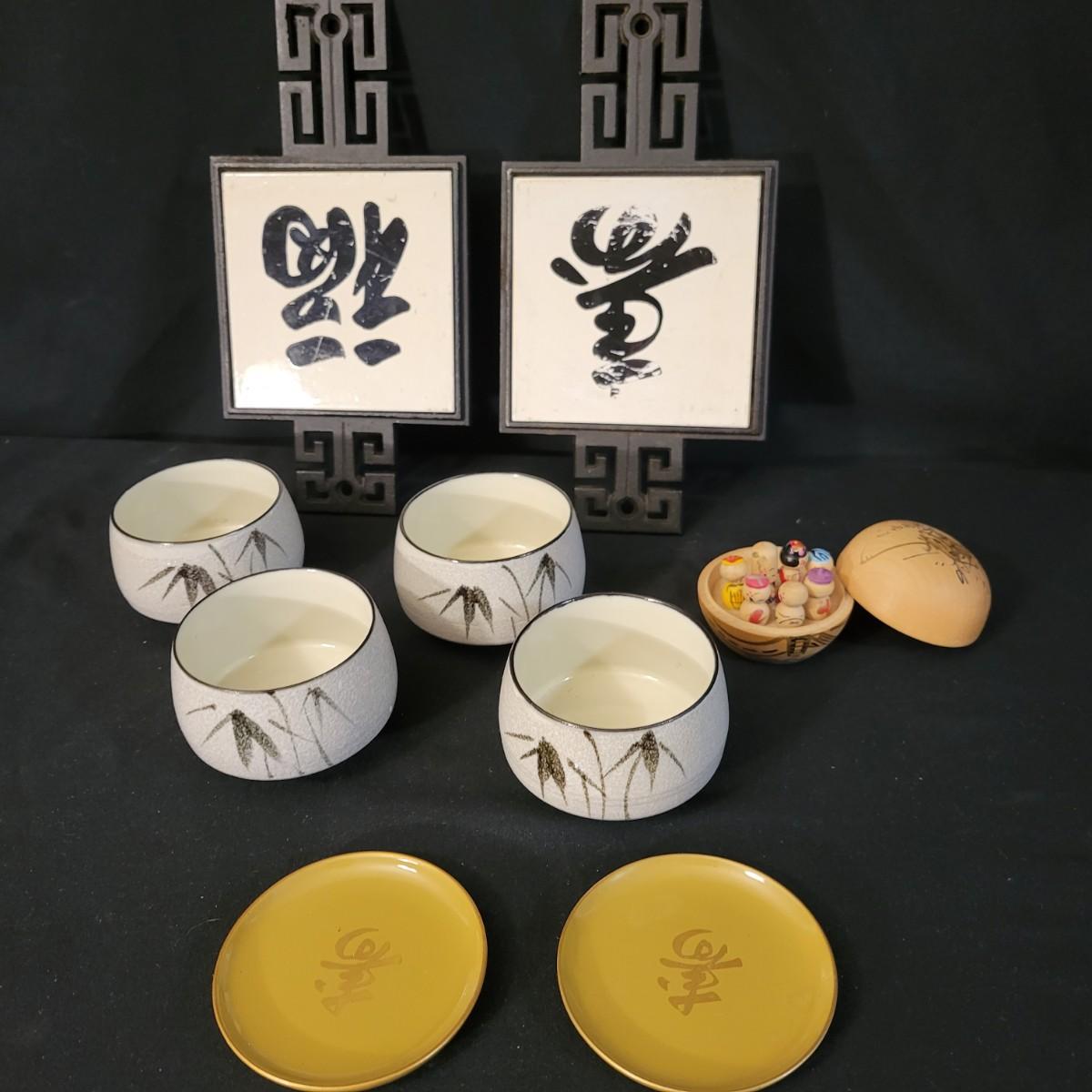 A collection of items manufactured in Japan that are in good condition with no notable damage. This lot includes four glazed ceramic tea cups, two Trivets with iron hangers, two small plates made of plastic and a small wooden ball that opens to reveal a small group of painted figurines. Trivets measure approximately 9.5" x 5" Shipping available