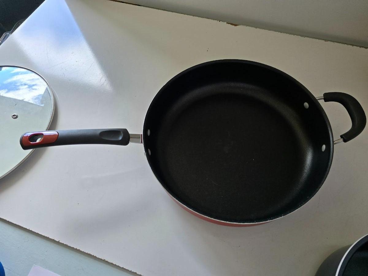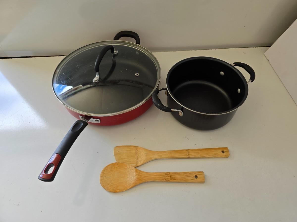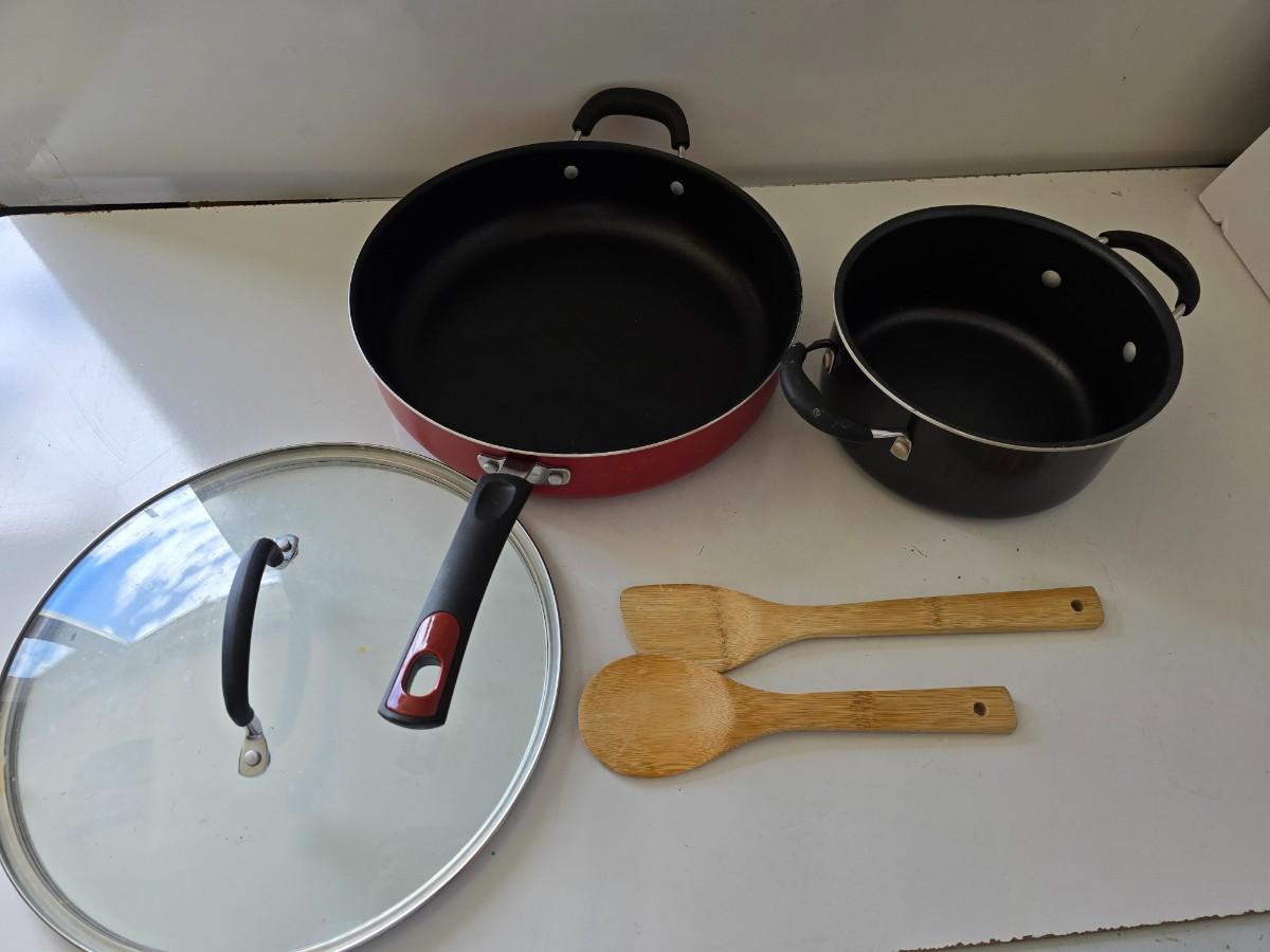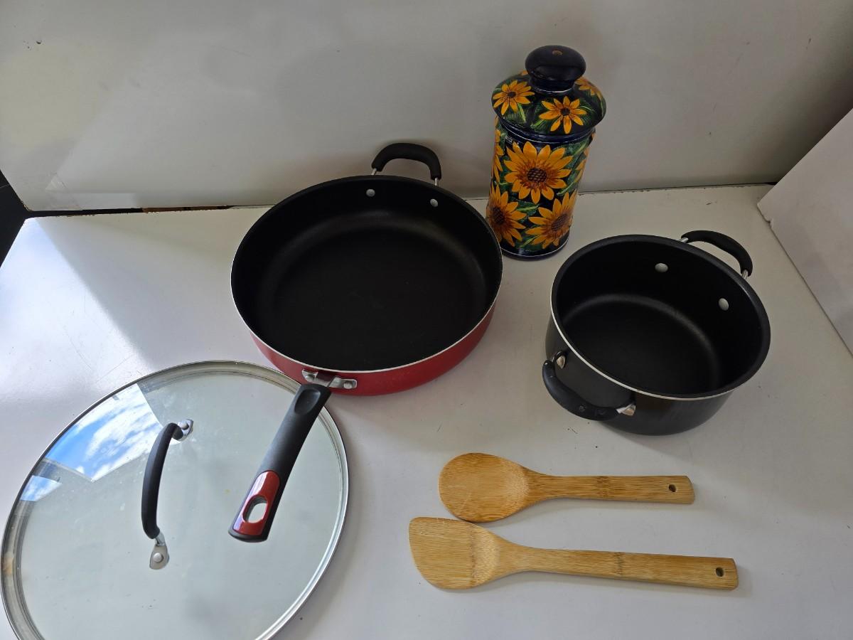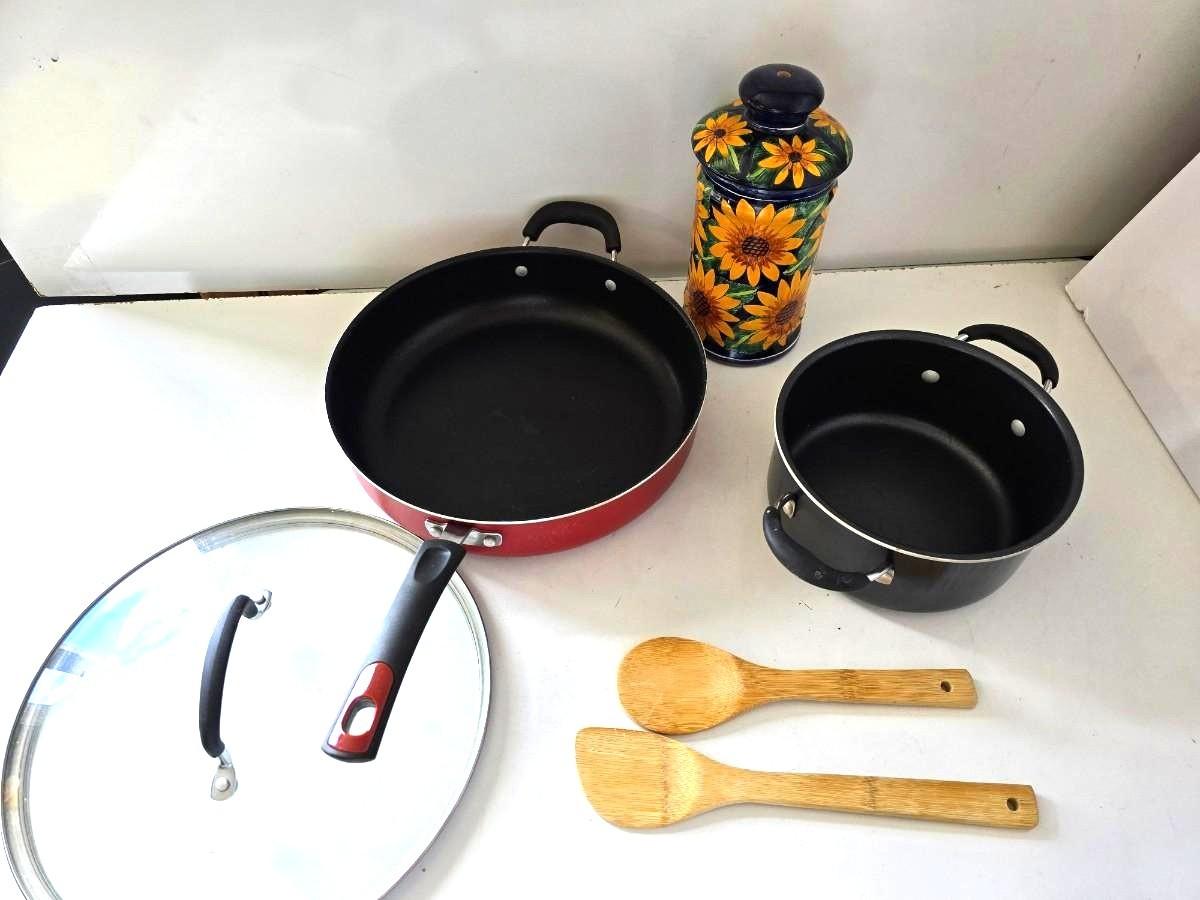 Kitchen Cookware & Utensil Lot – Nonstick Pans, Sunflower Jar