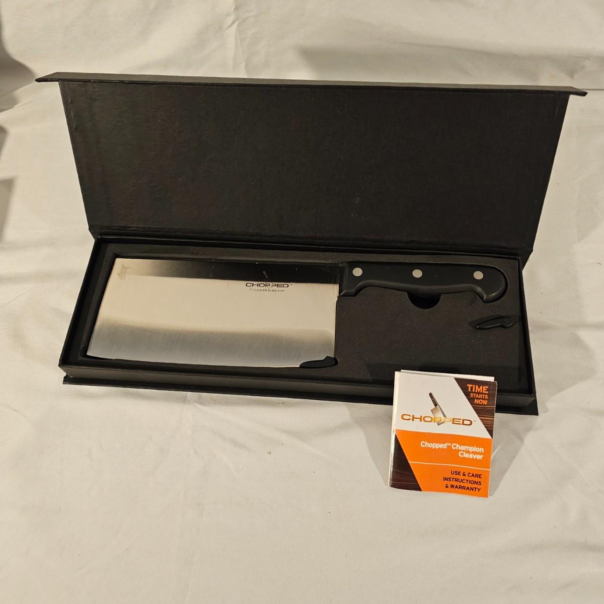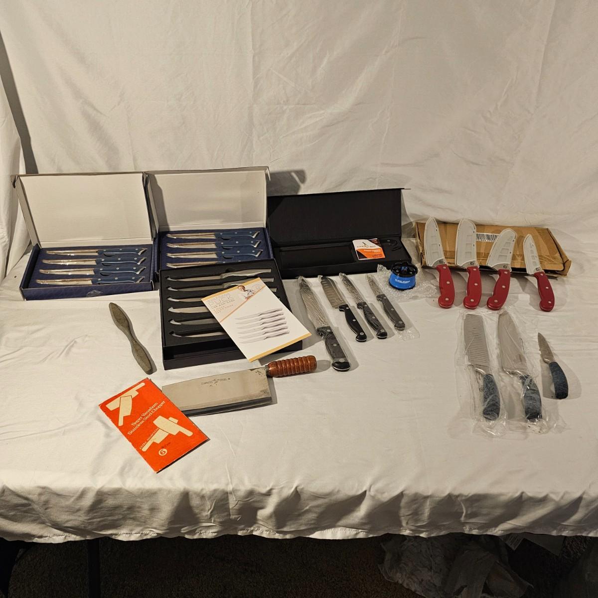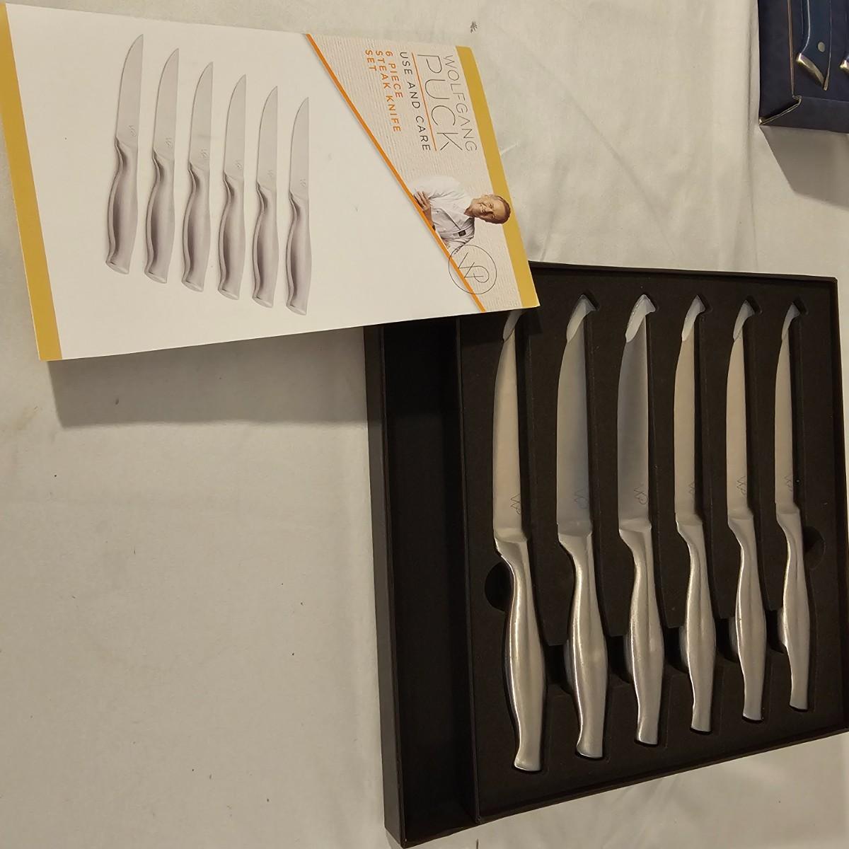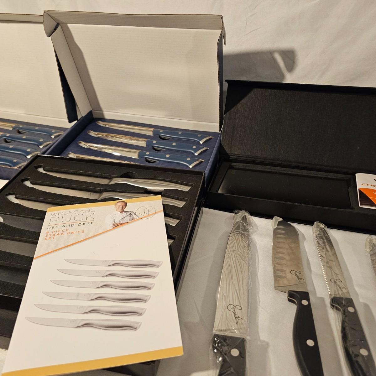 Knives, sharpeners, cleavers. Several different sizes and shapes by celebrity chefs. Items by Emeril, Wolfgang Puck and Zakarian. Large stainless cleaver measures 11" x 4". Blades on Knives run from 3.5" to 8" in length. Most items new in packages. See photos for inventory & details. Shipping available.