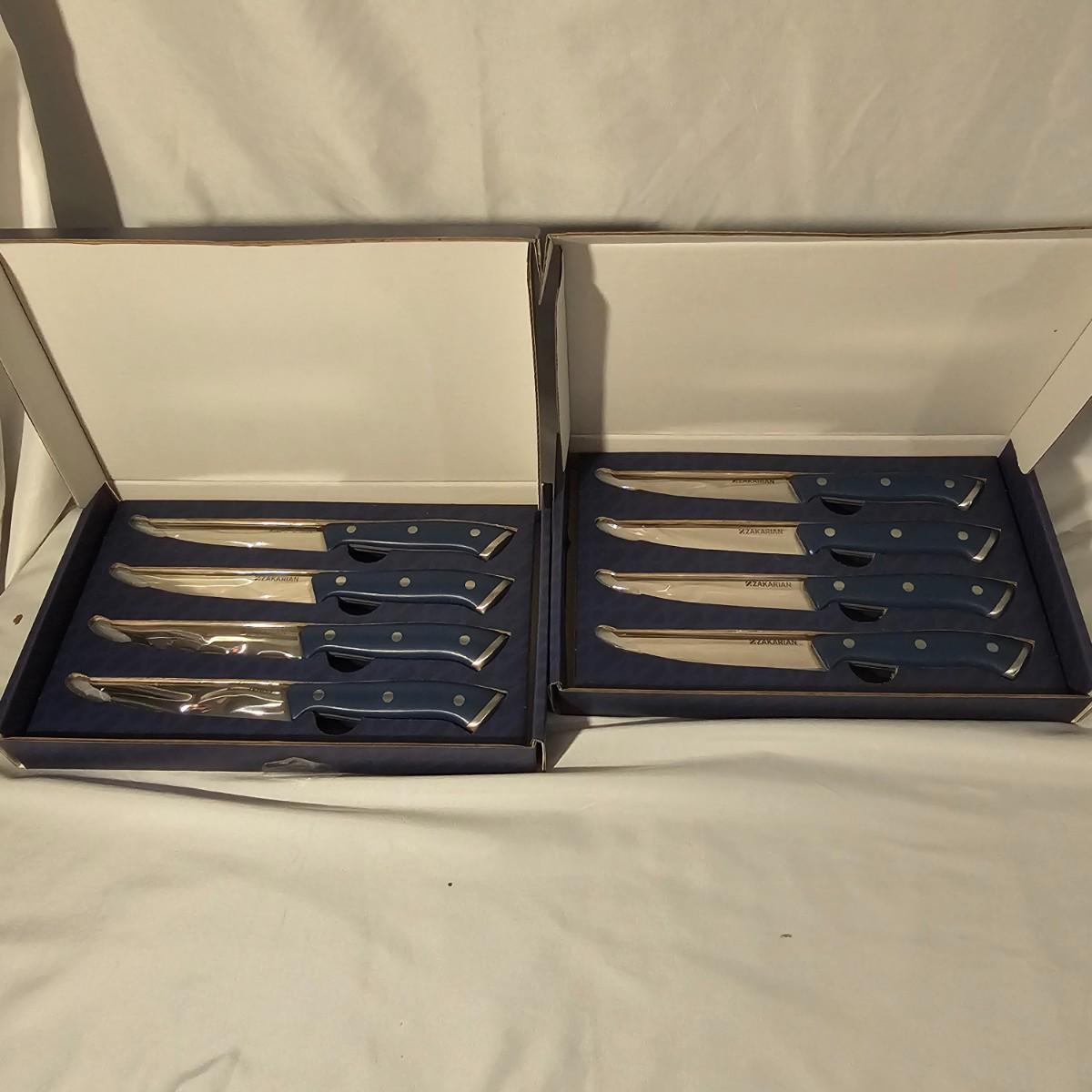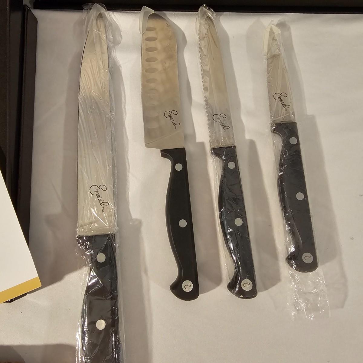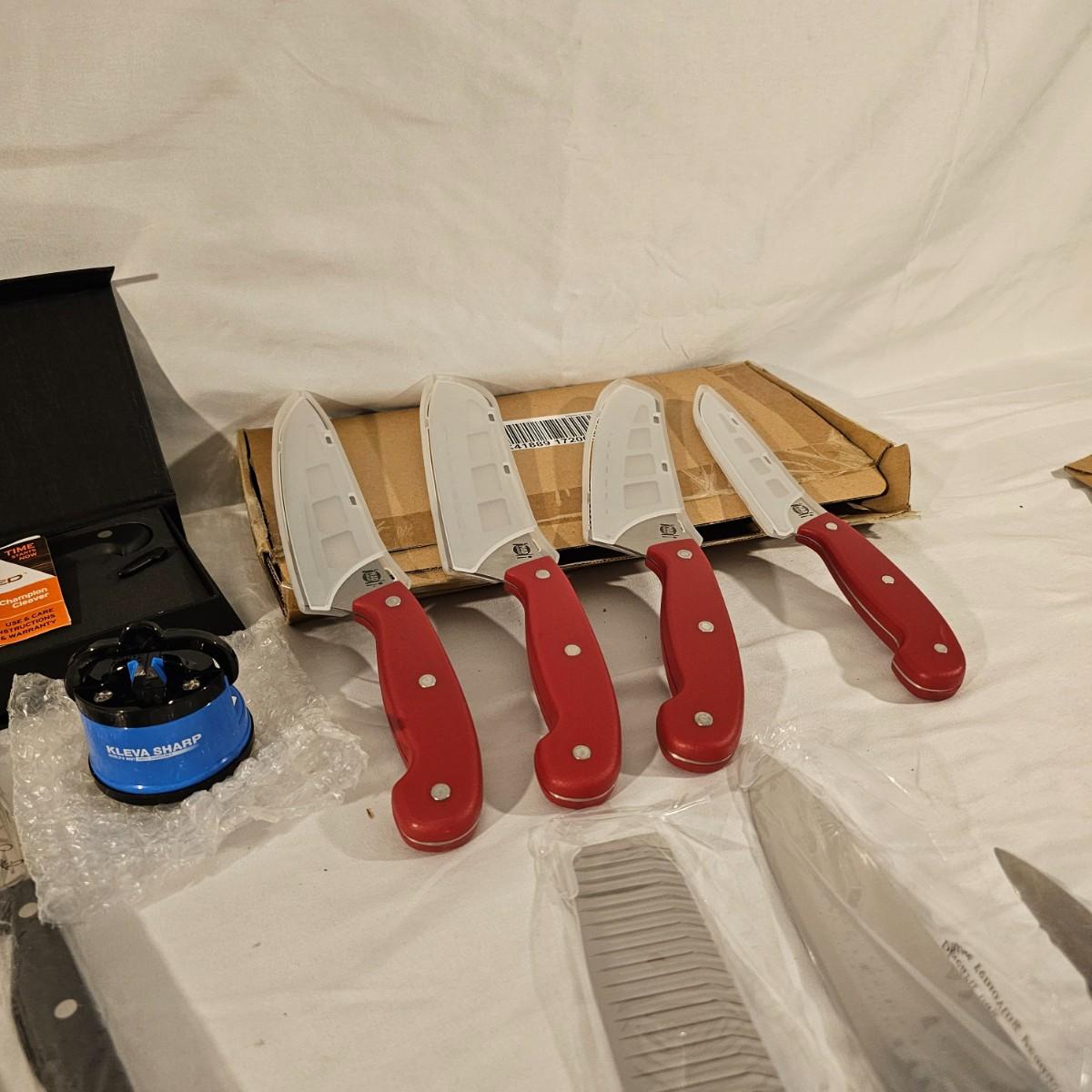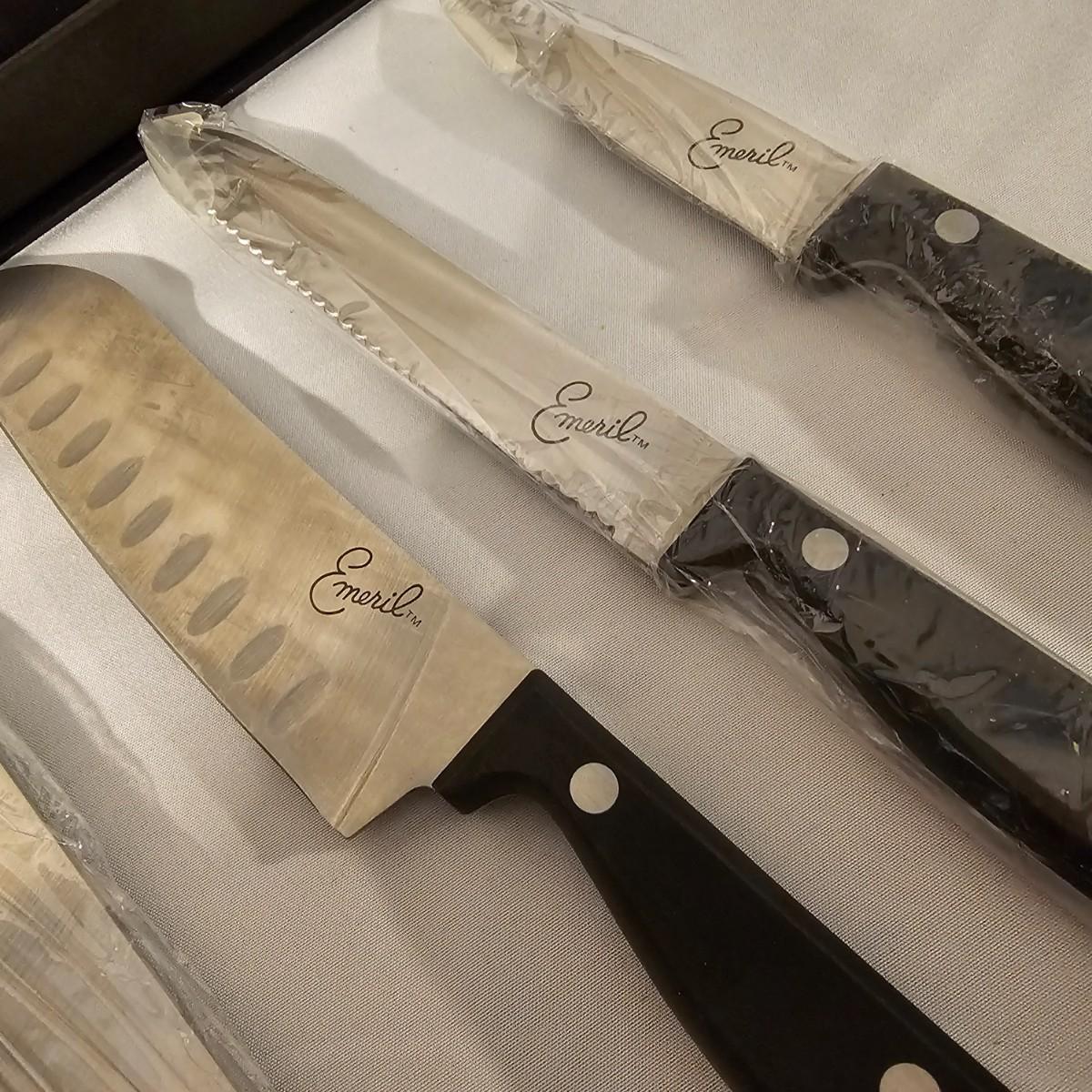 Knives, sharpeners, cleavers. Several different sizes and shapes by celebrity chefs. Items by Emeril, Wolfgang Puck and Zakarian. Large stainless cleaver measures 11" x 4". Blades on Knives run from 3.5" to 8" in length. Most items new in packages. See photos for inventory & details. Shipping available.