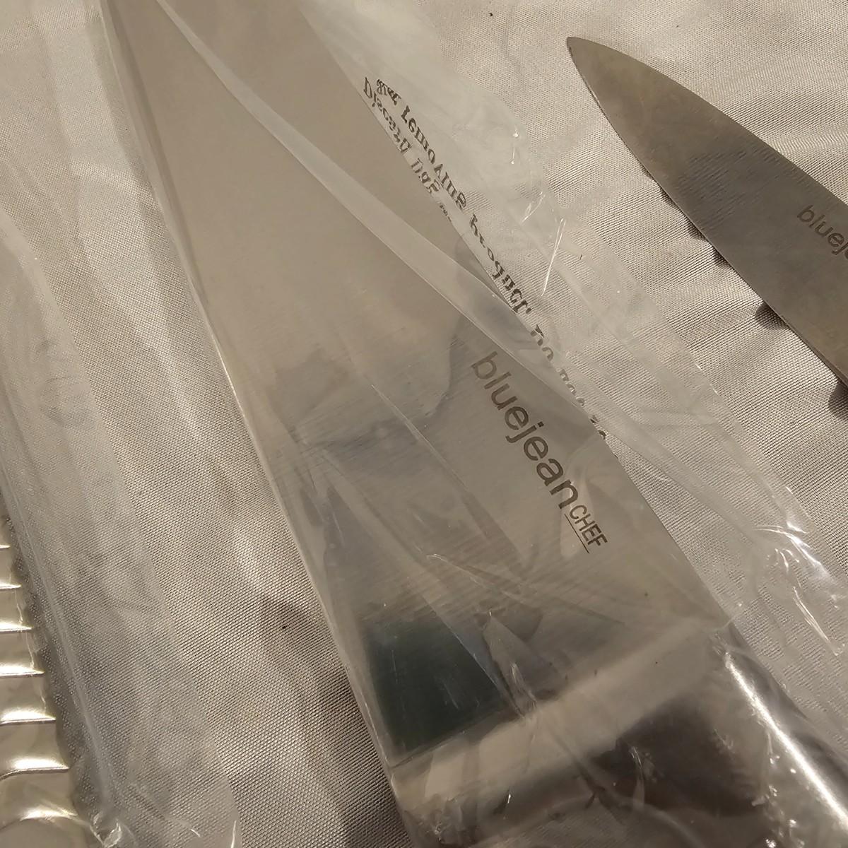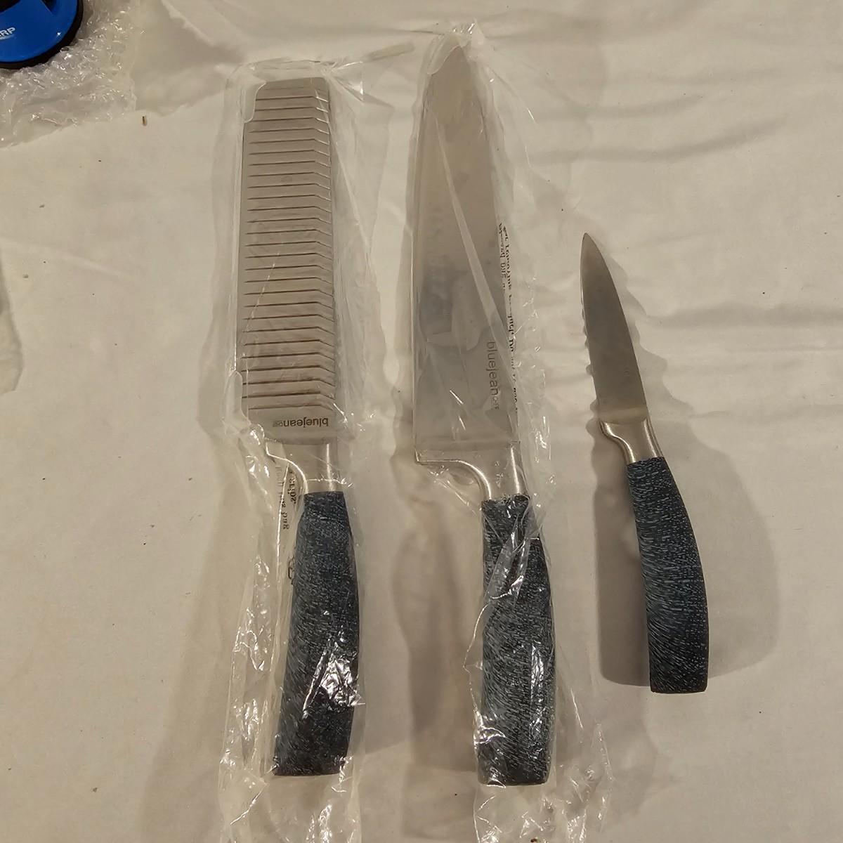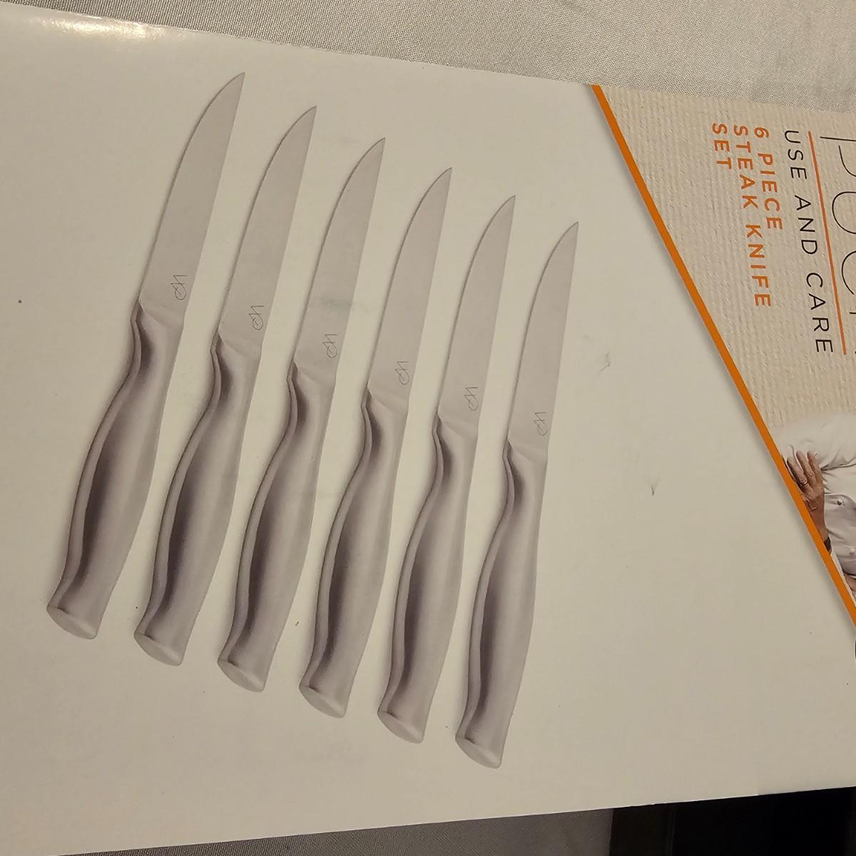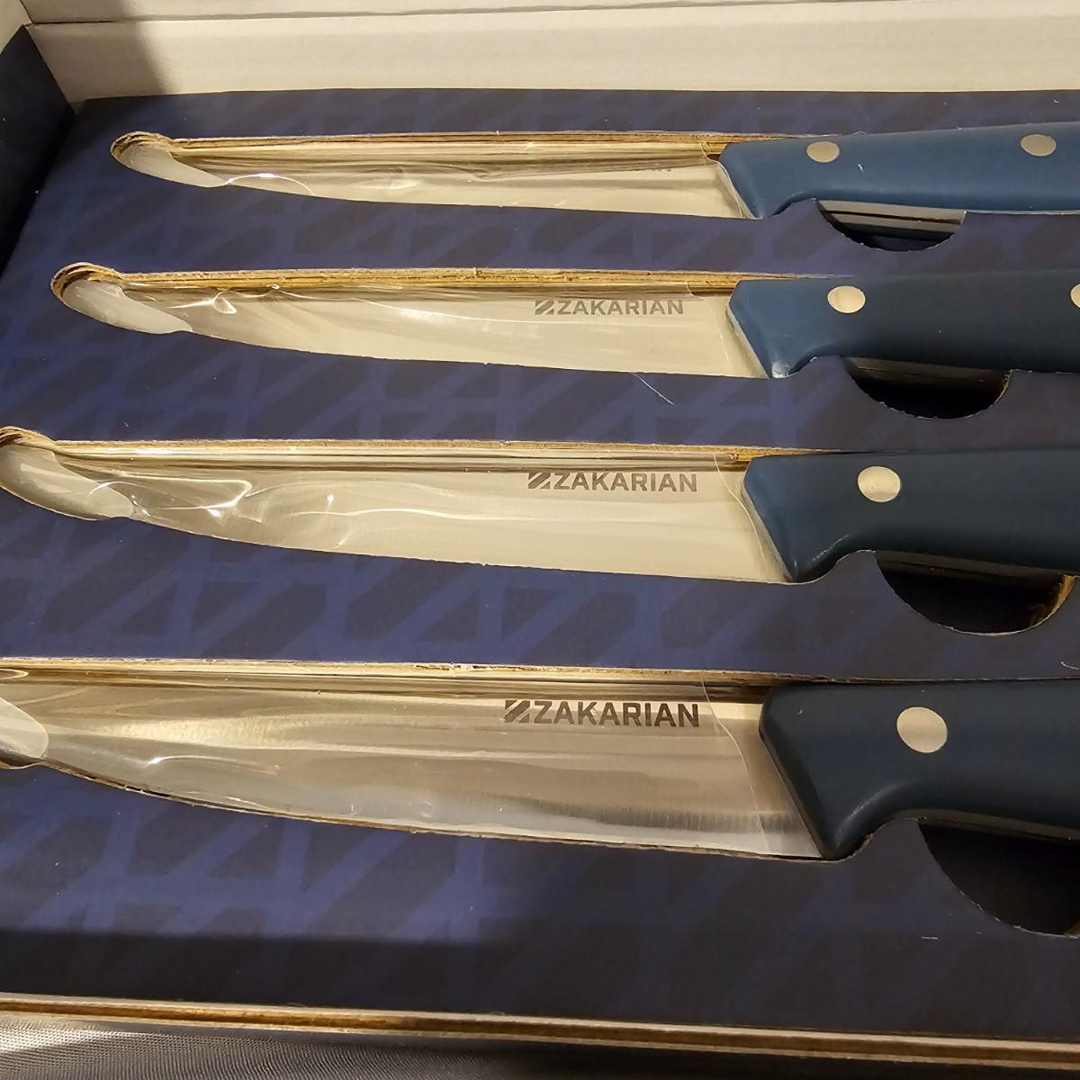 Knives, sharpeners, cleavers. Several different sizes and shapes by celebrity chefs. Items by Emeril, Wolfgang Puck and Zakarian. Large stainless cleaver measures 11" x 4". Blades on Knives run from 3.5" to 8" in length. Most items new in packages. See photos for inventory & details. Shipping available.