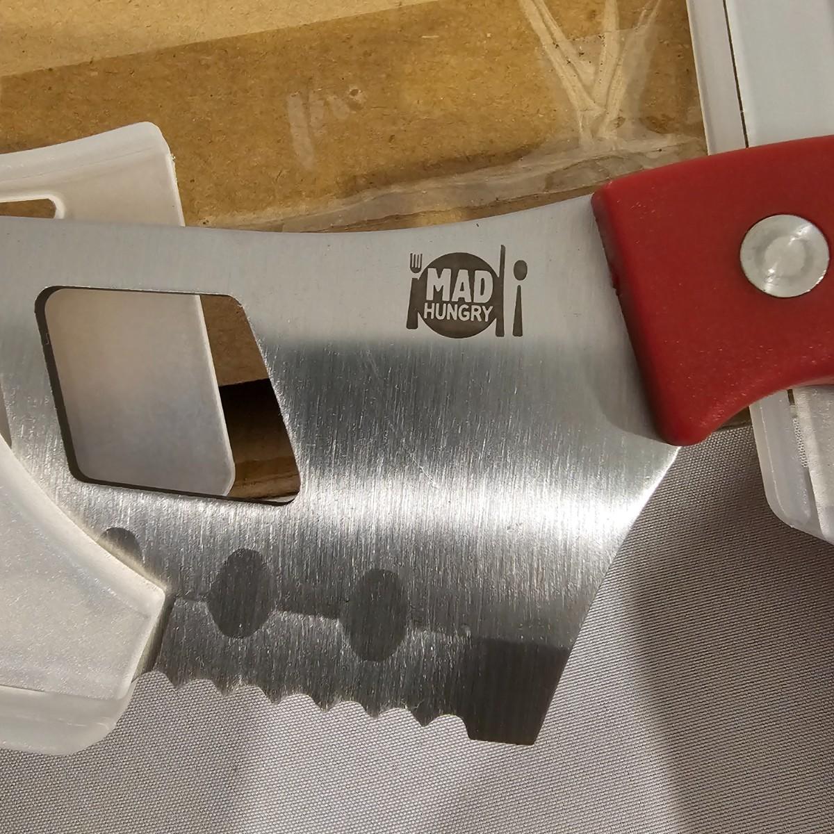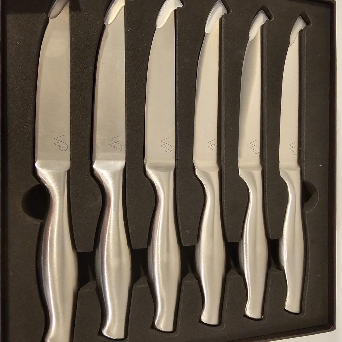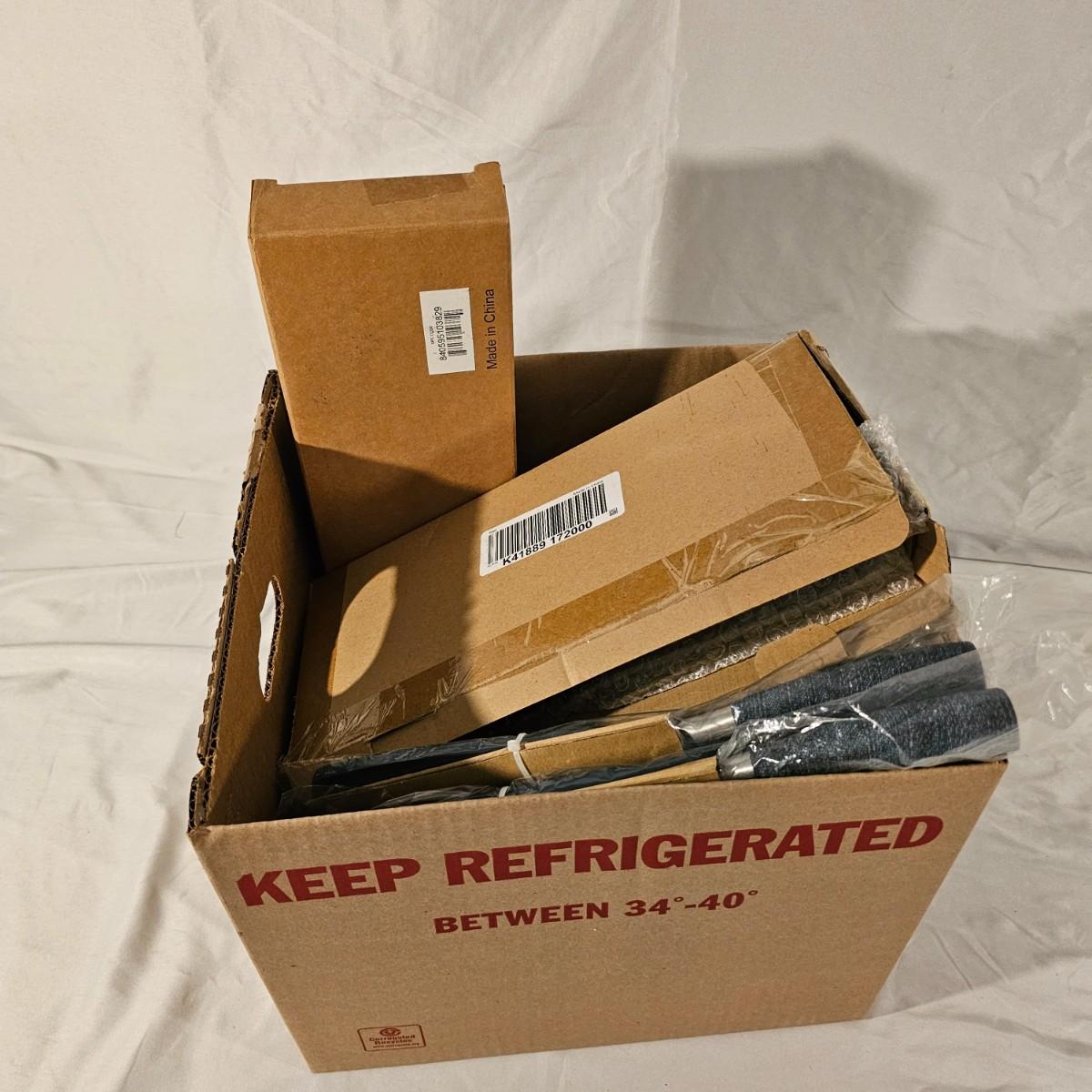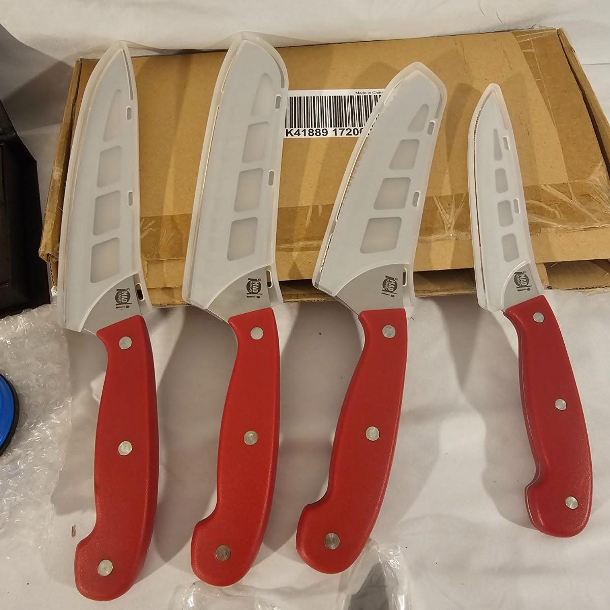 Knives, sharpeners, cleavers. Several different sizes and shapes by celebrity chefs. Items by Emeril, Wolfgang Puck and Zakarian. Large stainless cleaver measures 11" x 4". Blades on Knives run from 3.5" to 8" in length. Most items new in packages. See photos for inventory & details. Shipping available.