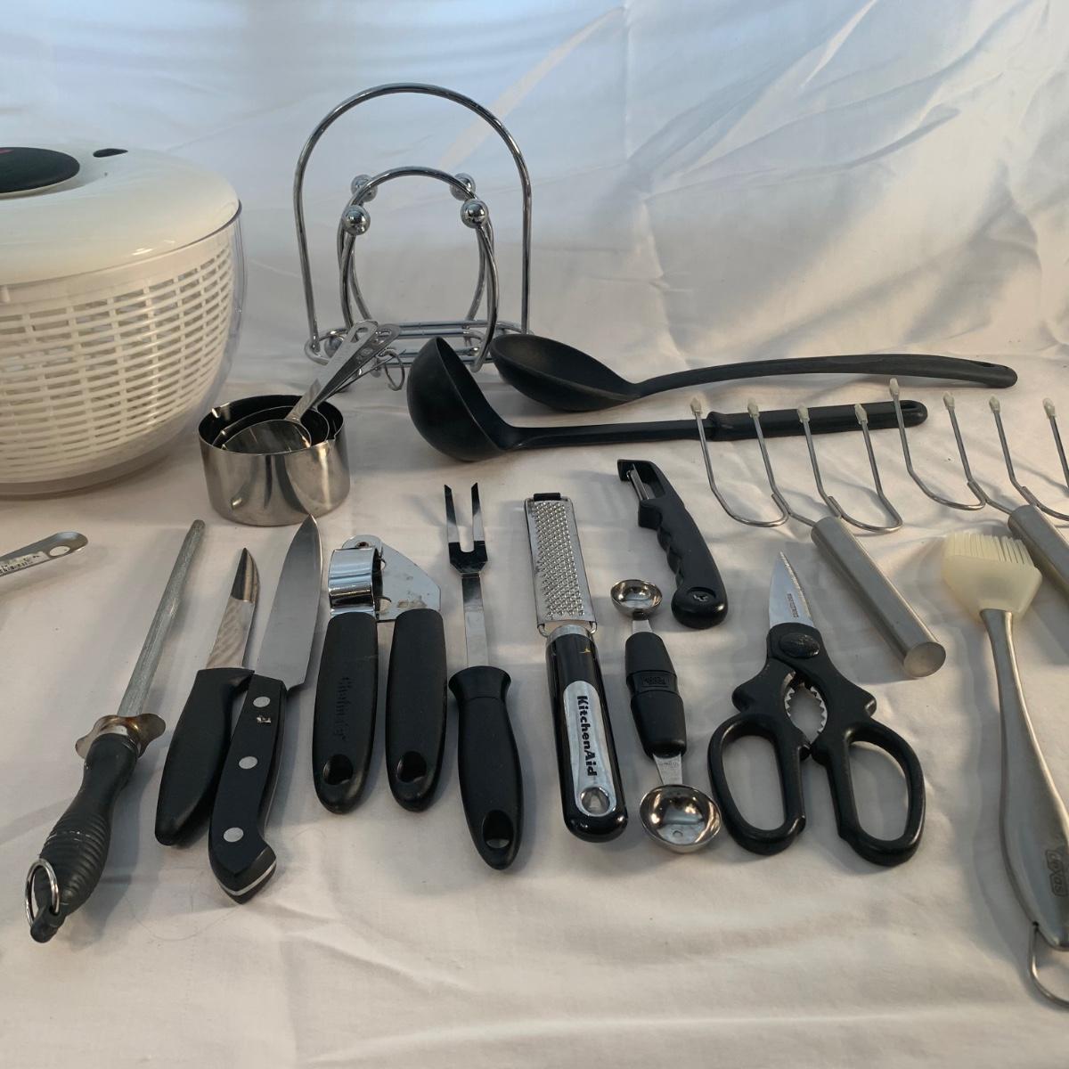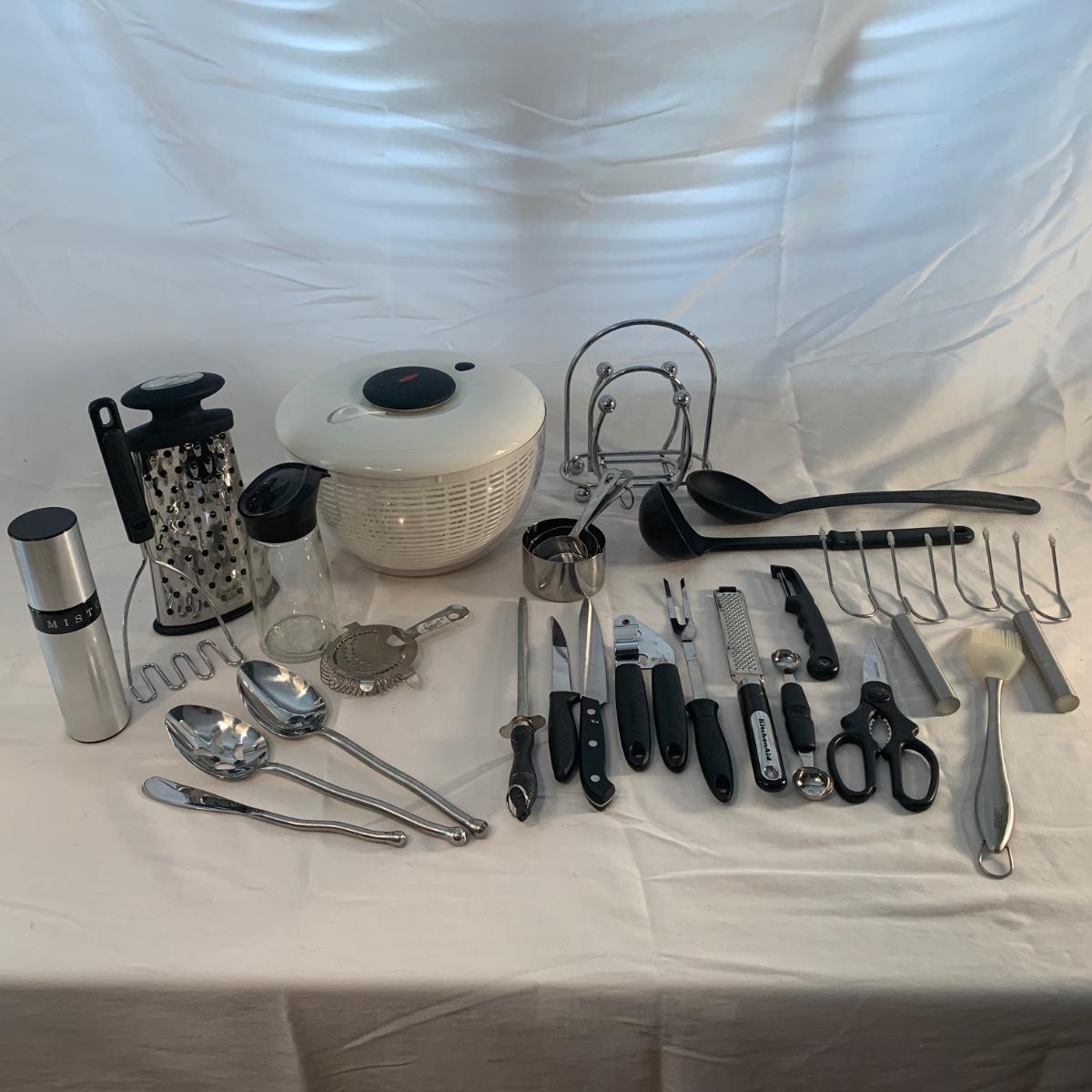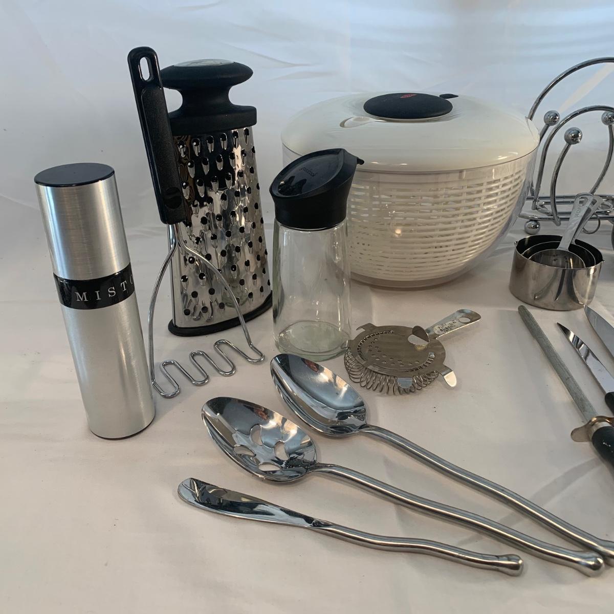 This lot includes a variety of kitchenwares. Includes a Ozo salad spinner, Misto Oil Mister, Kitchenaid lime zested, measuring cups, melon baller, metal serving spoons, plastic serving spoons, cocktail strainer, napkin holder, knife sharpener, cheese grater, potato masher, turkey lifters, and more!