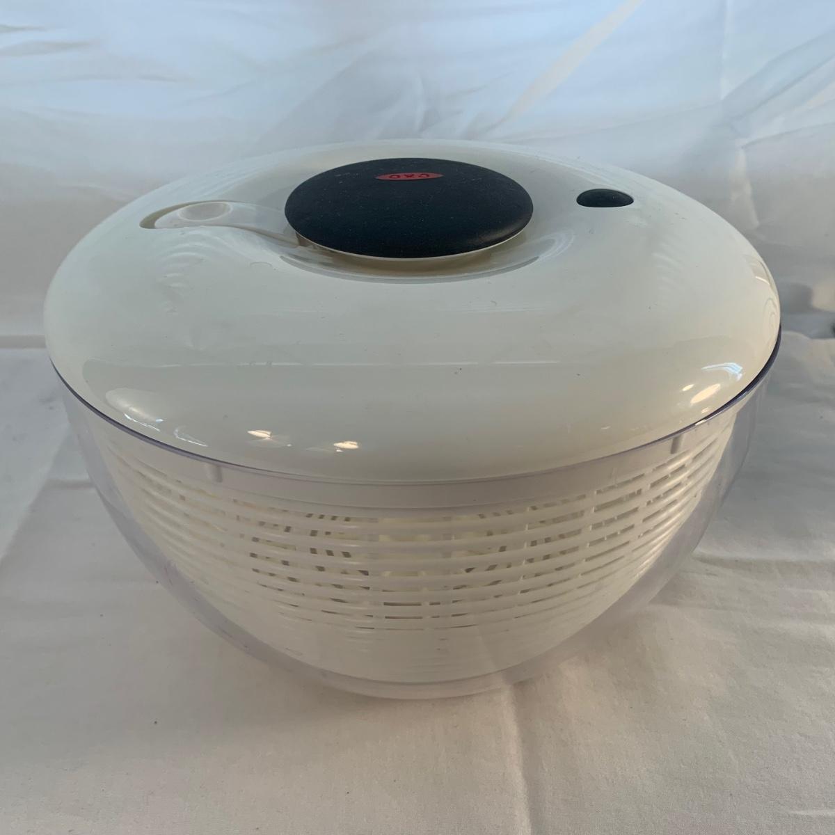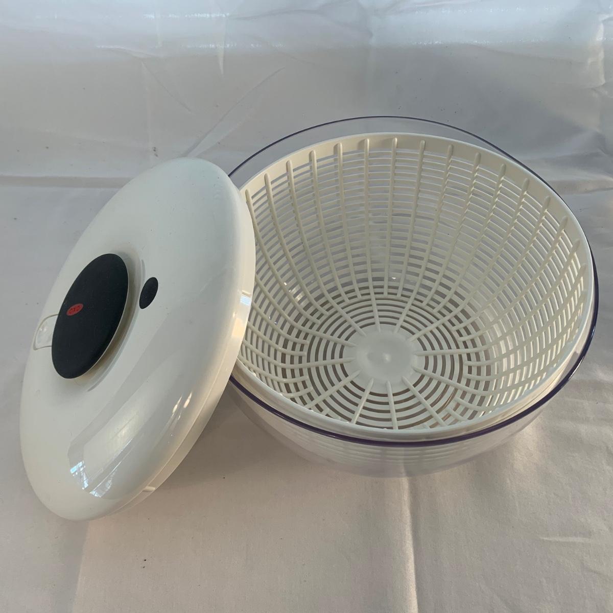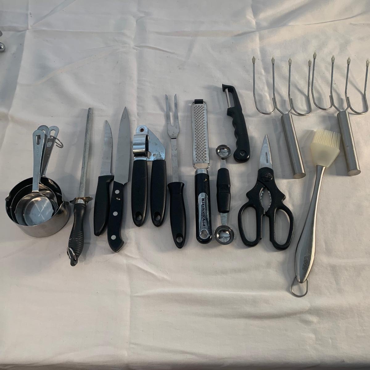This lot includes a variety of kitchenwares. Includes a Ozo salad spinner, Misto Oil Mister, Kitchenaid lime zested, measuring cups, melon baller, metal serving spoons, plastic serving spoons, cocktail strainer, napkin holder, knife sharpener, cheese grater, potato masher, turkey lifters, and more!