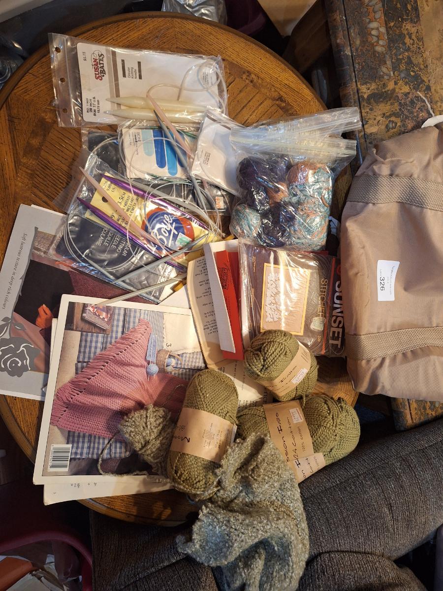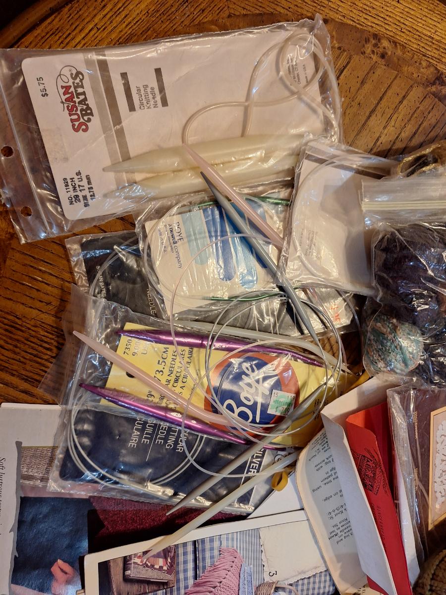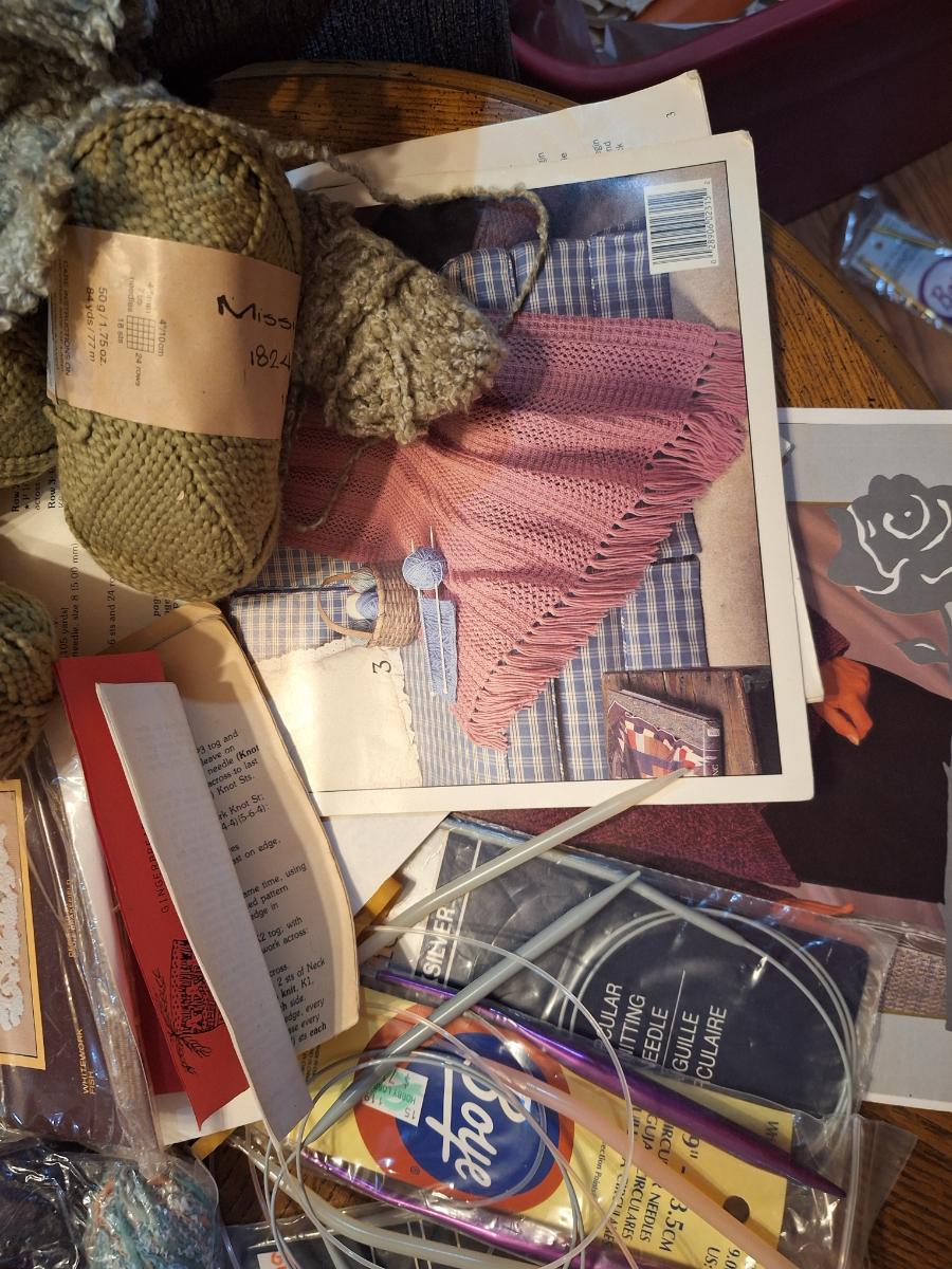 assortment of knitting or crocheting supplies, needles, little bit of yard and a few patterns